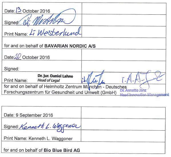 | (2) | Helmholtz Zentrum Munchen/GSF-Forschungszentrum fur Umwelt u. Gesundheit GmbH, Ingolstadter Landstr. 1, D-85764 Neuherberg, Deutschland ("GSF") (BAVARIAN NORDIC and GSF jointly referred to as "LICENSORS") and | |