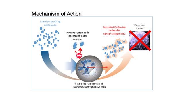 The Company’s live-cell encapsulation technology consists of encapsulating different types of genetically modified living cells depending on the disease being treated. For its leading product candidate, a therapy for pancreatic cancer, about 10,000 genetically modified live cells that produce an enzyme, which converts the chemotherapy prodrug ifosfamide into its cancer-killing form, are encapsulated in porous, pinhead-sized capsules. About 300 of these capsules are placed in the blood supply as close to the pancreatic tumor as possible, and then one-third the normal dose of the chemotherapy drug is given to the patient intravenously. The prodrug is normally activated in the patient’s liver. By activating the prodrug near the tumor using the Cell-in-a-Box® capsules, the Company’s cellular therapy acts as a type of “artificial liver.” Using this “targeted chemotherapy,” the Company is seeking to create an environment that enables optimal concentrations of the “cancer-killing” form of ifosfamide at the site of the tumor. Because the cancer-killing form of ifosfamide has a short half-life, we believe it results in little to no collateral damage to other organs in the body. We believe this treatment significantly reduces tumor size with no treatment-related side effects.