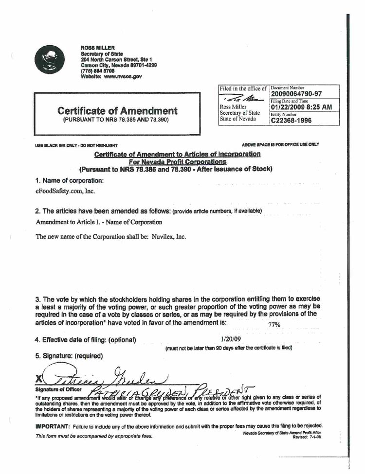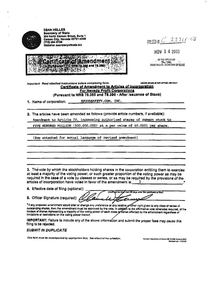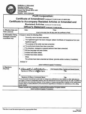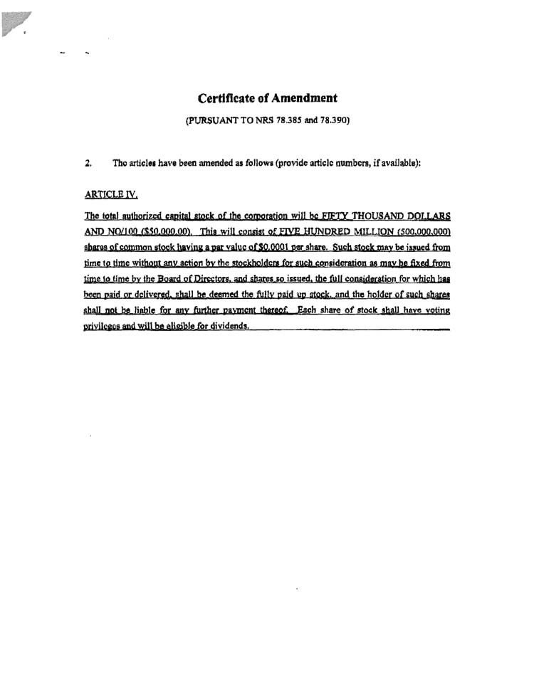| 4. | This Certificate of Amendment shall be effective upon filing with the Secretary of State of the State of Nevada. |