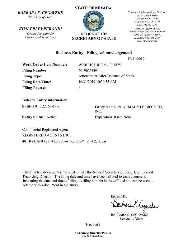 Business Entity - Filing Acknowledgement 10/31/2019 Work Order Item Number: Filing Number: Filing Type: Filing Date/Time: Filing Page(s): W2019103101299 - 203475 20190257391 Amendment After Issuance of Stock 10/31/2019 10:30:35 AM 5 Indexed Entity Information: Entity ID: C22368 - 1996 Entity Status: Active Entity Name: PHARMACYTE BIOTECH, INC. Expiration Date: None Commercial Registered Agent REGISTERED AGENTS INC. 401 RYLAND ST STE 200 - A, Reno, NV 89502, USA BARBARA K. CEGAVSKE Secretary of State KIMBERLEY PERONDI Deputy Secretary for Commercial Recordings STATE OF NEVADA OFFICE OF THE SECRETARY OF STATE Commercial Recordings Division 202 N. Carson Street Carson City, NV 89701 Telephone (775) 684 - 5708 Fax (775) 684 - 7138 North Las Vegas City Hall 2250 Las Vegas Blvd North, Suite 400 North Las Vegas, NV 89030 Telephone (702) 486 - 2880 Fax (702) 486 - 2888 The attached document(s) were filed with the Nevada Secretary of State, Commercial Recording Division. The filing date and time have been affixed to each document, indicating the date and time of filing. A filing number is also affixed and can be used to reference this document in the future. Respectfully, BARBARA K. CEGAVSKE Secretary of State Page 1 of 1 Commercial Recording Division 202 N. Carson Street