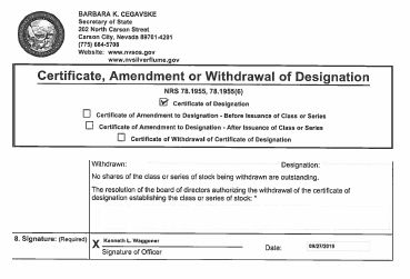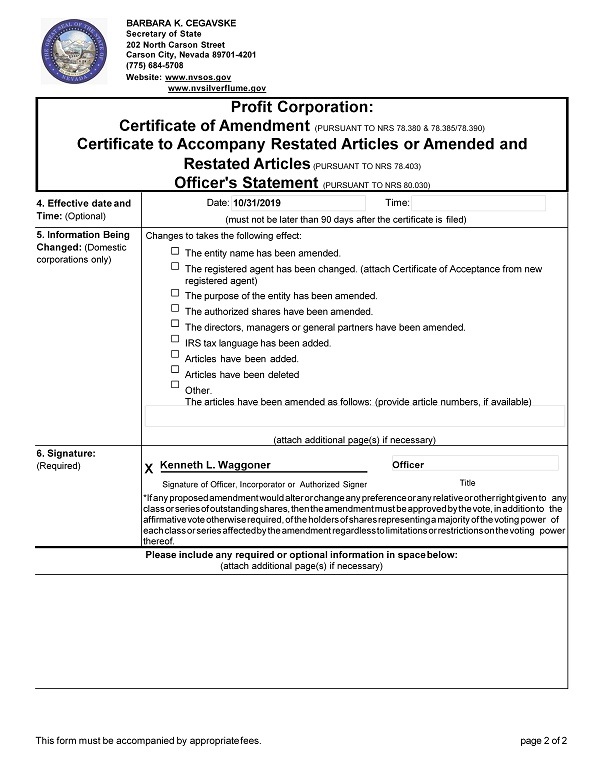 4. Effective date and Time: (Optional) Date: 10/31/2019 Time: (must not be later than 90 days after the certificate is filed) 5. Information Being Changed: (Domestic corporations only) Changes to takes the following effect: The entity name has been amended. The registered agent has been changed. (attach Certificate of Acceptance from new registered agent) The purpose of the entity has been amended. The authorized shares have been amended. The directors, managers or general partners have been amended. IRS tax language has been added. Articles have been added . Articles have been deleted Other . The articles have been amended as follows : (provide article numbers, if available) (attach additional page(s) if necessary) 6. Signature: (Required) X Kenneth L. Waggoner Officer Signature of Officer, Incorporator or Authorized Signer Title *If any proposed amendment would alter or change any preference or any relative or other right given to any class or series of outstanding shares, then the amendment must be approved by the vote, in addition to the affirmative vote otherwise required, of the holders of shares representing a majority of the voting power of each class or series affected by the amendment regardless to limitations or restrictions on the voting power thereof. Please include any required or optional information in space below: (attach additional page(s) if necessary) BARBARA K. CEGAVSKE Secretary of State 202 North Carson Street Carson City, Nevada 89701 - 4201 (775) 684 - 5708 Website: www.nvsos.gov www.nvsilverflume.gov Profit Corporation: Certificate of Amendment (PURSUANT TO NRS 78.380 & 78.385/78.390) Certificate to Accompany Restated Articles or Amended and Restated Articles (PURSUANT TO NRS 78.403) Officer's Statement (PURSUANT TO NRS 80.030) This form must be accompanied by appropriate fees. page 2 of 2