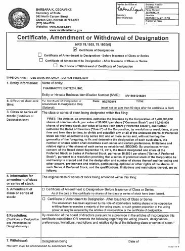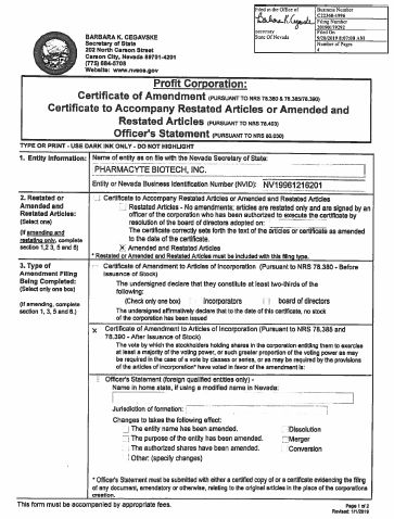 1. Entity information Name of entity as on file with the Nevada Secretary of State : PHARMACYTE BIOTECH, INC. Entity or Nevada Business Identification Number (NVID) : NV19961216201 2. Restated or Amended and Restated Articles Certificate to Accompany Restated Articles or Amended and Restated Articles Restated Articles - No amendments; articles are restated only and are signed by an officer of the corporation who has been authorized to execute the certificate by resolution of the board of directors adopted on: The certificate correctly sets forth the text of the articles or certificate as amended to the date of the certificate. Amended and Restated Articles * Restated or Amended and Restated Articles must be included with this filing type. (Select one): (If amending and restating only, complete section 1, 2 and 6.) 3. Type of amendment filing being completed: Certificate of Amendment to Articles of Incorporation (Pursuant to NRS 78.380 - Before Issuance of Stock) The undersigned declare that they constitute at least two - thirds of the following: (Check only one box) incorporators board of directors The undersigned affirmatively declare that to the date of this certificate, no stock of the corporation has been issued (Select only one box): (If amending, complete section 1,3,5 and 6.) Certificate of Amendment to Articles of Incorporation (Pursuant to NRS 78.385 and 78.390 - After Issuance of Stock) The vote by which the stockholders holding shares in the corporation entitling them to exercise at least a majority of the voting power, or such greater proportion of the voting power as may be required in the case of a vote by classes or series, or as may be required by the provisions of the articles of incorporation* have voted in favor of the amendment is: Officer's Statement (foreign qualified entities only) - Name in home state, if using a modified name in Nevada: Jurisdiction of formation: Changes to takes the following effect: The entity name has been amended. Dissolution The purpose of the entity has been amended. Merger The authorized shares have been amended. Conversion Other: (specify changes) * Officer's Statement must be submitted with either a certified copy of or a certificate evidencing the filing of any document, amendatory or otherwise, relating to the original articles in the place of the corporations creation. BARBARA K. CEGAVSKE Secretary of State 202 North Carson Street Carson City, Nevada 89701 - 4201 (775) 684 - 5708 Website: www.nvsos.gov www.nvsilverflume.gov Profit Corporation: Certificate of Amendment (PURSUANT TO NRS 78.380 & 78.385/78.390) Certificate to Accompany Restated Articles or Amended and Restated Articles (PURSUANT TO NRS 78.403) Officer's Statement (PURSUANT TO NRS 80.030) TYPE OR PRINT - USE DARK INK ONLY - DO NOT HIGHLIGHT Filed in the Office of Secretary of State State Of Nevada Business Number C22368 - 1996 Filing Number 20190257391 Filed On 10/31/2019 10:30:35 AM Number of Pages 5 This form must be accompanied by appropriate fees. page 1 of 2