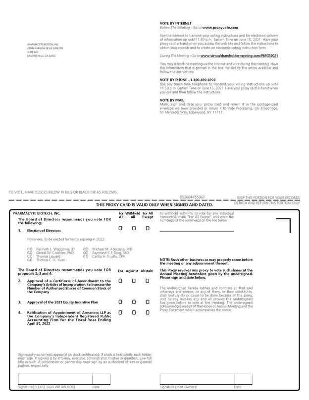 Notice is hereby given that the 2021 Annual Meeting of Stockholders (the “Annual Meeting”) of PharmaCyte Biotech, Inc. (“PharmaCyte” or the “Company”), will be held virtually at https://www.virtualshareholdermeeting.com/PMCB2021 on Wednesday, June 16, 2021 at 11:00 a.m., Pacific Daylight Time, for the following purposes: