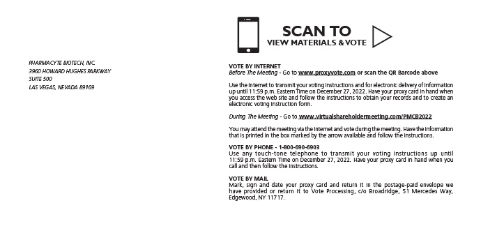 Details regarding the meeting, the business to be conducted at the meeting, and information about PharmaCyte that you should consider when you vote your shares are described in the accompanying proxy statement.