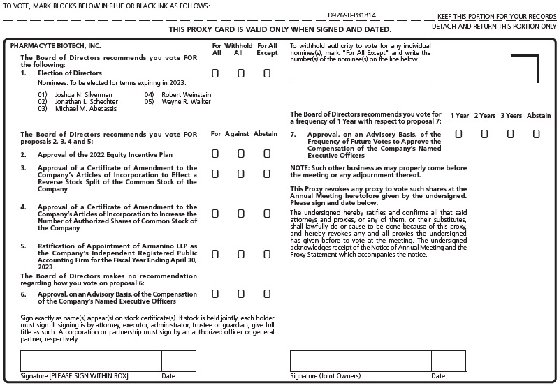 Additionally, you can find a copy of our Annual Report on Form 10-K, which includes our financial statements for the fiscal year ended April 30, 2022, on the website of the Securities and Exchange Commission, or the SEC, at www.sec.gov, or in the “SEC Filings” section of the “Investors” section of our website at ir.pharmacyte.com. You may also obtain a printed copy of our Annual Report on Form 10-K, including our financial statements, free of charge, from us by sending a written request to: Interim President, PharmaCyte Biotech, Inc., 3960 Howard Hughes Parkway, Suite 500, Las Vegas, Nevada 89169. Exhibits will be provided upon written request and payment of an appropriate processing fee.