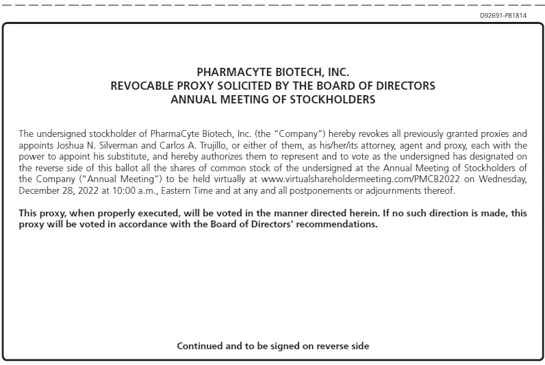 This proxy statement, along with the accompanying notice of 2022 annual meeting of stockholders, contains information about the 2022 annual meeting of stockholders of PharmaCyte Biotech, Inc. including any adjournments or postponements of the annual meeting. We are holding the annual meeting at 10:00 a.m. EST on Wednesday, December 28, 2022. You will be able to attend the annual meeting, vote and submit your questions during the annual meeting by visiting https://virtualshareholdermeeting.com/PMCB2022. You will not be able to attend the annual meeting in person.