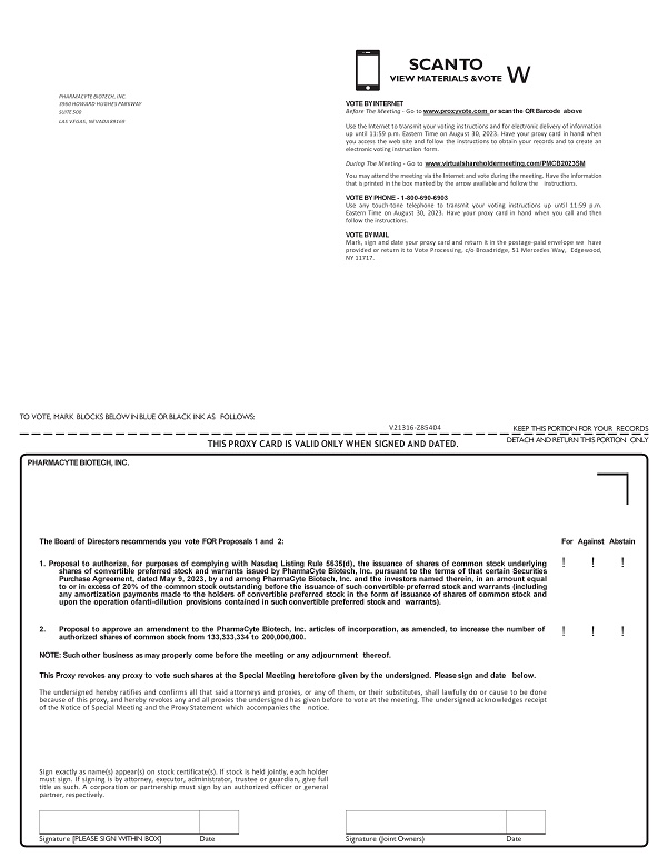 Signature [PLEASE SIGN WITHIN BOX] Date Signature (Joint Owners) Date TO VOTE, MARK BLOCKS BELOW IN BLUE OR BLACK INK AS FOLLOWS: KEEP THIS PORTION FOR YOUR RECORDS DETACH AND RETURN THIS PORTION ONLY THIS PROXY CARD IS VALID ONLY WHEN SIGNED AND DATED. V21316 - Z85404 For Against Abstain ! ! ! PHARMACYTE BIOTECH, INC. 3960 HOWARD HUGHES PARKWAY SUITE 500 LAS VEGAS, NEVADA 89169 1 . Proposal to authorize, for purposes of complying with Nasdaq Listing Rule 5635 (d), the issuance of shares of common stock underlying shares of convertible preferred stock and warrants issued by PharmaCyte Biotech, Inc . pursuant to the terms of that certain Securities Purchase Agreement, dated May 9 , 2023 , by and among PharmaCyte Biotech, Inc . and the investors named therein, in an amount equal to or in excess of 20 % of the common stock outstanding before the issuance of such convertible preferred stock and warrants (including any amortization payments made to the holders of convertible preferred stock in the form of issuance of shares of common stock and upon the operation ofanti - dilution provisions contained in such convertible preferred stock and warrants) . 2. Proposal to approve an amendment to the PharmaCyte Biotech, Inc. articles of incorporation, as amended, to increase the number of authorized shares of common stock from 133,333,334 to 200,000,000. The Board of Directors recommends you vote FOR Proposals 1 and 2: Sign exactly as name(s) appear(s) on stock certificate(s) . If stock is held jointly, each holder must sign . If signing is by attorney, executor, administrator, trustee or guardian, give full title as such . A corporation or partnership must sign by an authorized officer or general partner, respectively . PHARMACYTE BIOTECH, INC. NOTE : Such other business as may properly come before the meeting or any adjournment thereof . This Proxy revokes any proxy to vote such shares at the Special Meeting heretofore given by the undersigned . Please sign and date below . The undersigned hereby ratifies and confirms all that said attorneys and proxies, or any of them, or their substitutes, shall lawfully do or cause to be done because of this proxy, and hereby revokes any and all proxies the undersigned has given before to vote at the meeting . The undersigned acknowledges receipt of the Notice of Special Meeting and the Proxy Statement which accompanies the notice . ! ! ! SCAN TO VIEW MATERIALS & VOTE w VOTE BY INTERNET Before The Meeting - Go to www . proxyvote . com or scan the QR Barcode above Use the Internet to transmit your voting instructions and for electronic delivery of information up until 11 : 59 p . m . Eastern Time on August 30 , 2023 . Have your proxy card in hand when you access the web site and follow the instructions to obtain your records and to create an electronic voting instruction form . During The Meeting - Go to www . virtualshareholdermeeting . com/PMCB 2023 SM You may attend the meeting via the Internet and vote during the meeting . Have the information that is printed in the box marked by the arrow available and follow the instructions . VOTE BY PHONE - 1 - 800 - 690 - 6903 Use any touch - tone telephone to transmit your voting instructions up until 11 : 59 p . m . Eastern Time on August 30 , 2023 . Have your proxy card in hand when you call and then follow the instructions . VOTE BY MAIL Mark, sign and date your proxy card and return it in the postage - paid envelope we have provided or return it to Vote Processing, c/o Broadridge, 51 Mercedes Way, Edgewood, NY 11717 .