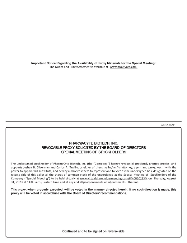 V21317 - Z85404 Important Notice Regarding the Availability of Proxy Materials for the Special Meeting: The Notice and Proxy Statement is available at www.proxyvote.com. PHARMACYTE BIOTECH, INC. REVOCABLE PROXY SOLICITED BY THE BOARD OF DIRECTORS SPECIAL MEETING OF STOCKHOLDERS The undersigned stockholder of PharmaCyte Biotech, Inc . (the “Company”) hereby revokes all previously granted proxies and appoints Joshua N . Silverman and Carlos A . Trujillo, or either of them, as his/her/its attorney, agent and proxy, each with the power to appoint his substitute, and hereby authorizes them to represent and to vote as the undersigned has designated on the reverse side of this ballot all the shares of common stock of the undersigned at the Special Meeting of Stockholders of the Company (“Special Meeting”) to be held virtually at www . virtualshareholdermeeting . com/PMCB 2023 SM on Thursday, August 31 , 2023 at 11 : 00 a . m . , Eastern Time and at any and all postponements or adjournments thereof . This proxy, when properly executed, will be voted in the manner directed herein . If no such direction is made, this proxy will be voted in accordance with the Board of Directors' recommendations . Continued and to be signed on reverse side
