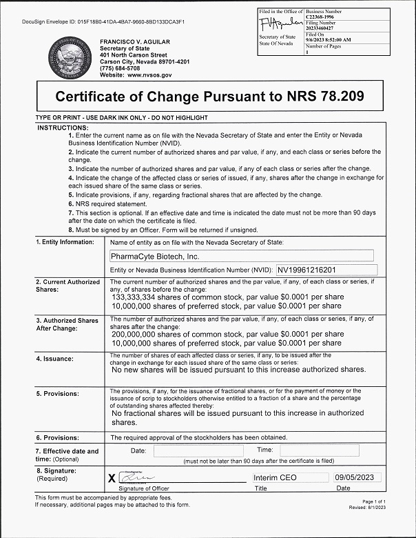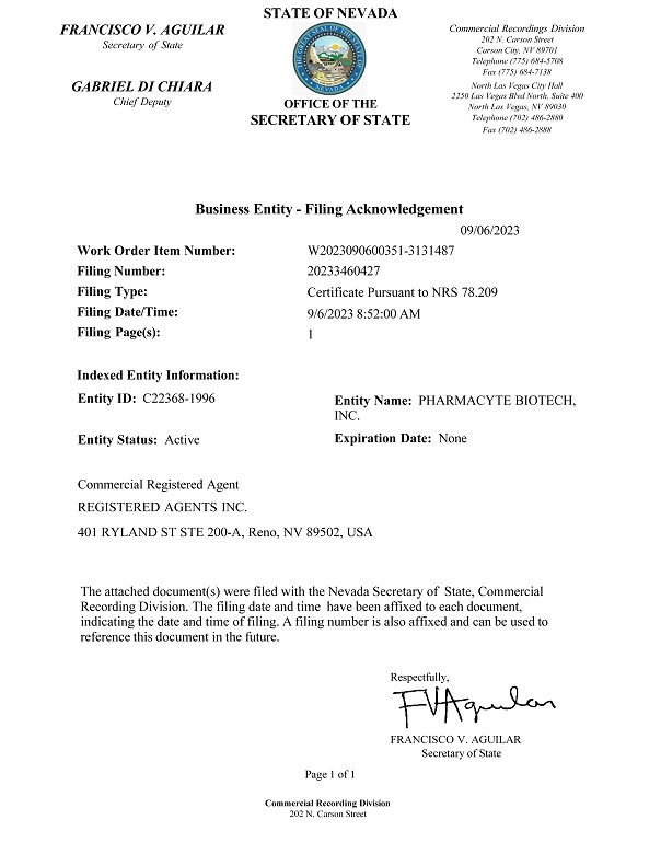 Business Entity - Filing Acknowledgement 09/06/2023 Work Order Item Number: Filing Number: Filing Type: Filing Date/Time: Filing Page(s): W2023090600351 - 3131487 20233460427 Certificate Pursuant to NRS 78.209 9/6/2023 8:52:00 AM 1 Indexed Entity Information: Entity ID: C22368 - 1996 Entity Name: PHARMACYTE BIOTECH, INC. Expiration Date: None Entity Status: Active Commercial Registered Agent REGISTERED AGENTS INC. 401 RYLAND ST STE 200 - A, Reno, NV 89502, USA The attached document(s) were filed with the Nevada Secretary of State, Commercial Recording Division. The filing date and time have been affixed to each document, indicating the date and time of filing. A filing number is also affixed and can be used to reference this document in the future. Respectfully, FRANCISCO V. AGUILAR Secretary of State GABRIEL DI CHIARA Chief Deputy STATE OF NEVADA OFFICE OF THE SECRETARY OF STATE Commercial Recordings Division 202 N. Carson Street Carson City, NV 89701 Telephone (775) 684 - 5708 Fax (775) 684 - 7138 North Las Vegas City Hall 2250 Las Vegas Blvd North, Suite 400 North Las Vegas, NV 89030 Telephone (702) 486 - 2880 Fax (702) 486 - 2888 FRANCISCO V. AGUILAR Secretary of State Page 1 of 1 Commercial Recording Division 202 N. Carson Street
