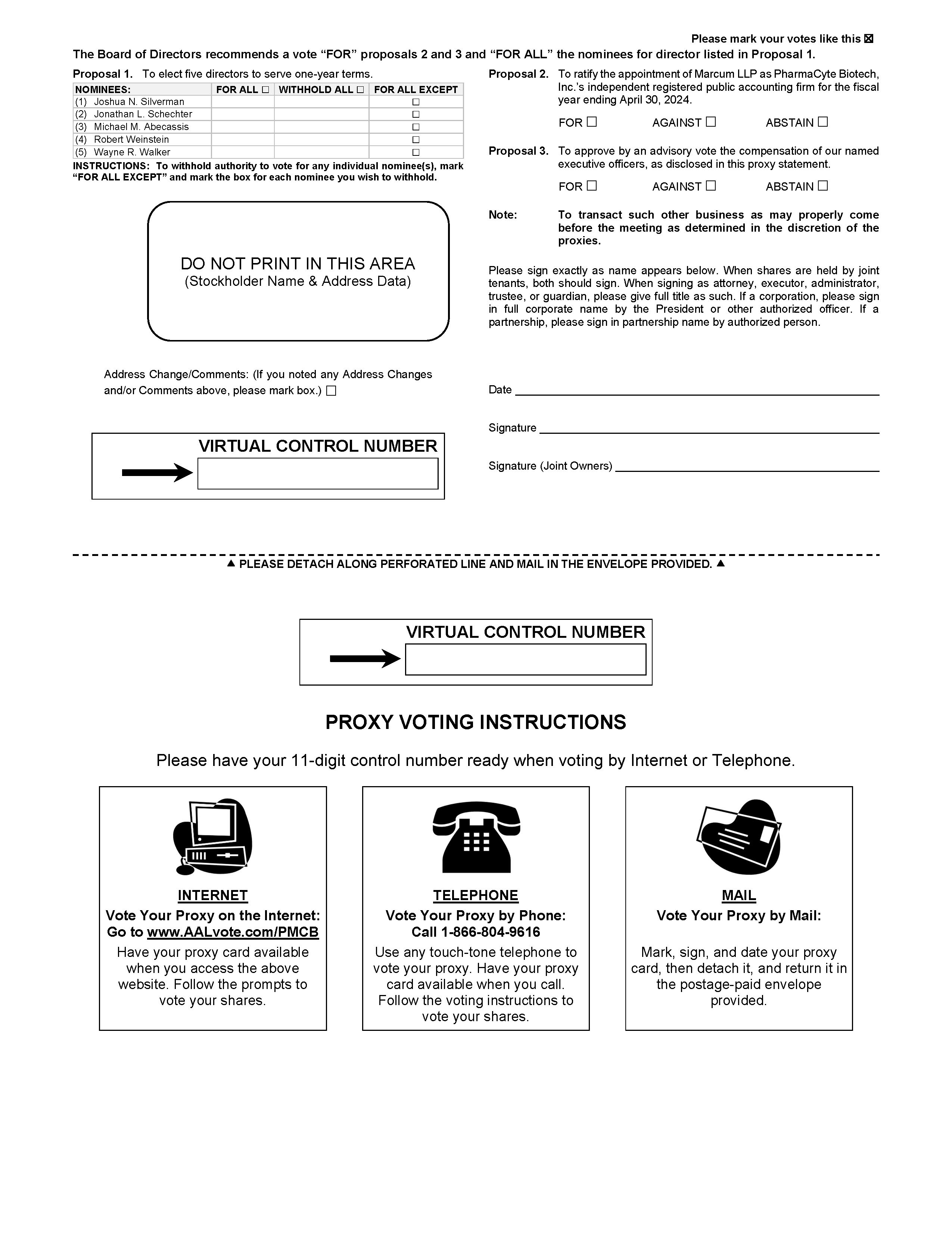 ☒ PLEASE DETACH ALONG PERFORATED LINE AND MAIL IN THE ENVELOPE PROVIDED. ☒ DO NOT PRINT IN THIS AREA (Stockholder Name & Address Data) Please mark your votes like this ց The Board of Directors recommends a vote “FOR” proposals 2 and 3 and “FOR ALL” the nominees for director listed in Proposal 1. Proposal 1. To elect five directors to serve one - year terms. FOR ALL EXCEPT WITHHOLD ALL տ FOR ALL տ NOMINEES: տ (1) Joshua N. Silverman տ (2) Jonathan L. Schechter տ (3) Michael M. Abecassis տ (4) Robert Weinstein տ (5) Wayne R. Walker INSTRUCTIONS: To withhold authority to vote for any individual nominee(s), mark “FOR ALL EXCEPT” and mark the box for each nominee you wish to withhold. Address Change/Comments: (If you noted any Address Changes and/or Comments above, please mark box.) տ VIRTUAL CONTROL NUMBER Proposal 2 . To ratify the appointment of Marcum LLP as PharmaCyte Biotech, Inc . ’s independent registered public accounting firm for the fiscal year ending April 30 , 2024 . FOR տ AGAINST տ ABSTAIN տ Proposal 3 . To approve by an advisory vote the compensation of our named executive officers, as disclosed in this proxy statement . FOR տ AGAINST տ ABSTAIN տ Note: To transact such other business as may properly come before the meeting as determined in the discretion of the proxies . Please sign exactly as name appears below . When shares are held by joint tenants, both should sign . When signing as attorney, executor, administrator, trustee, or guardian, please give full title as such . If a corporation, please sign in full corporate name by the President or other authorized officer . If a partnership, please sign in partnership name by authorized person . Date Signature Signature (Joint Owners) VIRTUAL CONTROL NUMBER PROXY VOTING INSTRUCTIONS Please have your 11 - digit control number ready when voting by Internet or Telephone. INTERNET Vote Your Proxy on the Internet: Go to www.AALvote.com/PMCB Have your proxy card available when you access the above website. Follow the prompts to vote your shares. TELEPHONE Vote Your Proxy by Phone: Call 1 - 866 - 804 - 9616 Use any touch - tone telephone to vote your proxy. Have your proxy card available when you call. Follow the voting instructions to vote your shares. MAIL Vote Your Proxy by Mail: Mark, sign, and date your proxy card, then detach it, and return it in the postage - paid envelope provided.