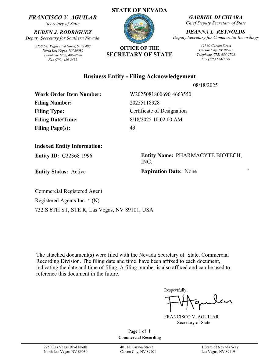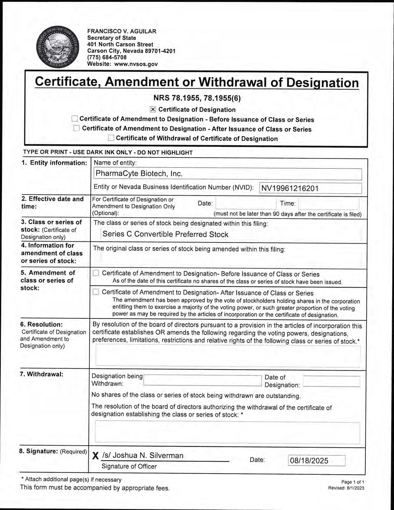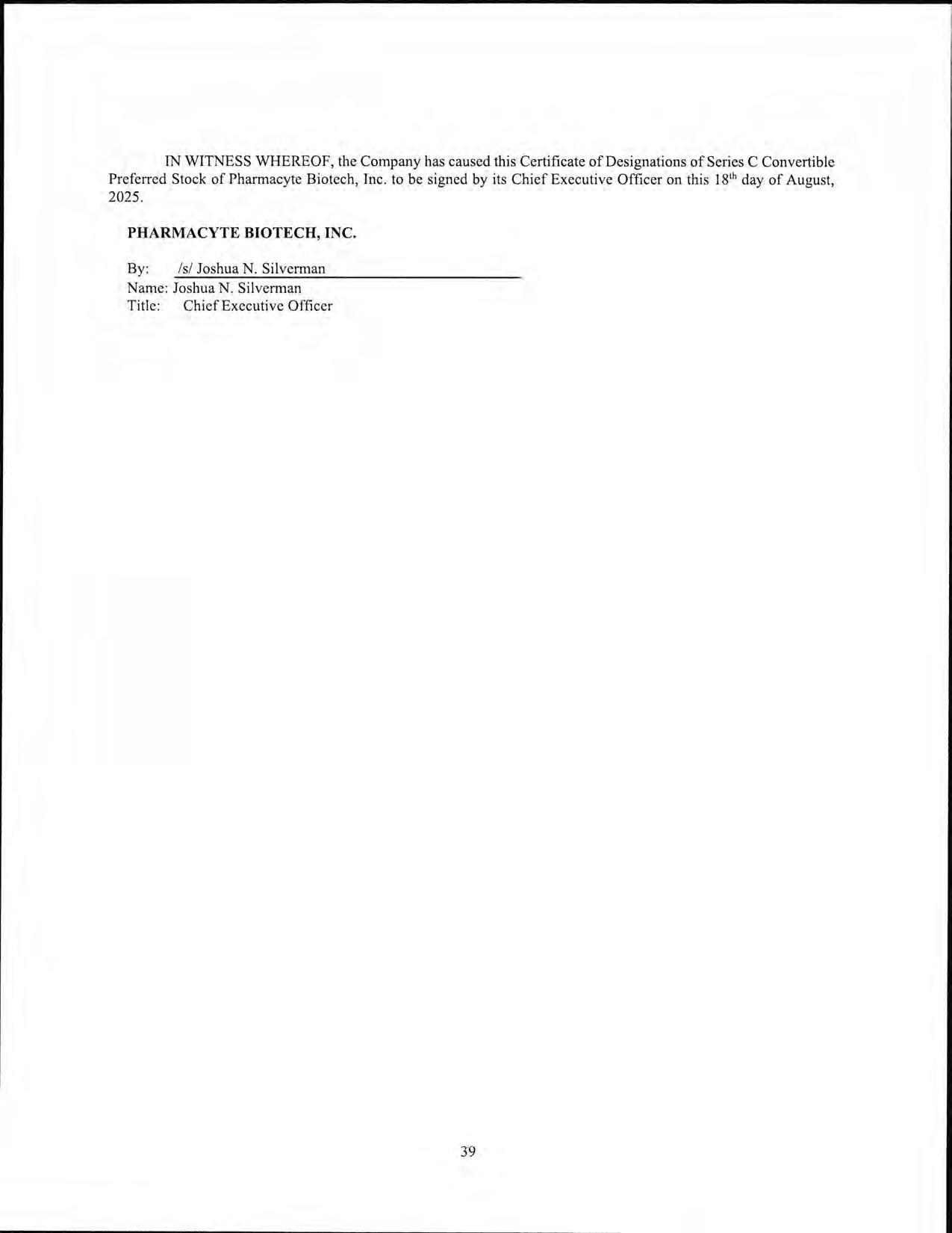TN WITNESS WHEREOF, the Company has caused this Certificate of Designations of Series C Convertible Preferred Stock of Pharmacyte Biotcch, Tnc . to be signed by its Chief Executive Officer on this 18 1 h day of August, 2025 . PHARMACYTE BIOTECH, INC. By: Isl Joshua N. Silverman Name: Joshua N. Silverman Title: Chief Executive Officer 39