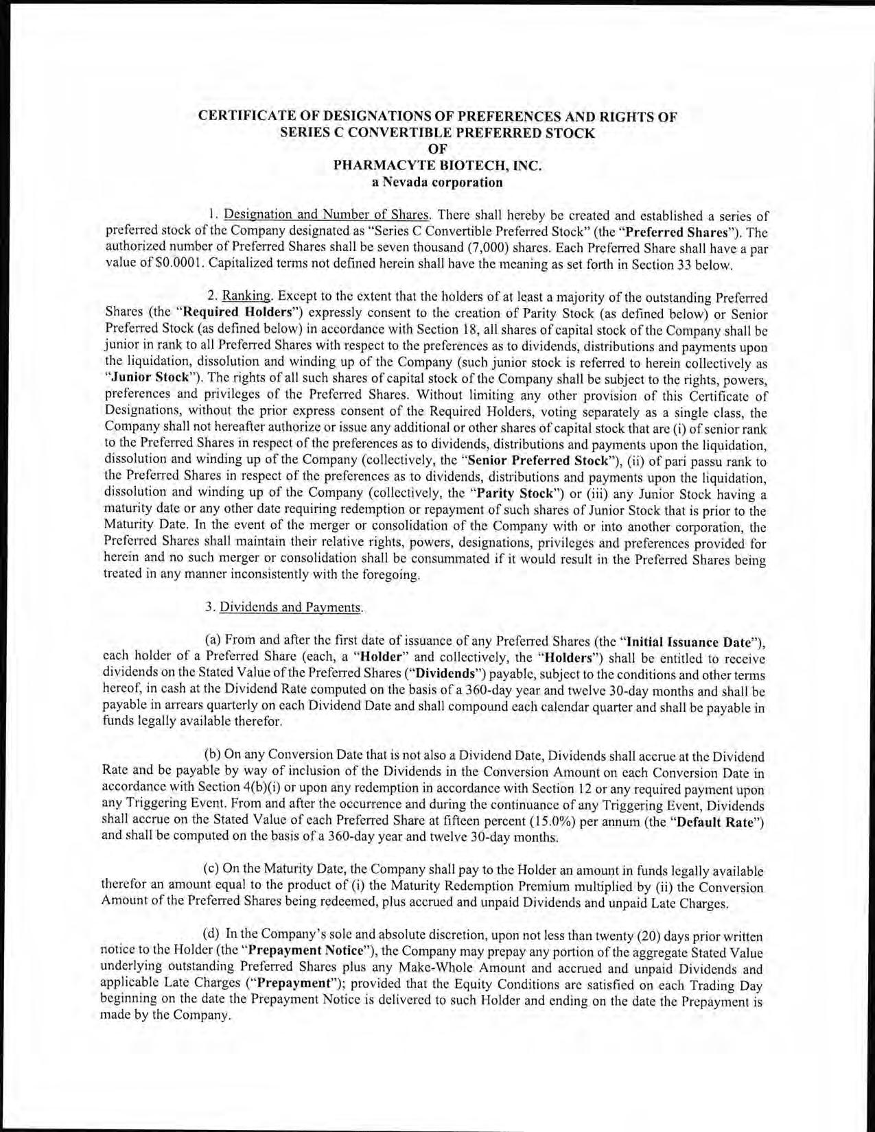C'E RTlFI C A n: OF D E SI G NATIO N S OF PREFERENCES AND RIGHTS OF SERIES C CONVERTIBLE PREFERRED S TO C K OF PHARMACYTE BlOT EC H , l NC. a Ne v a d a co rp o rati o n I . Designation and Number of Shares . There shall hereby be created and established a series of prefeITed stock of the Company designated as "Series C Convertible Preferred Stock" (the " Pr e f e rr e d S h a re s" ) . The authorized number of Preferred Shares shall be seven thousand ( 7 , 000 ) shares . Each Preferred Share sha ll have a par value of S 0 . 000 l . Capitalized terms not defined herein shall have the meaning as set forth in Section 33 below . 2. Ranking . Except to the extent that the holders of at least a majority of the outstanding Preferred Shares (the " R e quir e d Hold e r s'') express l y consent to the creation of Parity Stock (as defined below) or Senior Preferred Stock (as defined below) in accordance with Section 18 , all shares of capital stock of the Company shall be junior in rank to all Preferred Shares with respect to the preferences as to dividends, distributions and payments upou the liquidation, dissolution and winding up of the Compa n y (such junior stock is referred to herein collectively as " Junior Sto c k ") . The rights of all s u ch shares of capita l stock of the Company shall be subject to the rights, powers, preferences and privileges of the Preferred Shares . Without limiting any other provision of this Ce r tificate of Designations, without the prior express consen t of the Required Holders, voting separately as a sing l e class, the Company shall not hereafter author i ze or issue any additiona l or other shares of capital stock that are (i) of senior rank to the Preferred Shares in respect of the preferences as to dividends, distributions and payments upon the liquidation, dissolution and winding up of the Company (collectively, the " Se nior P re fe rr e d Stock "), (ii) of pari passu rank to the Preferred Shares in respect of the preferences as to dividends, distributions and payments upon the liquidation, dissolution and winding up of the Company (collectively, the " P a rit y S toc k' ') or (iii) any Junior Stock having a maturity date or any other date requiring redemption or repayment of such shares of Junior Stock that is prior to the Maturity Date . In the event of the merger or consolidation of the Company with or into another corporation, the Prcfcm :: d Shares shall maintain their relative rights, powers, designations, privileges and preferences provided for herein and no such merger or consolidation shall be consummated if it would result in the Preferred Shares being treated in any manner inconsistently with the foregoing . 3. Dividends and Payments. (a) From and after the first date of issuance of any Preferred Shares ( t he " Initial I ss u a nce Dat e "), each holder of a Preferred Share (each, a " Holder " and collectively, the '' Hold e r s") shall be entitled to receive dividends on the Stated Value of the Preferred Shares (" Di v id e nd s" ) payable, subject to the conditions and other tenns hereof, in cash at the Dividend Rate computed on the basis of a 360 - day year and twelve 30 - day months and shall be payable in arrears quarterly on each Dividend Date and shall compound each calendar quarter and shall be payable in funds legally available therefor . (b) On any Conversion Date that is not also a Dividend Date, Dividends shall accrue at the Dividend Rate and be payable by way of inclusion of the Dividends in lbe Conversion Amount on each Conversion Date in accordance with Section 4 (b}(i) or upon any redemption in accordance with Section 12 or any required payment upon any Triggering Event . From and after the occurrence and during the continuance of any Triggering Event, Dividends shall accrue on the Stated Value of each Preferred Share at fifteen percent ( 15 . 0 % ) per annum (the '' D e fault R a t e") and shall be computed on the basis of a 360 - day year a n d twelve 30 - day months . (c) On the Maturity Date, the Company shall pay to the Holder an amount in funds legally available therefor an amount equal to the product of (i) the Maturity Redemption Premium multiplied by (ii) the Conversion Amount of the PrcfctTed Shares being redeemed, plus accrued and unpaid Dividends and unpaid Late Charges . (d) In the Company's sole and abso l ute discretion, upon not l ess than twenty ( 20 ) days prior written notice to the Holder (the " Prep ay m e nt Notice"), the Company may prepay any portion of the aggregate Stated Value underlying outstanding Preferred Shares plus any Make - Whole Amount and accrued and unpaid Dividends and applicable Late Charges ( '' P re pa y m e nt ") ; provided that the Equity Cond i tions are satisfied on each Trading Day beginning on the date the Prepayment Notice is delivered to such Holder and endi n g on the date t h e Prepayment is made by the Company .