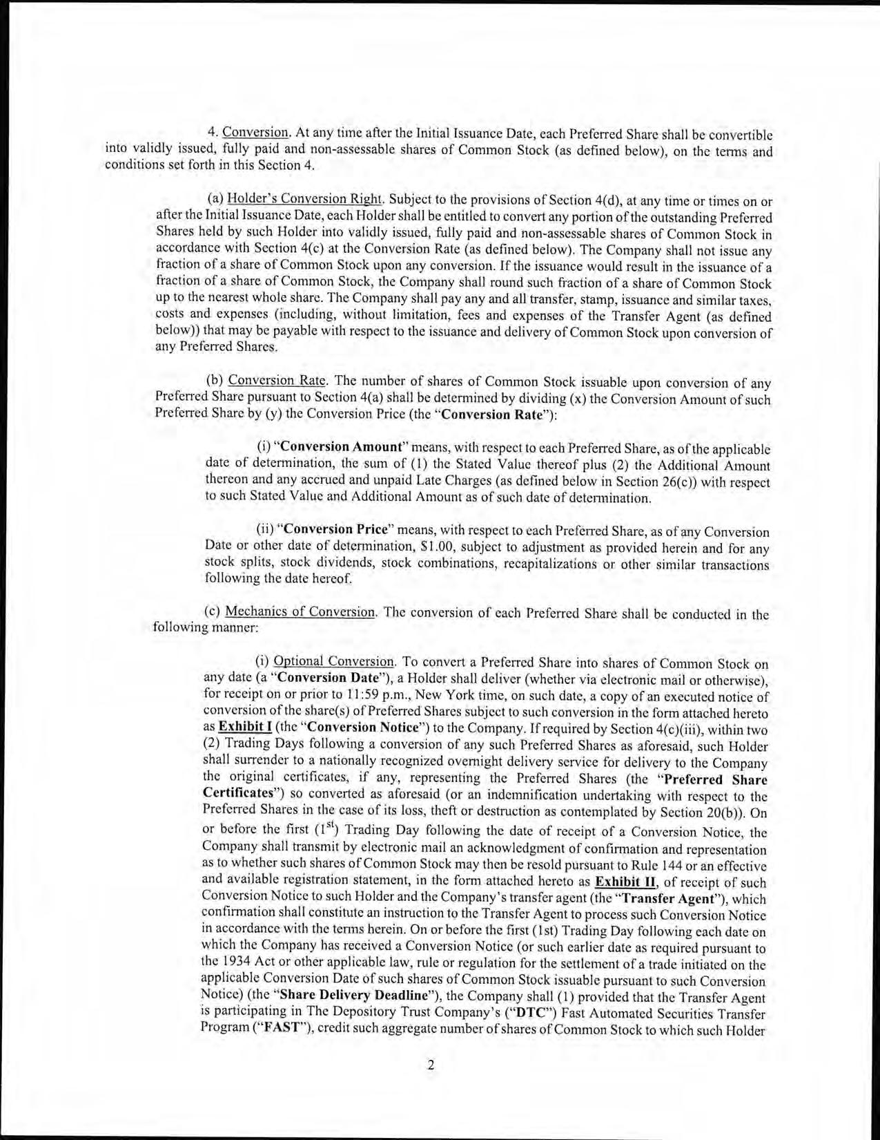 4. Conversion . At any time after the Initial I ssuance Date, each Preferred Share shall be convertible into validly issued, fully paid and non - assessable shares of Common Stock (as defined below), on the tenns and co n ditions set forth in this Section 4 . (a) Holder's Conversion Right . Subject lo the provisions of Section 4 (d), at any time or times on or after the I nitial Issuance Date, each Holder shall be enti t led to convert any portion of the outstanding Preferred Shares held by such Holder into valid l y issued, fully paid and non - assessable shares of Common Stock in accordance with Section 4 (c) at the Conversion Rate (as defined below) . The Company shall not issue any fraction of a share of Common Stock upon any conversion . If the issuance would result in the issuance of a fraction of a share of Common Stock , the Company shall round such fractio n of a share of Common Stock up to the nearest whole share . The Company shall pay any and all transfer , stamp, issuance and similar taxes, costs and expenses (including, without l imitation, fees and expenses of the Transfer Agent (as defined below)) that may be payable with respect to the issuance and delivery of Common Stock upon conversion of any Preferred Shares . (b) Conversion Rate . The number of shares of Common Stock issuable upon conversion of any Preferred Share pursuant to Section 4 (a) shall be determined by dividing (x) the Conversion Amount of such Preferred Share by (y) the Conversion Price (the "Co nversion R a t e") : (i) ' 'Co nv ersio n Amount " means, with respect to each Preferred Share, as of the applicable date of detennination, the sum of ( I ) the Stated Va lu e thereof plus ( 2 ) the Additional Amount thereon and any accrued and unpaid Late Charges (as defined below in Section 26 (c)) with respect to such Stated VaJuc and Additional Amount as of such date of detennination . (ii) "C onversion Price " means , with respect to each Preferred Share, as of any Conversion Date or other date of detcnninat - ion, $ 1 . 00 , subject to adjustment as provided herein and for any stock splits, stock dividends, stock combinations, recapitalizations or other similar transactions following the date hereof . (c) Mechanics of Conversion . Tbc conversion of each Preferred Share shall be conducted in the following manner : (i) Optional Conversion . To convert a Preferred Share into shares of Common Stock on any date (a " Conversi on Dat e''), a Holder shall deliver (whether via electron ic mail or otherwise), for receipt on or prior to 11 : 59 p . m . , New York time, on such date, a copy of an executed notice of conversion of the share(s) of Preferred Shares subject to such conversion in the form attached hereto as Exhibit I (the " Co n vers ion N otic e") to the Company . lfrequired by Section 4 (c)(iii), within two ( 2 ) Trading Days following a conversion of any such Preferred Shares as aforesaid, such Holder shall surrender to a nationally recognized overnight delivery service for delivery to the Company the original certificates , if any, representirtg the Preferred Shares (the " Preferred S h are Ce rtifi cates") so converted as aforesaid (o r an indemnification undertaking with respect to the Preferred Shares in the case of its loss, theft or destruc ti on as contemplated by Section 20 ( 6 )) . On or before the first (I 51 ) Trading Day following the date of receipt of a Conversion Notice, the Company shall transmit by electronic mail an acknowledgment of confinnati 011 and representation as to whether such shares of Common Stock may then be resold pursuant to Ruic 144 or an effective and available reg i stration statement, in i : he form attached hereto as Ex hibit II . of receipt of such Conversion Notice to such Holder and the Company's transfer agent (the '' Transfer Agent ") , which confirmation shall constitute an in struction to the Transfer Agent to process such Conversion Notice in accordance with the tenns herein . On or before the first ( 1 st) Trading Day fo ll owing each date on which the Company has received a Conversion Notice (or such earlier date as required pursuant to the 1934 Act or other applicable law, rule or regulation for the settlement of a trade initiated on the applicable Conversion Date of such shares of Common Stock issuable pursuant to such Conversion Notice) (the " S har e D e li ve r y D ead lin e"), the Company shall (I) provided that ,the Transfer Agent is participating in The Depository Trust Company's (" DTC ") Fast Automated Securities Transfer Program ( ' 'FAS T ") , credit such aggregate number of shares of Common Stock to which such Holder 2