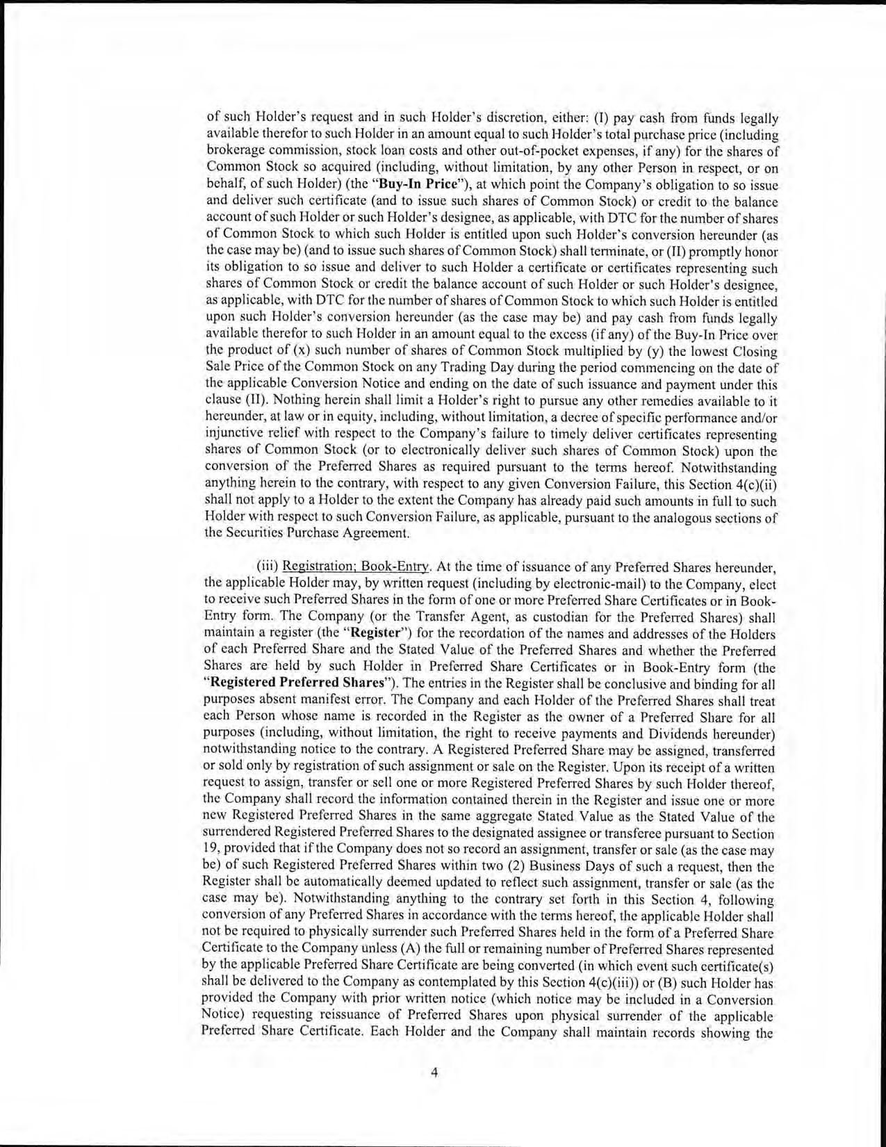of such Holder's request and in such Holder's discretion, either : ( I ) pay cash from funds lega!ly available therefor to such Holder in an amouat equal to such Holder's total purchase price (including brokerage commiss i on, stock loan cos ts and other out - of . pocket expenses, if any) for the shares of Common Stock so acquired (including, without limitation, by any other Person in respect, or on behalf, of such Hold er) (the " B u y - In Pr i ce "), at which point the Co mpan y's obligation to so issue and deliver such ceitificate (and to issue such shares of Common Stock) o r credit to the balance account of such Holder or such Holder's designee, as applicable, wit h DTC for the number of s h ares of Common Stock to which such Holder is entitled upon such Holder's conversion hereunder (as the case may be) (and to issue such shares of Common Stock) sha ll tenninate, or (II) promptly honor its obligation to so issue and deliver to suc h Holder a certificate or certificates r epresen tin g such shares of Common Stock or credit the balance account of such Holder or such Holder's designee, as applicable, with OTC for the nwnber of shares of Common Stock to which suc h Holder is entitled upon such Holder's conversion hereunder (as the case may be) and pay cash from funds legally available therefor to such Holder in an amount equal to the excess (if any) of the Buy - In Price over the product of (x) such number of shares of Common Stock multiplied by (y) the lowest Clos in g Sale Price of the Common Stock on any Trading Day during the period commencing on the date of the app li cable Conversion Notice a nd ending on the date of such issuance and payment under th i s clause (LI) . Nothing herein shall limit a Holder's right to pursue any other remedies available to it hereunder, at l aw or in equi t y, including, without l imitation, a decree of specific performance and / o r injunctive relief with respect to the Company's failure to timely deliver certificates representing shares of Common Stock (or to electronically deliver such shares of Common Stock) upon the conversion of the Preferred Shares as required pursuant to the terms hereof . Notwithstanding anything herein to the contra 1 y, with respect to any given Conversion Failur e, this Section 4 (c)(ii) shall not apply to a Holder to the extent the Company has already paid such amounts in full to suc h Holder with respect t o such Conversion Failure, as applicable, pursuant to the analogous sections of the Securities Purchase Agreement . (iii) Registration: Book - Entry. At the time of issuance of any Preferred Shares hereunder, t11e applicable Hold er may, by written request (including by electronic - m ail) to the Company, elect to receive such Preferred Shares in the form of one or more Pr eferred Share Certificates or in Book Entry form. The Company (or the Transfer Agent, as custodian for the P referred Shares) shall maintain a register (the " Reg i ster ") for the recorda tion of the names aud add r esses of the Holders of each Preferred Share and the Stated Value of the Preferred Shares and whether th e PrefeJTed Shares are held by such Holder in Preferred Share Certificates or in Book - Entry fonn ( the "Registe r ed Preferred S h a r es "). The entries in the Register shall be conclusive and binding for all purposes absent manifest error. The Company and each Holder of the Preferred Shares shall treat eac h Person whose name is recorded in the Register as the owner of a Preferred Share for all purposes (including, without limitation, the right to receive payments and Dividends hereunder) notwithstanding notice to the contrary. A Registered Preferred Share may be assigned, transferred or sold only by registration of such assignment or sale on the Register. Upon its receipt of a written request to assign, transfer or sell one or more Registered Preferred Shares by such Hold er thereof, the Company shall record th e infoimation contained therein in the Register and issue one or more new Registered Preferred Shares in th e same aggregate Stated Value as the Sta t ed Value of the surrendered Registered Preferred Shares to the designated assignee or tr ansferee pursuant to Section 1 9, provided that if the Company does not so record an assigim1ent, transfer or sale (as the case may be) of such Registered Preferred Shares within two (2) Business Days of such a request, then the Register shall be automatically deemed updated to reflect suc h assignment, transfer or sale (as the case may be). Notwithstanding anything to the con tr ary set forth in this Section 4, following conversion of any Prefe1Ted Shares in accordance with the terms hereof, tJ1e applicable Holder shall not be required to physically s urr ender such Pre ferred Shares held in the fom1 of a Preferred Share Certificate to the Company unless (A) the f - uU or remaining number of Preferred Shares represented by th e applicable Pr eferred Share Certificate arc being converted (in which event such certificate(s) shall be delivered to the Company as contemplated by this Sec t ion 4(c)(iii)) or (B) such Holder has provided the Company with prior written notice (wh ich notice may be included in a Conversion No ti ce) requesting rcissuance of Preferred Shares upon physical surrender of the applicable Preferr ed Share Certificate. Each Holder and the Company shall maintain records showing th e 4