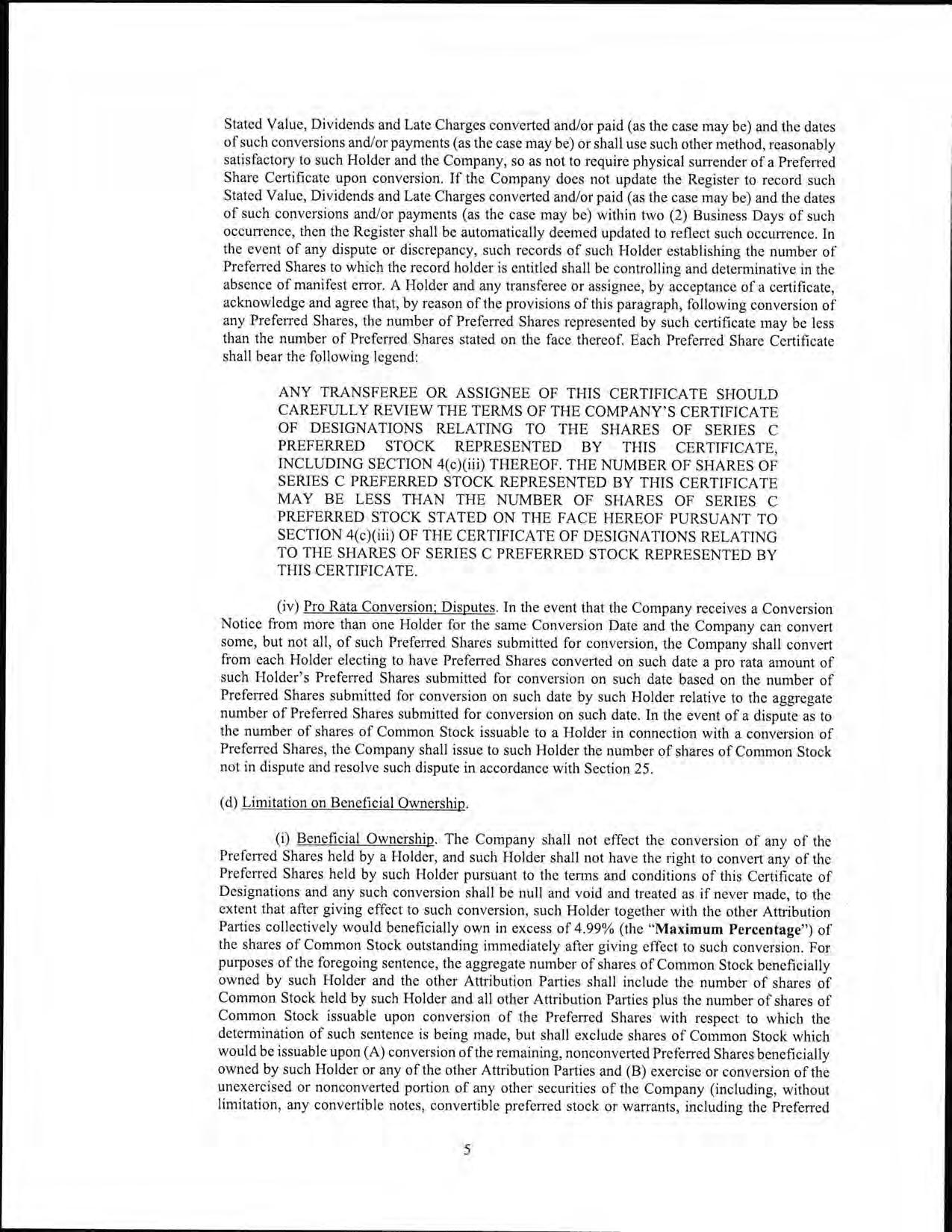 Stated Value, Dividends and Late Charges converted and/or paid (as the case may be) and the dates of such conversions and/or payments (as the case may be) or shall use such other method . reasonably satisfactory to such Holder and the Company, so as not to require physical surrender of a Prefen - ed Share Certificate upon conversion . If the Company docs not update the Register to record such Stated Value, Dividends and Late Charges converted and/or paid (as the case may be) and the dates of such conversions and/or payments (as the case may be) within two ( 2 ) Business Days of such occun - cnec, then the Register shall be automatically deemed updated to reflect such occurrence . In the event of any dispute or discrepancy, such records of such Holder establishing the number of Preferred Shares to whjch the record holder is entitled shall be controlling and determinative in the absence of manifest error . A Holder and any transferee or assignee, by acceptance of a certificate , acknowledge and agree that, by reason of the provisions of this paragraph, following conversion of any Preferred Shares, the number of Preferred Shares represented by such Certificate may be less than the number of Preferred Shares stated on the face thereof . Bach Preferred Share Certificate shall bear the following legend : ANY TRANSFEREE OR ASSIGNEE OF THIS CBRTJFICATE SHOULD CAREFULLY REVIEW THE TERMS OF THE COMPANY'S CERTTFICATE OP DESIGNATIONS RELATTNG TO THE SHARES OF SERIES C PR EFERRED STOCK REPRESENTED BY THIS CERTIFICATE, INCLUDTNG SECTION 4 (c)(iii) THEREOF . THE NUMBER OF SHARES OF SERIES C PREFERRED STOCK REPRESENTED BY THIS CERTIFICATE MAY BE LESS THAN THE NUMBER OF SHARES OF SERJES C PREFERRED STOCK STATED ON THE FACE HEREOF PURSUANT TO SECTION 4 (c)(iii) OF THE CERTIFICATE OF DESIGNATTONS RELATlNG TO THE SHARES OF SERJES C PREFERRED STOCK REPRESENTED BY TI - - IIS CERTIFICATE . (iv) Pro Rata Conversion ; Disputes . In the event that the Company receives a Conversion Notice from more than one Holder for the same Conversion Date and the Company can convert some, but not all , of such Preferred Shares submitted for conversion, 1 he Company shall convert from each Holder electing to have Preferred Shares converted on such date a pro rata amount of such Holder ' s Preferred Shares submitted for conversion on such date based on the number of Preferred Shares submitted for conversion on such date by such Holder relative to the aggregate number of Preferred Shares submitted for conversion on such date . In the event of a dispute as to the number of shares of Common Stock issuable to a Holder in connection with a conversion of Prefc 1 Ted Shares, the Company shall issue to such Holder the number of shares of Common Stock not in dispute and resolve such dispute in accordance with Section 25 . (d) Limitation on Beneficial Ownership. (i) Beneficial Ownership . The Company shall not effect the conversion of any of the Preferred Shares held by a Holder , and such Holder shall not have the right to convert any of the Preferred Shares held by such Holder pursuant to the tenns and conditions of this Certificate of Designations and any such conversion shall be null and void and treated as if never made, to the extent that after giving effect to such conversion, such Holder together with the other Attribution Parties collectively would beneficially own in excess of 4 . 99 % (t h e "Maximum Percentage") of the shares of Common Stock outstanding immediately after giving effect to such conversion . For purposes of the foregoing sentence, the aggregate number of shares of Common Stock beneficially owned by such Holder and the other Attribution Parties shall include tho number of shares of Common Stock held by such Holder and all other Attribution Pa 1 iies plus the number of shares of Common Stock issuable upon conversion of the Preferred Shares with respect to which tbe dctcm 1 ination of such sentence is being made, but shall exclude shares of Common Stock which would be issuable upon (A) conversion of the remaining, nonconvcrted Preferred Shares beneficially owned by such Holder or any of the other Attribution Parties and (B) exercise or conversion of the unexercised or nonconverted portion of any other securities of the Company (including, without limitation, any convertible notes 1 conver t ible preferred stock or warrants , including the Preferred 5