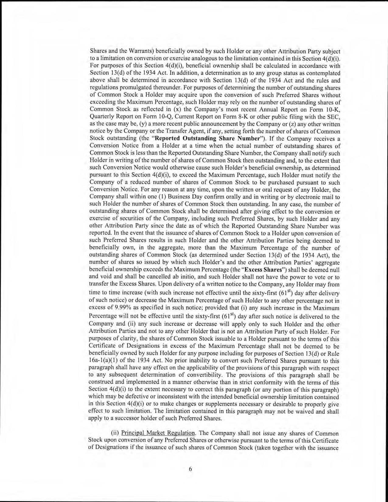 Shares and the Warrants) beneficially owned by suc h Holder or any other Attribution Party subject to a limitation on conversion or exercise analogous to the limitation contained in this Section 4 (d)(i) . For purposes of th is Section 4 (d)(i), beneficial ownership shall be calculated in accordance with Section 13 (d) of the 1 934 Act . ln addition, a determination as to any group status as contemplated above shall be detem 1 ined in accordance with Section 1 3 (d) of the 1934 Act and the rules and regulations promulgated thereunder . For purposes of detcnnining the number of outstanding shares of Common Stock a Holder may acquire upon the conversion of such Preferred Shares wi th out exceeding the Maximum Percentage , such Holder may rely on the number of outstanding shares of Common Stock as reflected in (x) th e Company's most recent Annual Report on Fonn I 0 - K, Quarterly Report on Form I 0 - Q , Curren t Report on Fonn 8 - K or other public filing with the SEC, as the case may be, (y) a more recent public announcement by the Company or (z) any other written notice by the Company or the Transfer Agent, if any, setting forth the number of shares of Common Stock outstanding (the " Reported Outstanding S har e Nu mb e r '') . If the Company receives a Conversion Notice from a Holder at a time when the actual numbe , r of outstanding shares of Common Stock is less than the Reported Outstanding Share Number , th e Company shall n otify such Holder in writing of the number of shares of Common S t ock then outstanding and, to the extent that such Conversion Notice would otherwise cause such Holder's beneficial ownership, as determined pursuant to this Section 4 (d)(i), to exceed the Maximum Percentage, such Holder must notify the Company of a reduced number of shares of Common Stock to be purchased pursuant to such Conversion Notice . For any reason at any time . , upon the written or oral request of any Holder , the Company shall wit h in one (I) Business Day confirm orally and in writing or by electronic mail to such Holder the number of shares of Common Stock then outstanding . ln any case, the ntimber of outstand i ng shares of Common Stock shall be determined after giving effect to the conversion o r exercise of securities of the Company, including such Preferred Shares, by such Holder and any other Attribution Party since the date as of which the Reported Outstanding Share Number was reported . ln the event that the issuance of shares of Common Stock to a Holder upon conversion of such Preferred Shares results in such Holder and the other Attribution P arties being deemed to beneficially own, in the aggregate, more than t h e Maximum Percentage of the number of outstanding shares of Common Stock (as determined under Section 13 (d) of the 1934 Act), the number of shares so issued by which such Ho l der's and the other Attribution Parties' aggregate beneficial ownership exceeds the Maximum Percentage (t h e "Exce ss Shares ") shall be deemed null and void and shall be cancelled ab initio, and such Holder shall not have the power t o vote or to ITansfer the Excess Shares . Upon delivery of a written notice l o the Company, any Holder may from time lo time increase (with such increase not effective until th e sixty - first ( 61 st ) day afte r delivery of such notice) or decrease the Maximum Percentage of such Holder to any other percentage not in excess of 9 . 99 % as specified in such notice : provided that (i) any such increase in the Maximum Percentage will not be effective until the sixty - first ( 6 I st ) day after such notice is delivered to the Company and (ii) any such increase or decrease will app l y only to such Holder and the other Attribution Parties a nd not to any other Holder that is not an Attribution Party of such Holder . For purposes of clarity, the shares of Common Stock issuable to a Holder pursuant to the terms of this Ce 11 ifieate of Designations in excess of the Maximum Percentage s hall not be deemed to be beneficially owned by such Holder for any purpose including for purposes of Section 13 ( d) or Ruic I 6 a - 1 (a)( I) of the 1934 Act . No prior inability to convert such Preferred Shares pursuant to this paragraph shall have any effect on the applicability of the provisions of this paragraph with respect to any subsequent detennination of convert ibili ty . The provisions of this paragraph shall be construed and implemented in a manner otheiwise than in strict confonnity with the terms of this Section 4 (d)(i) to the extent necessary to correct this paragraph (or any po 1 tion of this paragraph) which may be defective or inconsistent with the intended beneficial ownership limitation contained in this Section 4 (d)(i) or to make changes or supplements necessary or desirable to properly give effect to such limitation . The limitation contained in this paragraph may not be waived and shall apply to a successor holder of suc h Preferred Shares . (ii) Principal Market Regulation . The Company shall not issue any shares of Common Stock upon conversion of any Preferred Shares or otherwise pursuant to th e terms of this Certificate of Designations if the issuance of such shares of Common Stock (taken together with the issuance 6