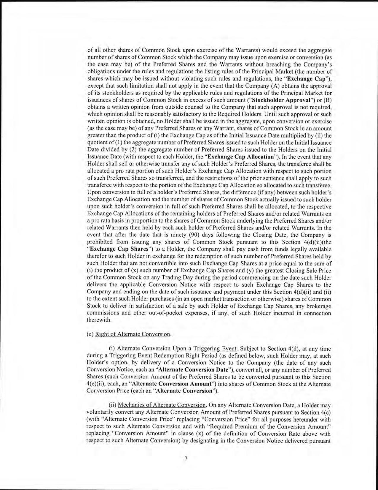 of all other shares of Common Stock upon exercise of the WatTants) would exceed the aggregate number of shares of Common Stock which the Company may issue upon exercise or conversion (as the case may be) of the Preferred Shares and the Warrants without breaching the Company's obligations under the rules and regulations the listing rules of the Principal Market (the number of shares which may be issued without violating such rules and regulations, the " Exc han ge Ca p ''), except that such limitation shall not apply in the event that the Company (A) obtains the approval of its stockholders as required by the applicable rules and regulations of the Principal Market for issuances of shares of Common Stock in excess of such amount ("Stockholder Approval '') or (B) obtains a written opinion from outside counsel to the Company that sucb approval is not required, which opinion shaJI be te, : \ sonably satisfactory to the Required Holders . Until such approval or such written opinion is obtained, no Holder shall be issued in the aggregate, upon conversion or exercise (as the case may be) of any Preferred Shares or any Warrant, shares of Common Stock in an amount greater than the product of (i) the Exchange Cap as of the Initial l ssuance Date multiplied by (ii) the quotient of ( l) the aggregate number of Preferred Shares issued to such Holder on the lnjtial I ssuance Date divided by ( 2 ) the aggregate number of Preferred Shares issued to the Holders on rhe Initial Issuance Date (with respect to each Holder, the "Exchange Cap Allocation ") . In the event that any Holder shall sell or otherwise transfer any of such Holder's Preferred Shares, the transferee shall be allocated a pro rata portion of such Holder's Exchange Cap Allocation w i th respect to such portion of such Preferred Shares so transferred, and the restrictions of the prior sentence shall apply to such transferee with respect to the portion of the Exchange Cap Allocation so allocated to such transferee . Upon conversion in full of a holder's Prefe 1 Ted Shares, the difference (if any ) between such holder's Exchange Cap Allocation and the number of shares of Common Stock acmally issued to such holder upon such holder's conversion in full of such P referred Shares shall be allocated, to the respective Exchange Cap Allocations of the remaining holders of Prefe 1 Ted Shares and/or related Warrants on a pro rata basis in proponion to the shares of Common Stock underlying the Preferred Shares and/or related Warrants then held by each such holder of Preferred Shares and/or related Warrants . In the event that after the date that is ninety ( 90 ) days following the Closing Date, the Company is prohibited from issuing any shares of Common Stock pursuant to this Section 4 (d)(ii)(the "Exchange Ca p S h ares") to a Holder, the Company shall pay cash from funds l egally available therefor to such Holder in exchange for the redemption of such number of Preferred Shares held by such Holder that are not convertible into such Exchange Cap Shares at a price equal to the sum of (i) the product of (x) such number of Exchange Cap Shares and (y) the greatest Closing Sale Price of the Common Stock on any Trading Day during the period commencing on the date such Holder delivers the applicable Conversion Notice with respect to such Exchange Cap Shares to the Company and ending on the date of such issuance and payment under this Section 4 (d)(ii) and (ii) to the extent such Holder purchases (in an open market transaction or otherwise) shares of Common Stock to deliver in satisfaction of a sale by such Holder of Exchange Cap Shares, any brokerage commissions and other out - of - pocket expenses, if any, of such Holder incurred in connection therewith . (c) Right of Alternate Conversion . (i) Alternate Conversion Upon a Triggering Event . Subject to Section 4 (d) , at any time during a Triggering Event Redemption Right Period (as defined below, such Holder may, at such Holder ' s option, by delivery of a Conversion Notice to the Company (the date of any such Conversion Notice, each an "Alternate Conversion D ate " ) , convert all, or any number of Preferred Shares (such Conversion Amount of the Preferred Shares to be converted pursuant to this Section 4 (c)(ii), each, an ''A lt e rnat e Conversion Amount ") into shares of Common Stock at the Alternate Conversion Price (each an ''Alternate Co n ve r s ion ") . (ii) Mechanics of Alternate Co n version . On any Alternate Conversion Date, a Holder may voluntarily convert any Alternate Conversion Amount of Preferred Shares pursuant to Section 4 (c) (with ' • Alternate Conversion Price" replacing "Conversion Price'' for all purposes hereunder with respect to such Alternate Conversion and with ''Required Premium of the Conversion Amount" replacing "Conversion Amount" in clause (x) of the definition of Conversion Rate above with respect to such Alternate Conversion) by designating in the Conversion Notice delivered pursuant 7