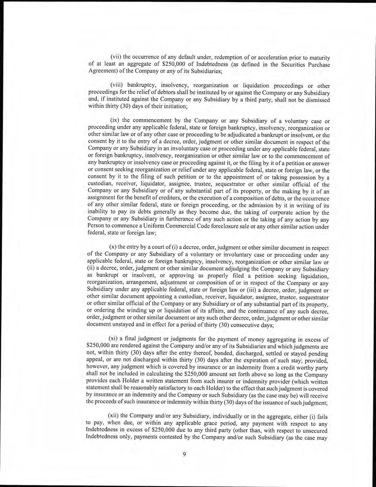 (vii) the occurrence of any default under, redemption of or acceleration prior 10 maturity of at least an aggregate of $ 250 , 000 of Indebtedness (as defined in the Securities Purchase Agreement) of the Company or any of its Subsidiaries ; (viii) bankruptcy, insolvency, reorganization or liquidation proceedings or other proceedings for the relief of debtors shall be instituted by or against the Company or any Subsidiary and, if instituted against tho Company or any Subsidiary by a third party , shall not be dismissed within thirty ( 30 ) days of their initiation ; (ix) the commencement by the Company or any Subsidiary of a voluntary case or proceeding under any applicable federal, state or foreign bankruptcy, insolvency, reorganization or other similar law or of any other case or proceeding to be adjudicated a bankrupt or insolvent, or the consent by it to the entry of a decree, order, judgment or other similar document in respect of the Company or any Subsidia1y in an involunta1y case or proceeding under any app li cable federal, state. or foreign bankruptcy, insolvency, reorganization or other similar law or to the comme 1 1cemont of any bankruptcy or insolvency case or proceeding against it, or the filing by it of a petition or answer or consent seeking reorganjzatlon or relief under any appticable federal, state o r fo r eign law, or the consent by it to the filing of such petition or to the appointment of or taking possession by a custodian, receiver, liquidator , assignee, trustee, sequestrator or other similar official of the Company or any Subsidiary or of any substantial pa1t of its property, or the making by it of an assignment for the benefit of creditors, or th e execution of a composition of debts, or the occurrence of any other similar federal, state or foreign proceeding, or the admission by it in writing of its inability to pay its debts generally as they become due, the taking of corporate action by the Company or any Subsidiary in furtherance of any such action or the taking of any action by any Person to commence a Unifonn Commercial Code foreclosure sale or any other similar action under federal, state or foreign law; (x) the entry by a court of (i) a decree, order,judgment or other simi l a r document in respect of the Company or any Subsidiary of a voluntary or involunta 1 y case or proceeding under any applicable federal, state or foreign bankruptcy, insolvency, reorganization or other simi l ar law or (ii) a decree, order, judgment or other similar document adjudging the Company or any Subsidiary as bankrupt or insolvent, or approving as properly filed a petition seeking liquidarion, reorganization, arrangement, adjustment or composition of or in respect of the Company or any Subsidiary unde r any applicable federal, state or foreign law or (iii) a decree, order, judgment or other similar document appointing a custodian, receiver, liquidator , assignee, trustee, sequestrator or other similar official of the Company or any Subsidia 1 y or of any substantial pa 1 i of its property, or ordering the winding up or liquidation of its affairs, and the conti n uance of any such decree, ordcr,judgment or other similar document or anysuch other decree, order,judgment or other similar document unstayed and in effect for a period of thirty ( 30 ) consecutive days ; (xi) a final judgment or judgments for the paymen t of money aggregating in excess of $ 250 , 000 arc rendered against the Company and / or aoy of its Subsidiaries and which judgments are not, within thirty ( 30 ) days after the entry thereof, bonded, discharged, sett l ed or stayed pending appeal, or arc not discharged within thirty ( 30 ) days after the expira tion of such stay ; provided , however, any judgment which is covered by insurance or an indemnity from a credit worthy party shall not be included in calcu l ating the S 250 , 000 amoun t sot forth above so long as the Company provides each Holder a written statement from such insurer or indemnity provider (which written statement shall be reasonably satisfactory to each Holder) to the effect that such judgment is covered by insurance or an indemnity and the Company or such Subsidiary (as the case may be) will receive the proceeds of such insw·aoceor indemnity within thirty ( 30 ) days of the issuance of such judgment ; (xii) the Company and/or any Subsidiary, ind i vidually or in the agg r egate, either (i) fails to pay , when due, or within any applicable grace period, any payment with respect to any Indebtedness in excess of 5250 , 000 due to any third party (other than, with respect to unsecured Indebtedness only, payments contested by the Company and/or such Subsidiary (as the case may 9