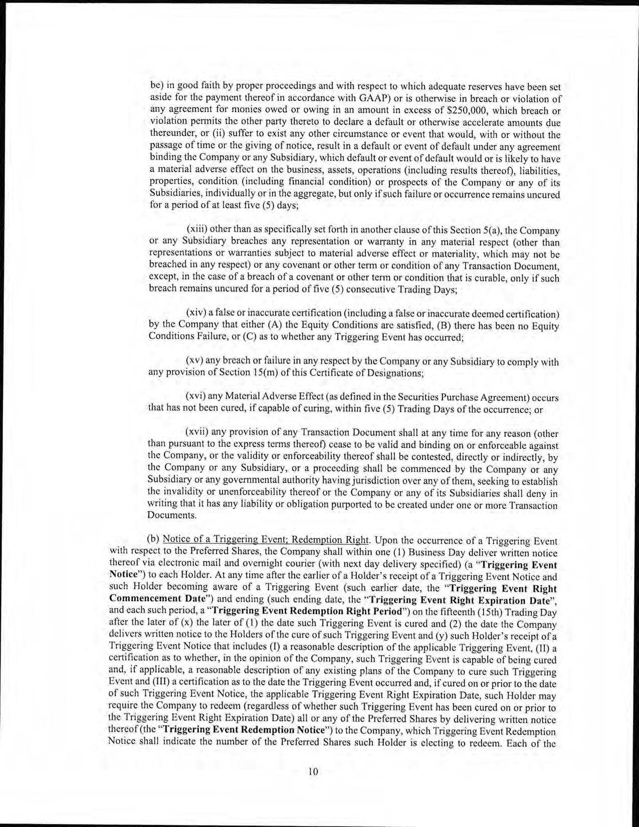 be) in good faith by proper proceedings and with respect to which adequate reserves have been set aside for the payment thereof in accordance with GAAP) or is otherwise in breach or violation of any agreement for monies owed or owing i 11 an amount in excess of $ 250 , 000 , which breach or violation pennits the other paiiy thereto to declare a default or otherwise accelerate amounts gue thereunder, or (ii) suffer to exist any other circumsta 11 ce or event that would, with or without the passage of time or the giving of notice, result in a default or event of default under any agreement binding the Company or any Subsidiary, which default ot event of default would or is likely to have a material adverse effect on the business, assets, operations (including results thereof), liabilities, properties , condition (including financial condition) or prospects of the Company or any of its Subsidiaries , individually or in the aggregate , but only if such failure or occurrence remains uncured for a period of at least five ( 5 ) days ; (xiii) other than as specifically set fo 11 h in another clause of this Secrion 5 (a), the Company or any Subsidiary breaches any representation or warranty in any mate r ial respect (o th e r than representations or warranties subject to material adverse effect or materiality, which may not be breached in any respect) or any covenant or other term or condition of any Transaction Document , except, in the case of a breach of a covenant or other term or condition that is curable, only if such breach remains uncured for a period of five ( 5 ) consecutive Trading Days ; (xiv) a false or inaccurate certification (including a false or inaccurate deemed certification) by the Company that either (A) the Equity Conditions arc satisfied, ( 8 ) there has been no Equity Conditions Failure, or (C) as to whether any Triggering Event has occu 1 Ted ; (xv) any breach or failure in any respect by the Company or any Subsidiary to comply with any pro v - ision of Section 15 ( 111 ) of this Certificate of Designations ; (xvi) any Material Adverse Effect (as defined in theSecurities Purchase Agreement) occurs that has not been cured, if capable of curing, within five ( 5 ) Trading Days of the occurrence ; or (xvii) any provision of any Transaction Document shall at any time for any reason (other than pursuant to the express terms thereat) cease to be valid and binding on or enforceable against the Company, or the validity or enforceability thereof shall be contested, directly or indirectly , by the Company or any Subsidiary, or a proceeding shall be commenced by the Company or any Subsidiary or any governmental authority having jurisdiction over any of them, seeking to establish the invalidity or unenforceability thereof or the Compa 11 y or any of its Subsidiaries shall deny in writing that it has any liability or obligation purported to be created under one or more Transaction Documents . (b) Notice of a Triggering Event ; Redemption Right . Upon the occurrence of a Triggering Event with respect to the Preferred Shares, the Company shall within one ( 1 ) Business Day deliver written notice thereof via electronic mail and overnight courier (with next day delivery specified) (a "Triggering Event Notice") to each Holder . At any time after the earlier of a H o lder ' s receipt of a Triggering Event Notice and such Holder becoming aware of a Triggering Event (such earlier date, the " Tr igger ing Event Right Commencement Date") and ending (such ending date , the ''Triggering Event Right Expiration Date'', and each such period , a "Triggering Event Redemption Right Period '') on the fifteenth ( 15 th) Trading Day after the later of (x) the later of ( 1 ) the date such Triggering Event is cured and ( 2 ) the date the Company delivers wrinen notice to the Holders of the cure of such Triggering Event and (y) such Holder's receipt of a Triggering Event Notice that includes (I) a reasonable description of the applicable Triggering Event, (II) a certification as to whether, in the opinion of the Company, such Triggering Event is capable of being cured and, if applicable, a reasonable description of any existing plans of the Company to cure such Triggering Event and { III ) a certification as to the date the Triggering Event occu 1 Ted and, if cured on or prior to the date of such Triggering Event Notice, the applicable Triggering Event Right Expiration Date , such Holder may require the Company to redeem (regardless of whether such Triggering Event has been cured on or prior to the Triggering Event Right Expiration Date) all or any of the Preferred Shares by delivering written notice thcreof(the "Triggering Event Redemption Notice") to the Company, which Triggering Event Redemption Notice shall indicate the number of the Preferred Shares such Holder is electing to redeem. Each of the 10