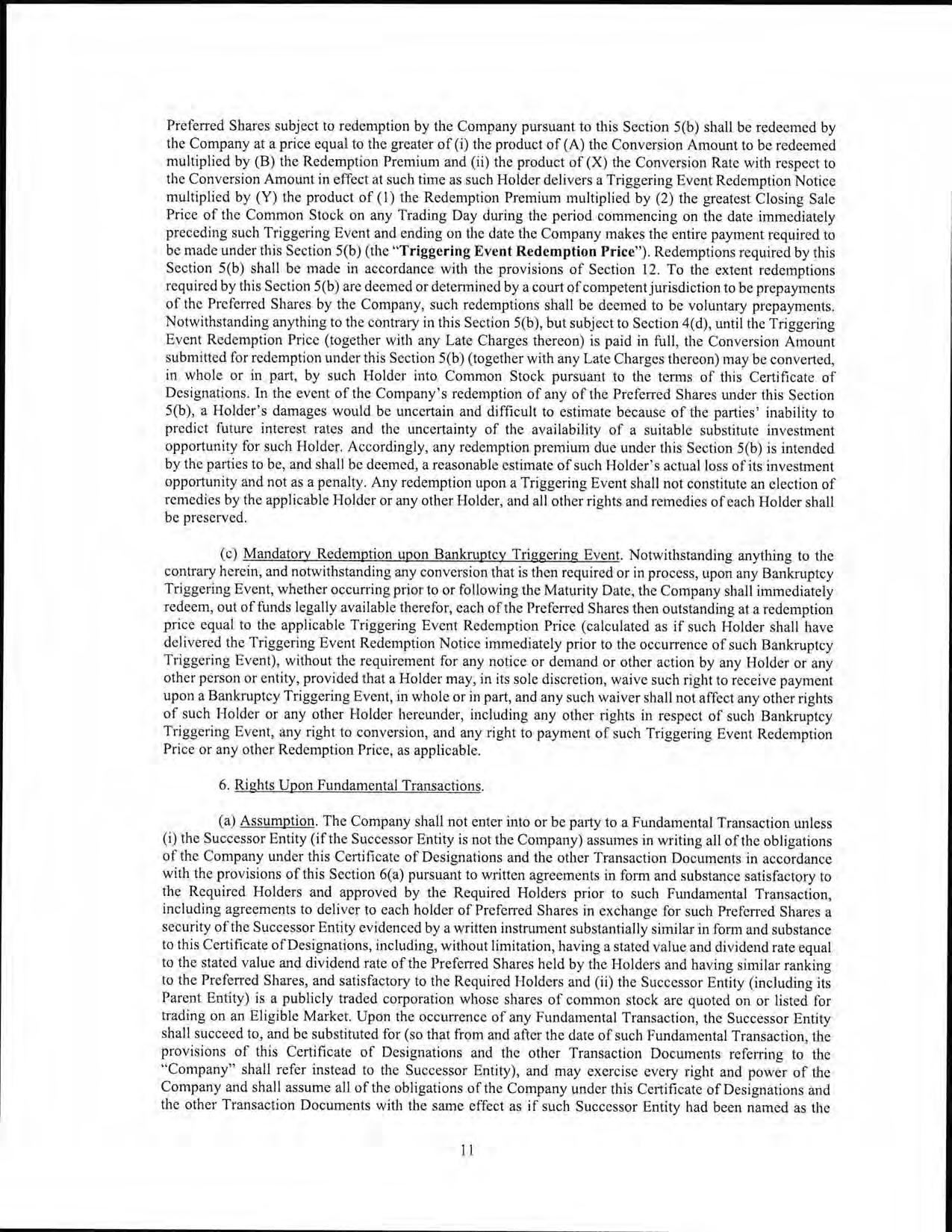 Preferred Sbares subject to redemption by the Company pursuant to this Section S(b) shall be redeemed by the Company at a price equal to the greater of (i) the product of (A) the Conversion Amount to be redeemed multiplied by (B) the Redemption Premium and (ii) the product of (X) the Conversion Rate with respect to the Conversion Amount in effect at such time as such Holder delivers a Triggering Event Redemption Notice multiplied by (Y) the product of (l) the Redemption Premium multiplied by ( 2 ) the greatest Closing Sale Price of the Common Stock on any Trading Day during the period commencing on the date immediately preceding such Triggering Event and ending on the date the Company makes the entire payment required to be made under this Section S(b) (the " T ri gge rin g Event Redemption Price") . Redemptions required by this Section S(b) shall be made in accordance with the provisions of Section 12 . To the extent redemptions required by this Section S(b) are deemed or detennined by a court of competent jurisdiction to be prepayments of the Preferred Shares by the Company, such redemptions shall be deemed to be voluntary prepayments . Notwithstanding anything to the contrary in this Section S(b), but subject to Section 4 (d), until the Triggering Event Redemption Price (together with any Late Charges thereon) is paid in full, the Conversion Amount submined for redemption under this Section 5 (b)(together with any Late Charges thereon) may be converted, in whole or in part, by such Holder into Common Stock pursuanl to the terms of this Certificate of Designations . In the event of the Company's redemption of auy of the Preferred Shares under this Section S(b), a Holder's damages would be uncertain and difficult to estimate because of the parties' inability to predict future interest rates and the uncertain t y of the availability of a suitable substitute investment opportunity for such Holdcc . Accordingly, any redemption premium due under this Section 5 (b) is i n tended by the parties to be, and shall be deemed, a reasonable estimate of such H older ' s actual loss of its investment opportunity and not as a penalty . Any redemption upon a Triggering Event shall not constitute an election of remedies by the applicable Holder or any other Holder, and all other rights and remedies of each Holder shall be preserved . (c) Mandatory Redemption upon Bankruptcy Triggering Event . Notwithstanding anything to the contrary herein, and notwithstandingany conversion that is then required or in process, upon any Bankruptcy Triggering Event, whether occurring piior to or following the Maturity Date, the Company shall immediately redeem, out of funds legally available therefor, each of the Preferred Shares then outstanding at a redemption price equal to tbc applicable Triggering Event Redemption Price (calculated as if such Holder shall have delivered the Triggering Event Redemption Notice immediately prior to the occu 1 Tence of such Bankruptcy Triggering Event), without the requirement for any notice or demand or other action by any Holder or any other person or entity, provided that a Holder may, in its sole discretion, waive such right to r e ceive payme 11 t upon a Bankruptcy Triggering Event, in whole or in part, and anysuch waiver shall not affect any other rights of such Holder or any other Holder hereunder, including any other rights in respect of such Bankruptcy Triggering Event, any right to conversion, and any right to payment of such Triggering Event Redemption Price or any other Redemption Price, as applicable . 6 . Rights Upon Fundamental Transactions . (a) Assumption . The Company shall 1101 enter into or be pa 11 y to a Fundamental Transaction unless (i) the Successor Entity (if the Successor Entity is not the Company) assumes in writing all of the obligations of the Company under this Certificate of Designations and the other Transaction Documents in accordance with the provisions of this Section 6 (a) pursuant to written agreements in form and substance satisfactory to the Required Holders and approved by the Required Holders prior to such Fundamental Transaction, including agreements to deliver to each holder of Prefen - ed Shares in exchange for such Prefen - ed Shares a security of the Successor Entity evidenced by a written instrument substantially similar in form and substance to this Certificate of Designations, including, without limitation, having a slated value and dividend rate equal to the stated value and dividend rate of the Preferred Shares held by the Holders and having similar ranking to the Preferred Shares, and satisfactory to the Required Holders and (ii) the Successor Entity (including its Parent Entity) is a publicly traded corporation whose shares of common stock arc quoted on or listed for rrading on an Eligible Market . Upon the occun - encc of any Fundamental Transaction, the Successor Entity shall succeed to, and be substituted for (so that from and after the date of such Fundamental Transaction, tl 1 e provisions of this Certificate of Designations and the other Transaction Documents referring to the ''Company" shall refer instead to the Successor Entity), and may exercise every right and power of the Company and shal I assume all of the obligations of the Company under this Ce 11 ificate of Designations and the other Transaction Documents with the same effect as if such Successor Entity had been named as the 11