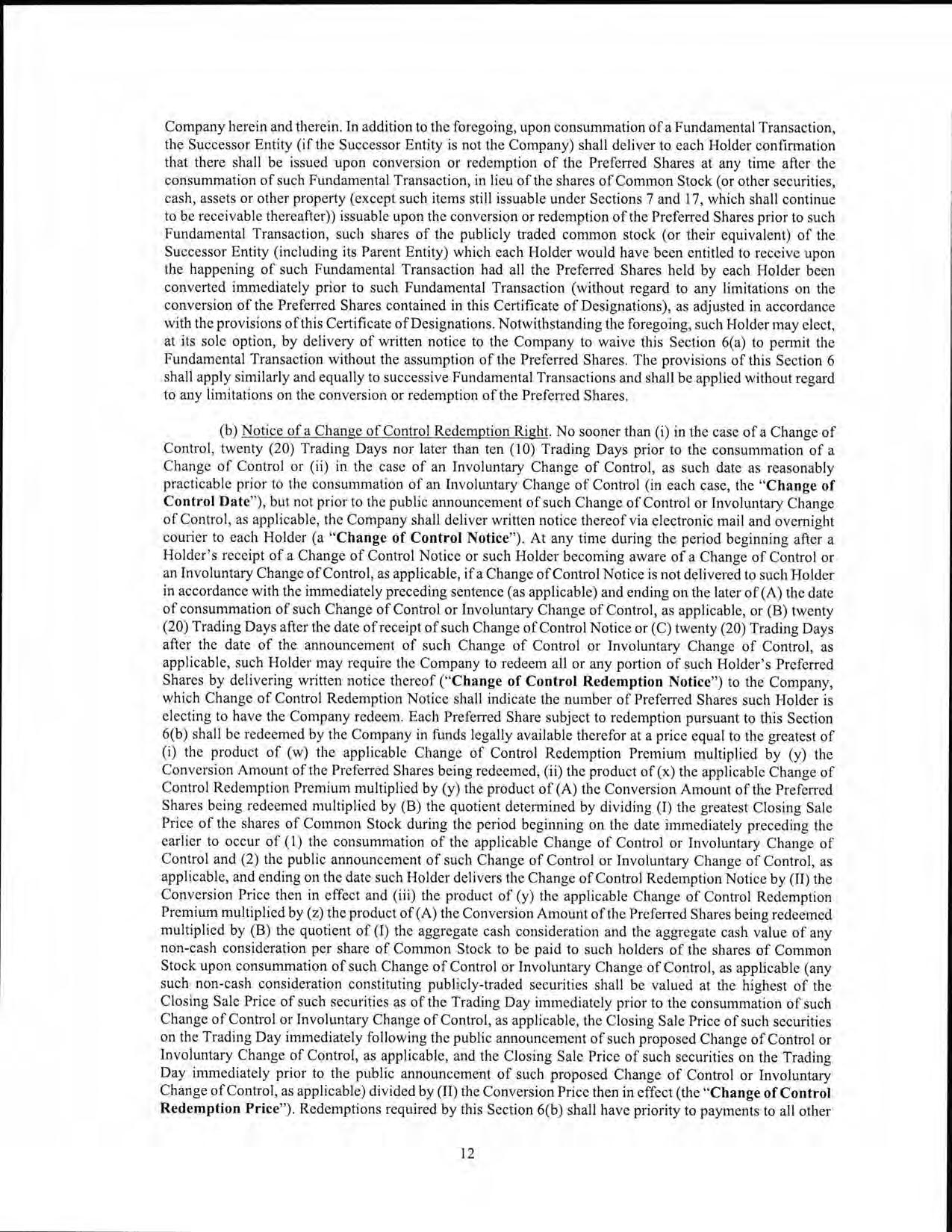Company herein and therein . In addition to the foregoing, upon consummation of a Fundamental Transaction, the Successor Entity (if the Successor Entity is not the Company) shall deliver to each Holder confinnation that there shall be issued upon conversion or redemption of the Preferred Shares at any time after t he consummation of such Fundamental Transact i on, in lieu of the shares of Common Stock (or other securities, cash, assets or other property {except such items still issuable under Sections 7 and 17 , which shall continue to be receivable thereafter)) issuable upon the conversion or redemption of the Preferred Shares prior to such Fundamenta l Transaction, such shares of the publicly traded common stock (or their equivalent) of the Successor Entity (including its Parent Entity) which each Holder would have been entitled to receive upon the happening of such Fundamental Transaction had all the Preferred Shares held by each Holder been converted immediately prior to such Fundamental Transaction (withou t regard to any limitations on the conversion of the Preferred Shares contained in this Certificate of Designations), as adjusted in accordance with the provisions of this Certificate of Designations . Notwithstanding the foregoing . such Holder may elect, at its sole option, by delivery of written notice to the Compa n y to waive this Section 6 (a) to pcnnit the Fundamental Transaction without the assumption of tho Preferred Shares . The provisions of this Section 6 shall apply similarly and equally to successive Fundamental Transactio n s and shall be applied without regard to any limitations on the conversion or redemption of the Prefcncd Shares, (b) Notice of a Change of Control Redemption Right . No sooner t b an (i) io the case of a Change of Control, twenty ( 20 ) Trading Days nor later than ten ( 10 ) Trading Days prior to the consumma t ion of a Change of Control or (ii) in the case of an Involuntary Change of Control, as such date as reasonably practicable prior to the consummation of an Involuntary Change of Contro l (in each case, the " C han ge of Control Date"), but not prior to the public announcemen t of such Change of Control or Involuntary Change of Control, as applicable, t he Company shall deliver written notice thereof via electronic mail and overnight courier to each Holder (a ''C h a n ge of Control Notice") . At any time during the period beginning after a Holder's receipt of a Change of Control Notice or such Holder becoming aware of a Change of Control or an fnvoluntary Change of Control, as applicable, ifa Change of Control Notice is not delivered to such Holder in accordance with the immediately preceding sentence (as applicable) an<l ending on the laterof(A) the date of consummation of such Change of Control or I nvoluntary Change of Control, as applicable, or (B) twenty ( 20 ) Trading Days after the date of receipt of such Change of Control Notice or (C) twenty ( 20 ) Trading Days after the date of the announcement of such Change of Control or Involuntary Change of Control, as applicable, such Holder may require the Company to redeem all or any portion of such Ho l der ' s P r eferred Shares by delivering written notice thereof ("C h a n ge of Control Redemption Notice") to the Company, which Change of Control Redemption Notice shall indicate the number of Prefe 1 Ted Shares such Holder is electing t o have the Company r edeem . Each Preferred Share subject to redemption pursuant to U 1 is Section 6 (b) shall be redeemed by the Company in funds legally available therefor at a price equal to the greatest of (i) the product of (w) the applicable Change of Contro l Redemption Premium multiplied by (y) the Conversion Amount of the Preferred Shares being redeemed, (ii) the product of (x) the applicable Change of Control Redemption Premium multiplied by (y) the product of (A) the Conversion Amount of the Preferred Shares being redeemed multiplied by ( 8 ) the quotient detem 1 ined by dividing ([) the greatest Closing Sale Price of the shares of Common Stock during the period beginning on the date immediately preceding the earlier to occur of (I) the consummation of the applicable Change of Control or fnvoluntary Change of Control and ( 2 ) the public announcement of such Change of Control or Involuntary Change of Control, as applicable, and ending on the <late such Holder delivers the Change of Control Redemption Notice by ( 11 ) the Conversion Price then in effect and (iii) the product of (y) the applicable Change of Contrnl Redemption Premiwn multiplied by (z) the product of (A) the Conversion Amoilnl oft he Preferred Shares being redeemed multiplied by (B) the quotient of (I) the aggregate cash consideration and the aggregate cash value of any non - cash consideration per share of Common Stock to be paid to such holders of 1 he shares of Common Stock upon consummation of such Change of Control or Involuntary Change of Control, as applicab l e (any such non - cash consideration constituting publicly - traded securities shall be valued at the highest of the Closing Sale Price of such securities as of the Trading Day immediately prior to the consummation of such Change of Control or Involuntary Change of Control, as app l icable , the Closing Sale Price of such securities on the Trading Day immediately following the public announcement of such proposed Change of Control or Involuntary Change of Control, as applicable, and the Closing Sale Price of such securities on the Trading Day immediately prior to the public announcemen t of such proposed Change of Control or Involuntary Change of Control, as applicable) divided by (fl) the Conversion Price then in effect (the "C han ge of Control Redemption Price") . Redemptions required by this Section 6 (b) shall have priority to payments to all other 12