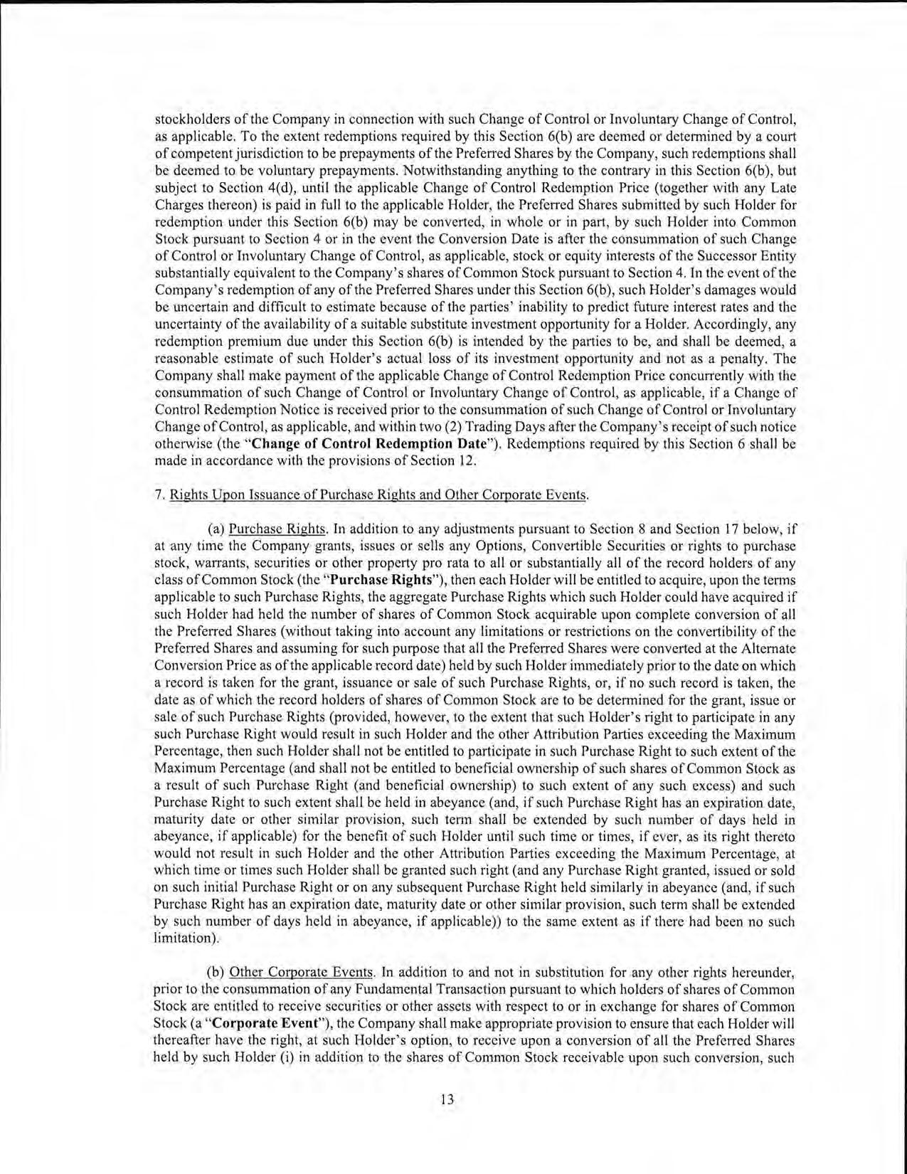 stockholders of the Company in connection with such Change of Control or Involuntary Change of Control, as applicable . To the extent redemptions required by this Section 6 (b) are deemed or determined by a court of competent jurisdiction to be prepayments of the Preferred Shares by the Company, such redemptions shall be deemed to be voluntary prepayments . Notwithstanding anything to the contrary in this Section 6 (b), but subject to Section 4 (d), until the applicable Change of Control Redemption Price (together with any Lale Charges thereon) is paid in full to the applicable Holder , the Preferred Shares submitted by such Holder for redemption under this Section 6 (b) may be converted, in whole or in part , by such Holder into Common Stock pursuant to Section 4 or in the event the Conversion Date is after the consummation of such Change of Conu · ol ot I nvoluntary Change of Control, as applicable, stock or equity interests of the Successor Entiry substantially equivalent to the Company's shares of Common Stock pursuant to Section 4 . In the event of the Company's redemption of any of the Preferred Shares under this Section 6 (b), such Holder's damages would be uncertain and difficult to estimate because of the parties' inability to predict future interest rates and the uncertainty of the availability of a suitable substitute investment opportunity for a Holder . Accordingly, any redemption premium due under this Section 6 (b) is intended by the parties to be, a n d shall be deemed, a reasonable estimate of such Holder's actual loss of its investment opportunity and not as a penalty . The Company shall make payment oftbe applicable Change of Control Redemption Price concurrently with 1 he consummation of such Change of Control or Involuntaiy Change of Control, as applicable, if a Change of Control Redemption Notice is received prior to the consummation of such Change of Control or Involuntary Change of Control, as applicable, and within two( 2 ) Trading Days after the Company's receipt of such notice otherwise (the ''Change of Control Redemption Date' ') , Redemptions required by this Section 6 shall be made in accordance with the provisions of Section 12 . 7. Rights Upon Issuance of Purchase Rights and Other Corporate Events. (a) Purchase Rights . In addition to any adjustments pursuant to Section 8 and Section 17 below, if at any time the Company grants, issues or sells any Options , Convertible Securities or rights to purchase stock, waITants, securities or other property pro rata to all or substantially all of the record holders of any class of Common Stock (the " Purcha se Rights''), then each Holder will be entitled to acquire, upon the terms applicable to such Purchase Rights , the aggregate Purchase Rights which such Holder could have acquired if such Holder had held the number of shares of Common Stock acquirable upon complete conversion of all the Preferred Shares (without taking into account any limitations or restrictions on the convertibility of the PrefcITed Shares and assuming for such purpose that all the Preferred Shares were converted at the Alternate Conversion Price as of the appl i cab l e record date) held by such Holder immediately prior to the date on which a record is taken for the grant, issuance or sale of such Purchase Rights, or, if no such recotd is taken , the date as of which the record holders of shares of Common Stock are to be determined for the grant, issue or sale of such Purchase Rights (provided, however, to the extent that such Holder's right to participa t e in any such Purchase Right would result in such Holder and tho other Attribution Parties exceeding the Maximum Percentage, then such Holder shall not be entitled to participate in such Purchase Right to such extent of the Maximum Percentage (and shall not be entitled to beneficial ownership of such shares of Common Stock as a resu l t of such Purchase Right (and beneficial ownership) to such exten t of any such excess) and such Purchase Right to such extent shall be held in abeyance (and, if such Purchase Right has an expiration date , maturity date or other simi l ar provision , such t enn sha'll be extended by such number of days held in abeyance, if applicable) for the benefit of such Holder until such time or times, if ever, as its right thereto would not result in such Holder and the other Attribution Parties exceeding the Maximum Percentage, at which time or times such Holder shall be granted such right (and any Purchase Right granted, issued or sold on such initial Purchase Right or on any subsequent Purchase Right held similarly in abeyance (and, if such Purchase Right has an expiration date, maturity date or other similar provision, such term shall be extended by such number of days held in abeyance, if applicable)) to the same extent as if there had been no such limitation) . (b) Other Corporate Events . I n addition to and not in substitution for any other rights hereunder, prior to the consummation of any Fw 1 damental Transaction pursuant to which holders of shares of Common Stock are entitled to receive securities or other assets with respect lo or in exchange for shares of Common Stock (a " Co rporat e Eve nt ") , the Company shall make appropriate provision to ensure that each Holder will thereafter have the right, at such Holder's option, to receive upon a conversion of all the PrefetTed Shares held by such Holder (i) in addition to the shares of Common Stock receivable upon such conversion, such 13