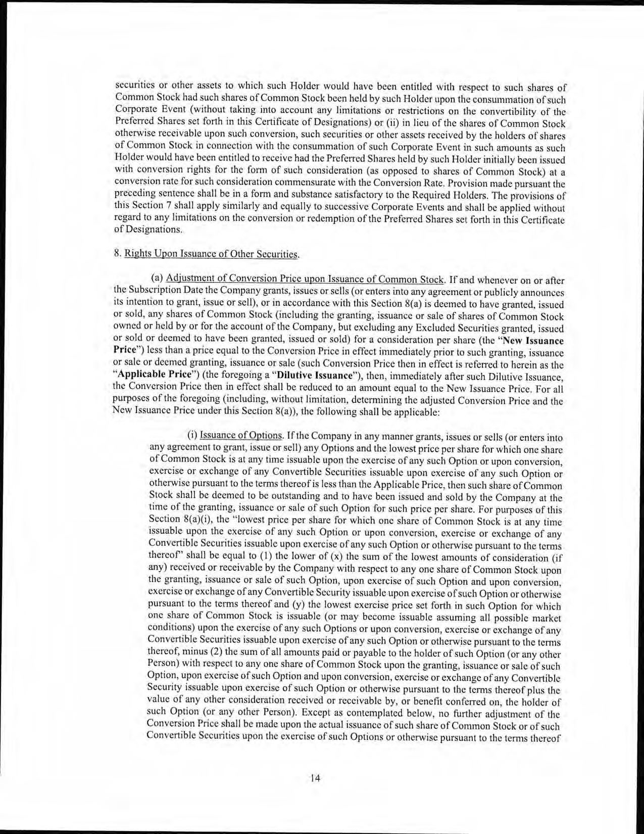 securities or other assets to which such Holder would have been entitled with respect to such shares of Common Stock had such shares of Common Stock been held bysuch Holder upon the consummation of such Corporate Event (without taking into account any limitations or restrictions on the convertibility of the Preferred Shares set forth in this Certificate of Designations) or (ii) in lieu of the shares of Common Stock otherwise receivable upon such conversion, such securities or other assets received by the holders of shares of Common Stock in connection with the consummation of such Corporate Event in such amounts as such Holder would have been entitled to receive had the Prefen - ed Shares held by such Holder initially been issued with conversion rights for the form of such consideration (as opposed to shares of Common Stock) at a conversion rate for such consideration commensurate with the Conversion Rate . Provision made pursuant the preceding sentence shall be in a form and substance satisfactory to the Required Holders . The provisions of th i s Section 7 shall apply similarly and equally to successive Corporate Events and shall be applied without regard to any limitations on the conversion or redemption of the Preferred Shares set forth in this Certificate of Designations . 8. Rights Upon Issuance of Other Securities. (a) Adjustmeni of Conversion Price upon Issuance of Common Stock . If and whenever on or after the Subscription Date the Company grants, issues or sells (or enters into any agreement or publicly announces its intention to grant, issue or sell), or in accordance with this Sectioo 8 (a) is deemed to have granted . issued or sold, any shares of Common Stock (including the granting, issuance or sale of shares of Common Stock owned or held by or for the account of the Company, bu t excluding any Excluded Securities granted, issued or sold or deemed to have been granted, issued or sold) for a consideration per share (the "New Issuance Price'') less than a pdce equal to the Conversion Price in effect immediately prior to such granting, issuance or sale or deemed granting, issuance or sale (such Conversion Price then in effect is referred to herein as the "A ppli ca bl e Pri ce ' ') (the foregoing a " Diluti ve 1 ss uan cc"), then, immediately after such Dilutive Issuance , the Conversion Price then in effect shall be reduced to an amount equal to the New Issuance P r ice , For all purposes of the foregoing (inc l uding, without limitation, detc 1 mining the adjusted Conversion Price and the New Issuance Price under this Section 8 (a)), the following shall be applicable : (i) Issuance of Options. If the Company in any manner grants, issues or sells (or enters into any agreement to grant, issue or sell) any Options and the lowest price per share for which one share of Common Stock is at any time issuable upon the exercise of any such Option or upon conversion, exercise or exchange of any Convertible Securities issunblc upon exercise of any such Option or otherwise pursuant to the t - erms thereof is less than the Applicable Price , then such shareof Common Stock shall be deemed to be outstanding and to have been issued and sold by the Company at the time of the granting, issuance or sale of such Option for such price per share. For purposes of this Section 8(a)(i), the " lowest price per share for which one share of Common Stock is at any time issuable upon the exercise of any such Option or upon conversion, exercise or exchange of aoy Convertible Securities issuable upon exercise of anysuch Option or otherwise pursuant to tJ1e terms thereof" shall be equal to (I) the lower of (x) the sum of the lowest amounts of consideration (if any) received or receivable by the Company with respect to any one share of Common Stock upon the granting, issuance or sale of such Option, upon exercise of sucb Option and upon conversion, exercise or exchange of any Convertible Security issuable upon exercise of such Option or otherwise pursuant to the terms thereof and (y) the lowest exercise price set forth in such Option for which one share of Common Stock is issuable (or may become issuable assuming all possible market conditions) upon the exercise of any such Options o r upon conversion, exercise or exchange of any Convertible Secttrities issuable upon exercise of any such Option or otherwise pursuant to the tcm1s thereof, minus (2) the sum of all amounts paid or payable to the holder of such Option (or any other Person) with respect to any one share of Common Stock upon the granting, issuance or sale of such Option, upon exercise of such Option and upon conversion, exercise or exchange of any Convertible Security issuable upon exercise of such Option or otherwise pursuant to the tem1s thereof plus the value of any other consideration received or receivable by, or benefit confe1Ted on, the holder of such Option (or any other Person). Except as contemp l ated below , no further adjustment of the Conversion Price shall be made upon the actual issuance of such share of Common S t ock or of such Convertible Securities upon the exercise of such Options or otherwise pursuant to the tenllS thereof 14