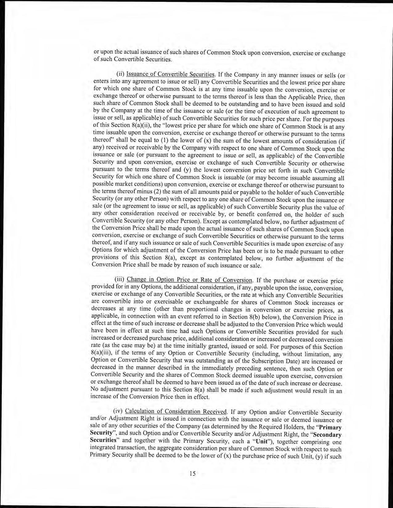 or upon the actual issuance of such shares of Common Stock upon conversion, exercise or exchange of such Convertible Securities . (ii) Issuance of Convertible Securities. If the Company in any manner issues or sells (or enters in t o any agreement to issue or sell) any Convertible Securities and the lowest price per share for which one share of Common Stock is at any time issuable upon the conversion, exercise or exchange thereof or otherwise pursuant to the terms thereof is less than the Applicable Pri ce , then such share of Common Stock shall be deemed to be outstanding and t.o have been issued and sold by the Company at the time of the issuance or sale (or the time of execution of such agreement to issue or sell, as applicable) of such Convertible Securities for such price per share. For the purposes of this Section 8(a)(ii), the "lowest price per share for which one share of Common Stock is at any time issuable upon the conversion, exercise or exchange thereof or otherwise pursuant to the tenns thereof" shall be equal to (I) the lower of (x) the sum of the lowest amounts of consideration {if any) received or receivable by the Company with respect to one share of Common Stock upon the issuance or sale (or pursuant to the agreement to issue or sell, as applicable) of the Convertible Security and upon conversion , exercise or exchange of such Convertible Security or otherwise pursuant to the terms thereof and (y) the lowest conversion price set forth in such Convertible Security for which one share of Common Stock is issuable (or may become issuable assuming all possible market conditions) upon conversion, exercise or exchange thereof or otherwise pursuant to the terms thereof minus (2) the sw11 of all amounts paid or payable to the holder of such Convertible Security (or any other Person) with respect to any one share of Common Stock upon the issuance or sale (or the agreement to issue or sell, as applicable) of such Convertible Security plus the value of any other consideration received or receivable by, or benefit conferred on, the holder of suc]1 Convertible Security (or any other Person). Except as contemplated below, no further adjustment of the Conversion Price shall be made upon the actual issuance of such shares of Common Stock upon conversion, exercise or exchange of such C011vertible Securities or otherwise pursuant to the tenns thereof, and if any such issuance or sale of such Convertib l e Securities is made upon exercise of any Options for which adjustment of the Conversion P rice has been or is to be made pursuant to other provisions of this Section 8(a), except as contemp l ated below, no further adjustment of the Conversion Price shall be made by reason of such issuance or sale. (iii) Change in Option Price or Rate of Conversion . lf the purchase or exerc i . se price provided for in any Options , the additional consideration, if any, payable upon the issue, conversion, exercise or exchange of any Convertible Securities , or the rate at which any Convertible Securities are convertible into or exercisable or exchangeable for shares of Common Stock increases or decreases at any time (other than proportional changes in conversion or exercise prices , as applicable, in connection with an event referred to in Section 8 (b) below), the Conversion Price in effect at the time of such increase or decrease s h all be a<ljusted to the Conversion Price which would have been in effect at such time had such Options or Convertible Securities provided for such increased or decreased pw·chase price , additional consideration or increased or decreased conversion rate (as the case may be) at the time initially granted, issued or sold . For purposes of this Section 8 (a)(iii), if the tem 1 s of any Option or Convertib l e Security (including, without limitation , any Option or Convertib l e Security that was outstanding as of the Subscription Date) are increased or decreased in the manner described in the immediately preceding sentence, then such Option or Convertible Security and the shares of Common Stock deemed issuable upon exercise, conversion or exchange thereof shall be deemed to have been issued as of the date of such increase or decrease . No adjustment pursuant to this Section 8 (a) shall be made if such adjustment would result in an increase of the Conversion Price then in effect . (iv) Calculation of Consideration Received . If any Option and/or Convertible Security and/or Adjustment Right is issued in connection with the issuance or sale or deemed issuance or sale of any other securities of the Company (as detennined by the Required Holders, the " Primar y Security", and such Option and/or Convertible Security and/or Adjustment Right, the "Secondary Securities'' and together with the Primary Security, each a " U nit "), together comprising one integra t ed transaction, the aggregate consideration per share of Common Stock with respect to such Primary Security shall be deemed to be the lower of (x . ) the purchase price of such Unit, (y) if'such 15