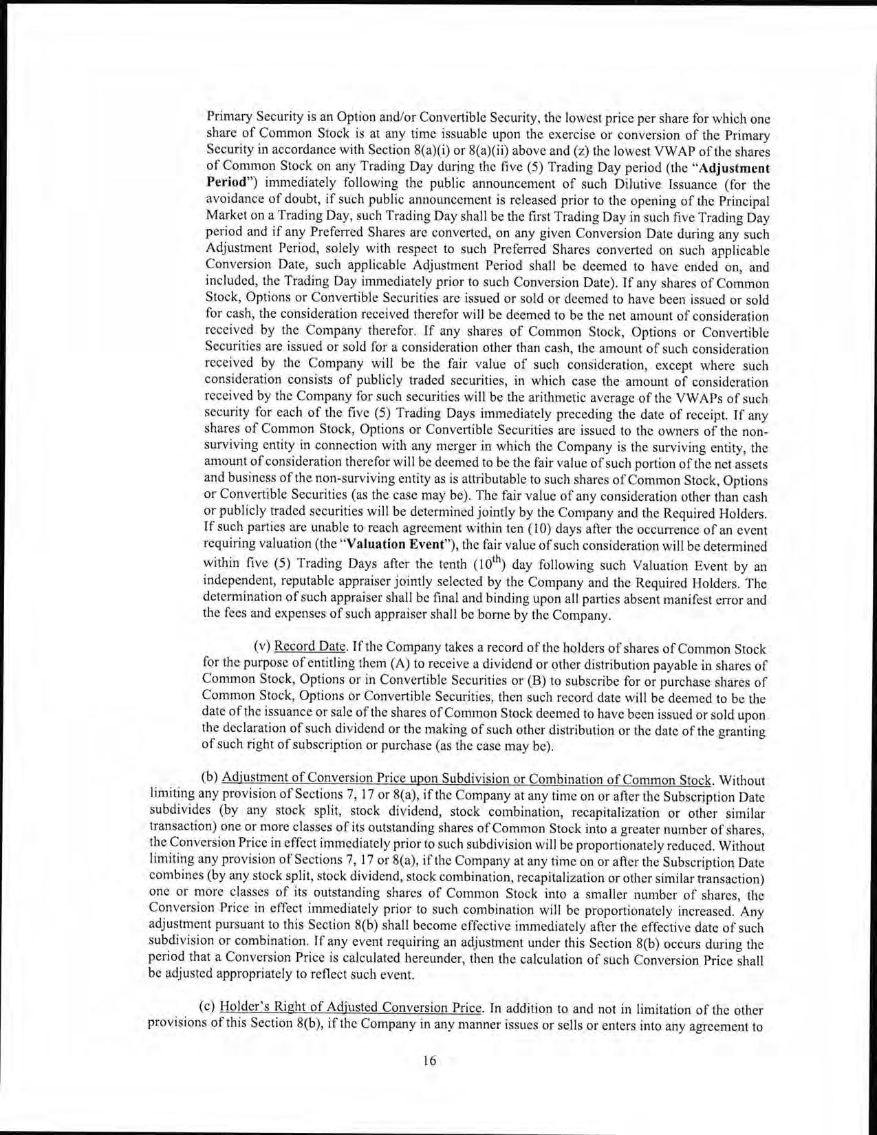 Primary Security is an Option and/or Convertible Security, the lowest price per share for which one share of Common Stock is at any time issuable upon the exercise or conversion of the Primary Security in accordance with Section 8(a)(i) or 8(a)(ii) above and (z) the lowest VWAP of the shares of Common Stock on any Trading Day during the five (5) Trading Day period (the " A d j u st me n t Pe ri o d ") immediately following the public announcement of such Dilutive Issuance (for the avoidance of doubt, if such public announcement is released prior to the opening of the Principal Market on a Trading Day, such Trading Day shall be the first Trading Day in such five Trading Day period and if any Preferred Shares are converted, on any given Conversion Date during any such Adjustment Period, solely with respect to such Preferred Shares converted on such applicable Conversion Date, such app l icable Adjustment Period shall be deemed to have ended on, and included, the Trading Day immediately prior to such Conversion Date). lf any shares of Common Stock, Options or Convertible Securities are issued or sold or deemed to have been issued or sold for cash, the consideration received therefor will be deemed to be the net amount of consideration received by the Company therefor. If any shares of Common Stock, Options or Convertible Securities are issued or sold for a consideration other than cash, the amount of such considera t ion received by the Company will be tbe fair value of such consideration, except where such consideration consists of publicly traded securities, in w h ich case the amount of consideration received by the Compahy for such securities will be the arithmetic average of the VWAPs of such security for each of the five (5) Trading Days immediately preceding the date of receipt. If any shares of Common Stock, Options or Convertible Securities arc issued to the owners of t he non surviving entity in connection with any merger in which the Company is the surviving entity, the amount of consideration therefor will be deemed to be the fair value of such portion of the net assets and business of the non - surviving entity as is attributable to such shares of Common Stock. Options or Convertible Securities (as the case may be). The fair value of any consideration other than cash or publicly rraded securities will be determined jointly by the Company a n d the Required Holders. If such parties are unable to reach agreement within t en ( 10) days after the occtm·encc of an event requiring valuation (the " Va lu a t i on Event''), the fair value of such consideration will be determined within five ( 5 ) Trading Days after the tenth ( 10 111 ) <lay following such Valuation Event by an independent , reputable appraiser jointly selected by the Company and the Required Holders . The determination of such appraiser shall be final and bincling upon all parties absent manifest error an<l the fees and expenses of such appraiser shall be borne by the Company . (v) Record Date . If the Company takes a r ecord of the holders of shares of Commo n Stock for the purpose of entitling them (A) to receive a dividend or o t her distribution payable in shares of Common Stock, Options or in Convertible Securities or ( 8 ) to subscribe for or purchase shares of Common Stock, Options or Convertible Securities , then such record date will be deemed to be tbe date of the issuance or sale of the shares of Common Stock deemed to have been issued or sold upon the dcclarn,tion of such dividend or the making of such other distribution or the date of the granting of such right of subscription or purchase (as the case may be) . (b) Adjushnent of Conversion Price upon Subdivision or Combination of Common Stock . Without limiting any provision of Sections 7 , 17 or 8 (a), if the Company at any time on or after the Subscription Date subdivides (by any stock split, stock dividend, stock combination, recapitalization or other similar transaction) one or more classes of its ou t stand i ng shares of Common Stock into a greater number of shares, the Conversion Price in effect immediately prior tosuch subdivision will be proportionately reduced . Without limiting any provision of Sections 7 , 17 or 8 (a), il'the Company at any time on or after the Subscription Date combines (by any stock split,stock dividend, stock combination, recapitaliza t ion or other s imi l ar transaction) one or more classes of its outstanding shares of Common Stock into a smaller number of shares, the Conversion Price in effect immediately prior to such combination will be proportionately increased . Any adjustment pursuant to this Section 8 (b) shall become effective immediately after the effective date of such subdivision or combination, If any event requiring an adjusbncnt under this Section 8 (b) occurs during the period that a Conversion Price is calculated hereunder, then the calculation of such Conversion Price shall be adjusted appropriately to reflect such event . {c) Holder's Right of Adjusted Conversion Price . In addition to an<l not in l i mitation of the other provisions of this Sect i on 8(b), if the Company in any manner issues or sells or enters into any agreement to 16