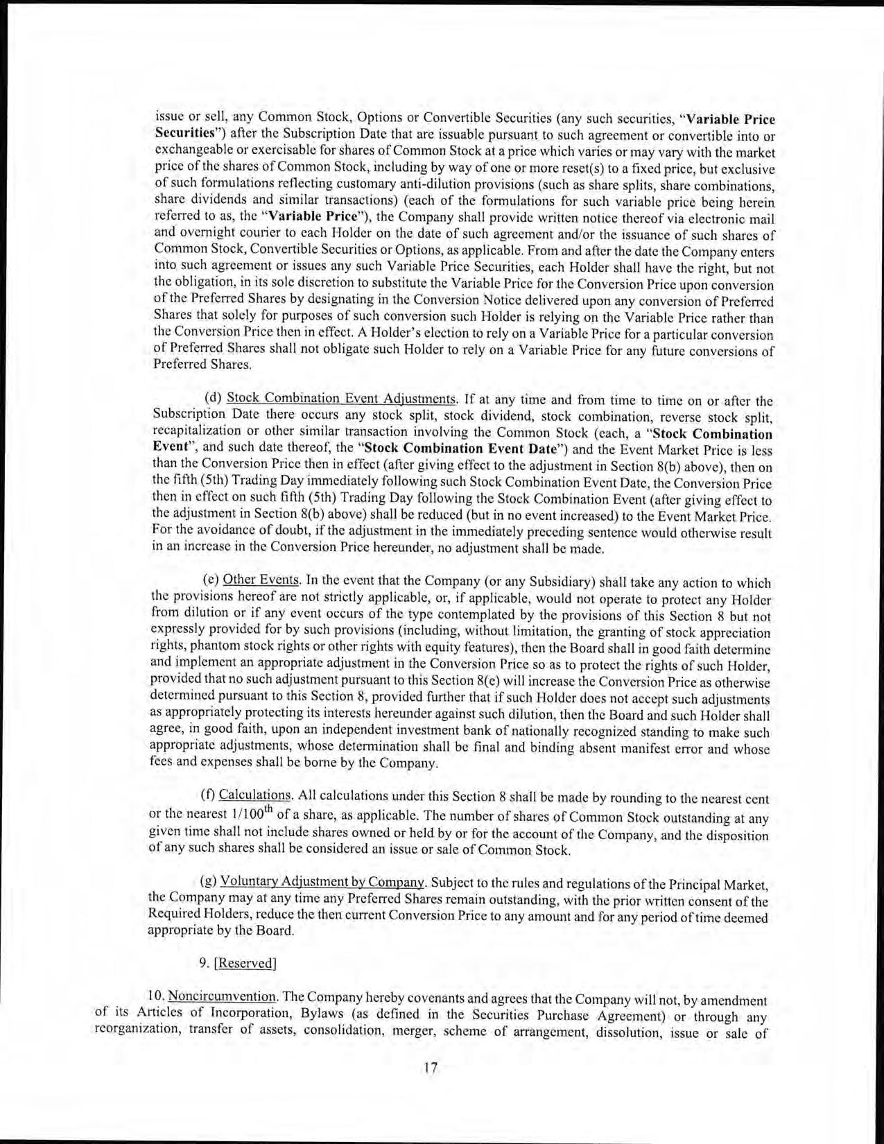 issue or sell, any Common Stock , Options or Convertible Securities (any such securities, "Va riabl e Price Secur ities ") after the Subscription Date that are issuable pursuant to such agreement or convertible into or exchangeable or exercisable for shares of Common Stock at a p r ice which varies or may vary with the market price of the shares of Common Stock, including by way ofone or more reset(s) to a fixed price, but exclusive of such fonnulations reflecting customary an t i - dilution prov i sions (such as share splits, share combinations, share dividends and similar transactions) (each of th e fonnulations for such variable price being herein referred to as, the " Variable Price ''), the Company shall provide written notice thereof via electronic mail and overnight comier to each Holder on the date of such agreement and/or the issuance of such shares of Common Stock, Convert ibl e Secu ri ties or Options, as applicable . From and after the date the Company enters into such agreement or issues any such Variable Price Securities, each Holder shall have the right , but not the obligation, in its sole discretion to substitute the Variable Price for the Conversion Price upon conversion of the Pr efcrTed Shares by des i gnating in the Conversion Notice delivered upon any conversion of Preferred Shares that solely for purposes of such conversion such Holder is relying on the Variable Price rather than the Conversion Price then in effect . A H older's elect i on to rely on a Variab l e Price for a particular conversion of Preferred Shares shall 1101 obligate s u ch Holder to rely on a Variable Price for any future conversions of Preferred Shares . (d) Stock Combination Event Adjustments . If at any time and from time to time on or after th e Subscription Date there occurs any stock split, stock dividend, stock combination, reverse stock split . recapitalization or other similar transaction involving the Common Stock (eac h , a "S tock Co mbin at i o n Eve nt ", and such date t here of, the " Stock Co mbinati o n Eve nt D a te ") and the Event Market Price is less than the Conversion Price th en in effect (after giving effect to the adjustment in Section 8 (b} above), then 011 the fifth ( 5 th) Trading Day immediately fo llowin g such Stock Combination Event Date , the Conve r sion Price then in effect on such fifth ( 5 th) Trading Day following the Stock Comb in ation Event (after giving effec t to the adjustment in Section 8 (b) above) shall be reduced (bu t in no event increased) to the Event Ma r ket Price . For the avoidance of doubt, if the adjustment in the immediately preceding sentence would othcnvise result in an increase in the Conversion Price hereunder, no adjustment shall be made . (e) Other Events . ln tJ 1 e even t that the Company (or any Subsidiary) shall take any action to which the pro vis ions h e reof are not strict l y applicable, or, if applicable, would not operate to protect any Holder from dilution or if any event occurs of the type contempla t ed by the provisions of this Section 8 but not expressly provided for by such provisions (including, without limitation , th e granting of stock appreciation rights, phantom stock rights or other rights with equity features), then the Board shall in good faith detennine and implement an appropriate adjustment in the Conversion Pdce so as to protect the rights of such Holder , provided that no such adjustme n t pursuant to this Section 8 (e) will inc r ease the Conversion Price as otherwise determined pursuant to this Section 8 , provided further that if such Holder does not a ccep t such adjustments as appropriately protecting its interests hereunder against such dilution, then t he Board and such Holder shall agree, in good faith, upon an independent investment bank of n &tionally recognized s t anding to make such appropriate adjus tm ents, whose detcnnination shall be final and binding absent manifest error and whose foes and expenses shall be borne by the Company . {t) Calculations. All calculations under this Section 8 shall be made by rounding to the nearest cent or the nearest l / l00 1h of a share, as applicable. The number of shares of Common Stock outstancting at any given time s hall not include shares owned or held by or for the account of the Company, and the disposition of any such shares shall be considered an issue or sale of Common Stock . (g) Voluntary Adjustment by Company . Subject to the rules and regulations of the Principal Market, the Company may at any time any Preferred Shares remain outstanding, with the prior writ t en consent of the Required Holders , reduce the then current Conversion Price t o any amow,t and for any period of time deemed appropriate by the Board . 9. (Reserved] I0 , Noncirewnvention . The Company hereby covenants and agrees that the Company will not, by amendment of its Articles of Incorporation , Bylaws (as defined in t11e Securities Purchase Agreement) or through any rcorga 11i zation, transfer of assets, consolidation, merger, s chem e of arrangement, dissolution, issue or sa l e of 17