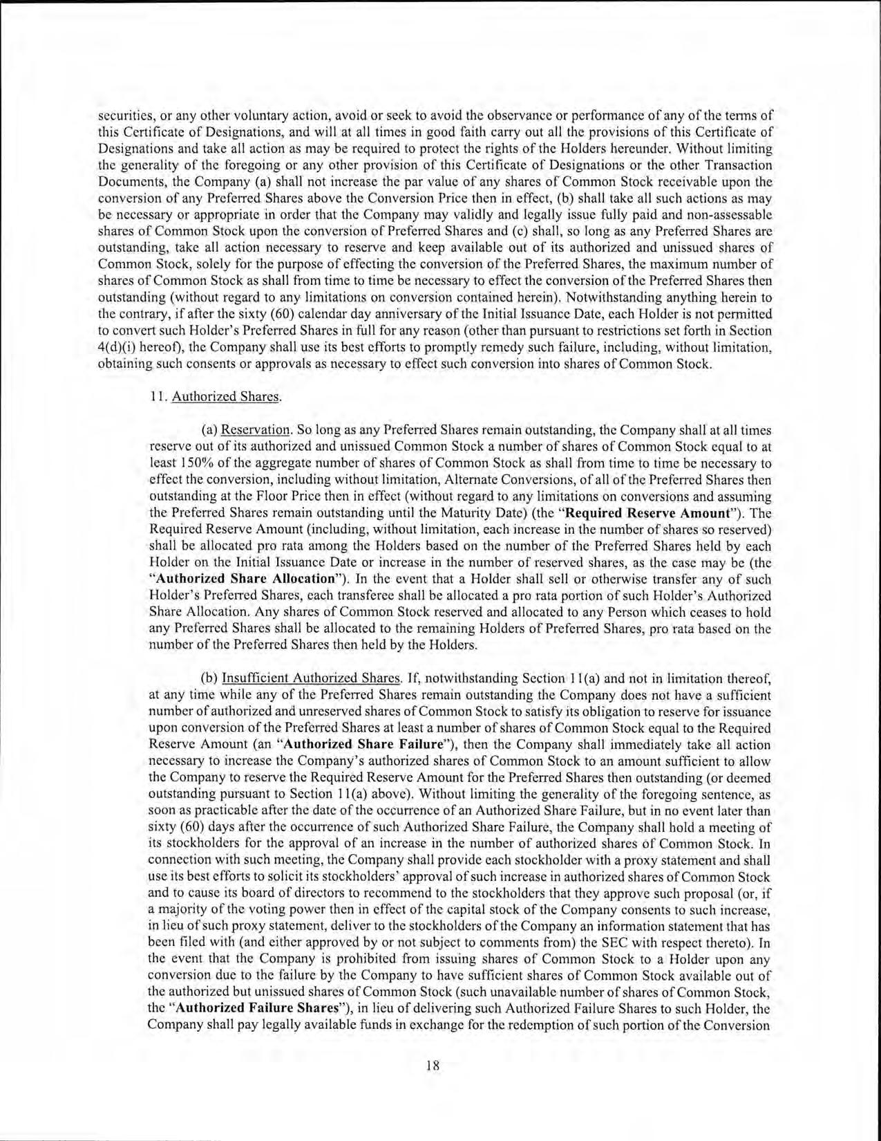 securities, or any other voluntary action, avoid or seek to avoid the observance o r perfom 1 ance of any of the te 11 ns of this Certificate of Designations, and will at all times in good faith carry out all the provisions of this Certificate of Designations and take a l l action as may be required to protect the rights of the H olders hereunder . Without limiting the generality of the foregoing or any other provision of this Certificate of Designations or the other T r ansaction Documents, the Company (a) shall not increase the par value of any shares of Common Stock receivable upon the conversion of any Prefe 1 Ted Shares above the Conversio n Price th en in effect, (b) shall take all such ac ti ons as may be necessary or appropriate in order that the Company may validly and le gally issue fully paid and non - assessable shares of Common Stock upon the conversion of Preferred S h a r es and (c) shall, so l ong as any Preferred Shares are outstanding, take a l l action necessary to reserve and keep available out of its autho r ized and w 1 issucd shares of Common Stock, solely for the purpose of effecting the conversion of t he Preferred Shares, the maximum number of shares of Common Stock as sha ll from time to time be necessa r y to effect the conversion of the Preferred S h ares then outstanding (without regard to any limit ations on conversion contained herein) . Notwithstand in g anything herein to the contrary, if after the sixty ( 60 ) calendar day anniversary of the 'Initial Issuance Date, cacb Holder is not permitted to convert such Holder's Preferred Shares in full for llflY reason (other t han pursuant to restrictions set forth in Section 4 (d)(i) hereof), the Company shall use its best efforts to promptly remedy such failure, including, without limitation, obtaining such consents or approva l s as necessary to effect such convers ion into shares of Common Stock . 11. Authorized Shares . (a) Reservation . So l ong as any Preferred Shares remain outstanding, the Company shall at all times reserve out of its authorized and unissued Common Stock a number of shares of Common Stock equal to at least 150 % of the aggregate number of shares of Common Stock as shall from time to time be necessary to effect the conversion, including without l imitation, Alternate Convers i ons, of all of th e Preferred Shares then outstanding at the F l oor Price then in effect (without regard to any limitations on conversions and assuming the Pr eferred Shares remain outstanding unti l the Maturity Date) (the " Required Reserve Amount") . The Required Reserve Amount (including, without limitation, each increase in the number of shares so reserved) shall be allocated pro rata among the H olders based on the number of th e Pr eferred Shares held by each Holder on the Initial Issuance Date or increase in the number of reserved shares, as the case may be (the "Authorized S har e Allocation ") . In the event that a Holder shall sell or otherwise transfer any of such Holder's Prefe 1 Ted Shares, each transferee shall be allocated a pro rata portion of such Holder's Authorized Share Allocation . Any shares of Common Stock reserved and allocated to any Person which ceases to hold any Preferred Shares shall be allocated to t he remaining Holders of Prefe 1 Ted Shares, pro rata based on the number of the Preferred S h ares then held by the Hold ers . (b) In sufficient Authorized Shares . If, notwithstanding Section 11 (a) and not in limitation thereof, at any time while any of the Preferred Shares remain outsta n ding the Company does not have a sufficient number of authorized and un reserved shares of Common Stock to satisfy its obligation to reserve for issuance upon conversion of the Preferred Shares at least a number of shares of Common Stock equal t o the Required Reserve Amount (an " Authorized S h a r e Fa ilur e "), then the Company shall immediately take all action necessary to increase the Company's authorized shares of Common Stock to an amount sufficient to allow t h e Company to reserve th e Required Reserve Amount for the Preferred Shares then ou t standing (or deemed outstanding pursuant to Section 1 l(a) above) . Without limiting the generality of the foregoing sentence, as soon as practicable after the date of the occurrence of an Authorized Share Fai l ure, but in no eve nt later than sixty ( 60 ) days after the occutTence of such Authorized Share Failure, the Company shall hold a meeting of its stockholders for the approval of an increase in the number of autho ri zed shares of Common Stock . In connection with such meeting, the Company shall provide each stockholde r with a proxy s t atement and shall use its best efforts to solic i t its stockholders' approval of such increase in aut h orized shares of Common Stock and to cause its board of directors to recommend to the stockholders that tl 1 ey approve such proposal (or, if a majority of the voting power then in effect of the capi t al stock of the Company consents to such increase, in lieu of s uc h proxy statement, deliver to the s t ockholders of the Company an information statement that has been filed with (and either approved by or not subject to comments from) the SEC with respect thereto) . In the event that the Company is p rohibited from issuing shares of Common S t ock to a Holder upon any conversion due to the failure by the Company to have sufficient shares of Common Stock available out of the authorized but unissucd shares of Common Stock (such unavailable number of shares of Common Stock, the "Authorized Failure Shares "), in lieu of delivering such Authorized Failure Shares to such Holder, the Company shall pay lega ll y available funds in exchange for tl1e redemption of such portion of th e Conversion 18