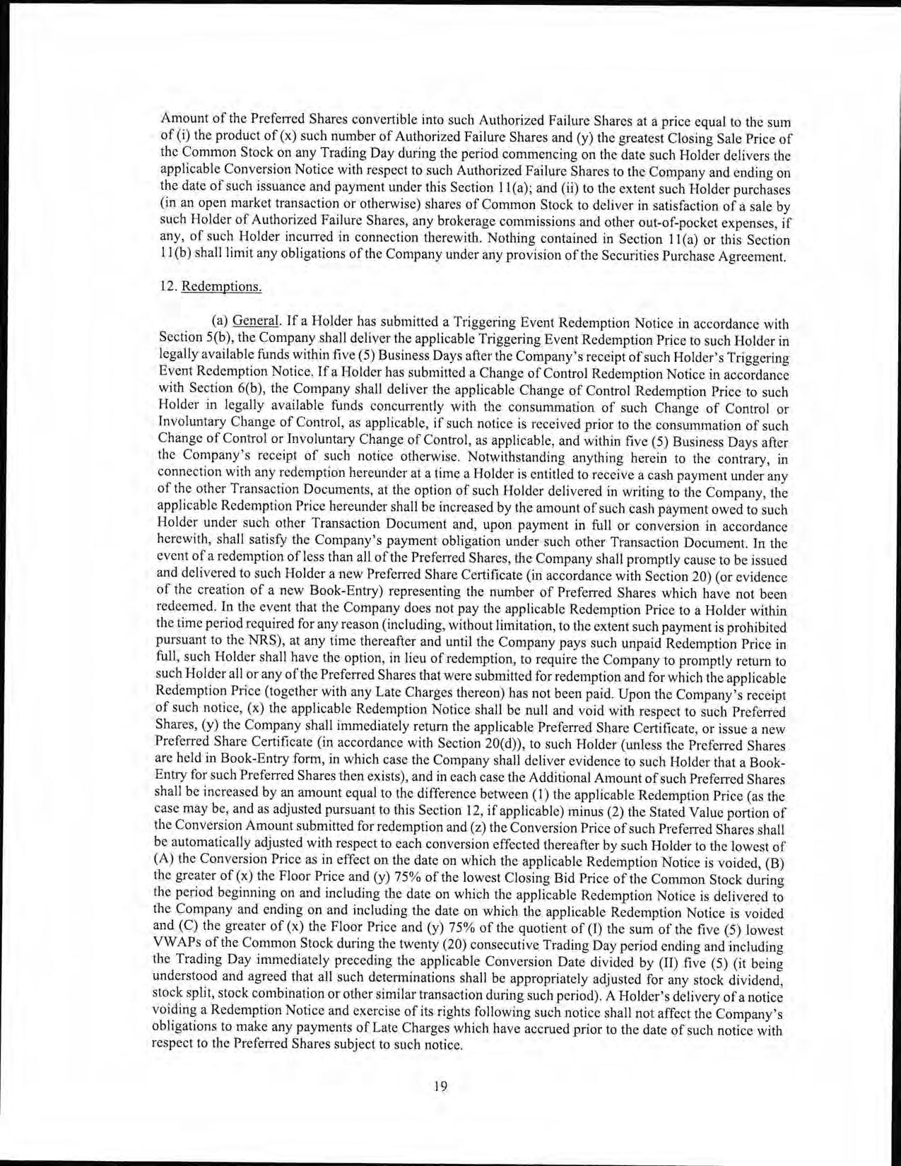 Amount of the PrcfcrTcd Shares convertible into such Authorized Failure Shares at a price equal to the sum of (i) the product of (x) such number of Author i zed Failure Shares and (y) the greatest Closing Sale Price of the Common Stock on any Trading Day during the period commencing on the date such Ho l der delivers the applicable Conversion Notice with respect to such Authorized Failure Shares to the Company and ending on the date of such issuance and paymen t under this Section 11 (a) ; a 11 d (ii) lo t he extent such Holder purchases (in an open market transaction or otherwise) shares of Common Stock to deliver in satisfaction of a sale by such Holder of Authorized Failure Shares, any brokerage commissions and other out - of - pocket expenses, if any, of such Holder incun - ed in connection therewith . Nothing contained in Section I I (a) or this Section 11 (b) shall limit any obligations of the Company under any provision of the Securities Purchase Agreement . 12. Redemptions. (a) General. If a Holder has submitted a Triggering Event Redemption Notice in accordance wi t h Section S(b), the Company shall deliver the applicable Triggering Event Redemption Price to such Holder in legally available ti.Inds within five (5) Business Days after the Company's receipt of such Holder's Triggering Event Redemption Notice . lf a Holder has submitted a Change of Control Redemption Notice in accordance with Section 6(b), the Company shall deliver the applicable Change of Control Redemption Price to such Holder in legally available funds concurrently with the consummation of such Change of Control or Involuntary Change of Control, as applicable , if such notice is received prior to the consummation of such Change of Control or Involuntary Change of Control, as applicable , and within five (5) Business Days after the Company's receipt of such notice otherwise. Notwithstanding anything herein to the contrary, in connection with any redemption hereunder at a lime a Holder is entitled to receive a cash payment under any of the other Transaction Documents, at the option of such Holder delivered in writing to the Company, the applicable Redemption Price hereunder shall be increased by the amount of such cash payment owed to such Holder under such other Transaction Document and, upon payment in full or conversion in accordance herewith, shall satisfy the Company's payment obligation under such other Transaction Document. In the event of a redemption of less than all of the Preferred Shares, U1e Company shall promptly cause to be issued and delivered to such Holder a11ew Preferred Share Certificate (in accordance with Section 20) (or evidence of the creation of a new Book - Entry) representing the number of Prefen - ed Shares which have not beeJ1 redeemed. In the event that the Company does not pay the applicable Redemption Price to a Holder within the time period required for any reason (including, without limitation, to the ex.tent such payment is prohibited pursuant to the NRS), at any time thereafter and until the Company pays such unpaid Redemption Price in full, such Holder shall have the option , in lieu of redemption, to require the Company to promptly return to such Holder all or any of thePreferred Shares that were submitted for redemption and for which the applicable Redemption Price (together with any Late Charges thereon) bas not been paid. Upon the Company's receipt of such notice , (x) the applicable Redemption Notice shall be null and void wit h respect to such Preferred Shares , (y) the Company shall immediately remrn the applicable Preferred Share Cert i ficate , or issue a new Prefen - ed Share Certificate (in accordance with Section 20(d)), to such Holder (u11less the Preferred Shares are held in Book - Entry form, in which case the Company shall deliver evidence to such Holder that a Book Entry for such Preferred Shares then exists), and in each case the Additional Amount of such Prefen - cd Shares shall be increased by an amount equal lo the difference between (I) the applicable Redemption Price (as the case may be, and as adjusted pursuant to this Section 12, if applicable) minus (2) the Stated Value portion of the Conversion Amount submitted for redemption and (z) the Conversion Price of such Preferred Shares shall be automatically adjusted with respect to each conversion effected thereafter by such Holder to the lowest of (A) the Conversion Price as in effect on the date on whicl 1 the applicable Redemption Notice is voided, (B) the greater of (x) the Floor Price and (y) 75 % of the lowest Closing Bid Price of the Common Stock during the period beginning on and including the date on which the applicable Redemption Notice is de l ivered to the Company and ending on and including the date on which the applicab l e Redemption Notice is voided and (C) the greater of (x) the Floor Price and (y) 75 % of the quotient of (f) the sum of the five { 5 ) lowest VWAPs of the Common Stock during the twenty ( 20 ) consecutive Trading Day period ending and including the Trading Day immediately preceding the applicable Conversion Date divided by (II) five ( 5 ) (it being understood and agreed that all such dc t enninations shall be appropriately adjusted for any stock dividend, stock split, stock combination or other similar transaction during such period) . A Holder's delivery of a notice voiding a Redemption Notice and exercise of its rights following such notice shall no t affect the Company's obligations to make any payments of Late Charges which have accrued prior to the date of such notice with respect to the Prefen - ed Shares subject to such notice. 19