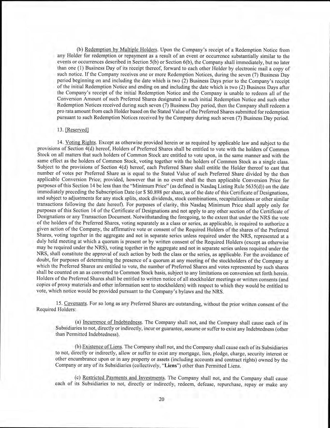(b) Redemption by Multiple Holders . Upon the Company's receipt of a Redemption Notice from any Holder for redemption or repayment as a result of an event or occurrence substantially similar to the events or occurrences described in Section 5 (b) or Section 6 (b), the Company shall immediately, but no later than one (I) Business D ay of its receipt tl 1 ereof, forward to each other Holder by electronic mail a copy of such notice . Tf the Company receives one or more Redemption Notices, during the seven ( 7 ) Business Day pc 1 iod beginning on and including the date which is two ( 2 ) Business Days prior to tl 1 e Company's receipt of the initia l Redemption Notice and ending on and including the date which is two ( 2 ) Business Days after the Company's receipt of the initial Redemption Notice and the Company is unab l e to redeem all of the Conversion Amount of such Preferred Shares designated in such initial Redemption Notice and such other Redemption Notices received during such seven ( 7 ) Business Day period, then the Company shall redeem a pro rata amount from each Holder based on theStated Vah - 1 e of the Preferred Shares submitted for redemption pursuant to such Redemption Notices received by the Company during such seven ( 7 ) Business Day period . 13. [Reserved l 14. Voting Rights . Except as otherwise provided herein or as required by applicable l aw and s u bject to the provisions of Section 4 (d) hereof, Holders of Preferred Shares shall be entitled to vote with the holders of Common Stock on all matters that such holders of Common Stock are entitled to vote upon, in the same manner and with the same effect as the holders of Common Stock, voting together with the holders of Common Stock as a sing l e class . Subject lo the provisions of Section 4 (d) hereof, each Preferred Share shall entitle the Holder thereof to cast that number of votes per Preferred Share as is equa l to the Stated Value of such Preferred Share divided by the then applicab l e Conversion Price ; provided, however that in no event shall the then applicable Conversion Price for purposes of this Sect . ion 14 be less than the "Minimum Price" (as defined in Nasdaq L isting Ruic 5635 (d)) on the date immediately preceding the Subscription Date (or $ $ 0 . 898 per share, as of the date of this Certificate of Designations, and subject to adjustments for any stock sp l its , stock dividends, stock combinations, recapitalizations or other similar transactions following the date hereof) , For purposes of clarity, th is Nasdaq Minimum Price shall apply only for purposes of this Section 14 of the Gertificate of Designations and not apply to any other section of the Certificate of Designations or any Transaction Document . Notwithstanding the foregoing, to U 1 e extent t hat under the NRS the vote of the holders of the Preferred Shares, voting separately as a class or series, as applicable, is required to authorize a given action of the Company, the affirmative vote or consent of the Required Holders of the shares of the Prefen·ed Shares, voting together in the aggregate and not in separate series unless required under the NRS, represented at a duly held meeting at which a quorum is present or by written consent of the Required Holders (except as otherwise may be r equired under the NRS), voting together in the aggrega te and not in separate series unless required under the NRS, shall constitute the approval of such action by both the c l ass or the series, as applicable . For the avoidance of doubt, for purposes of detem 1 ining the presence of a quonim at any meeting of the stockholders of the Company at which the P referred Shares are entitled to vote, the number of Preferred Shares and votes represented by such shares shall be counted on an as co 11 verted to Common Stock basis , subject to any limitations on conversion set fort h herein . Holders of the Prefe 1 Ted Shares shall be entitled to written notice of all stockholder meetings or written consents (and copies of proxy materials and other information sent to stockholders) with respect to whlcl 1 they would be entitled to vote, which notice would be provided pursuant to the Compa n y's bylaws and the NRS . 15. Covenants . For so long as any Preferred Shares are outstanding, without the prior written consent of the Required Holders : (a) ln currence of Indebtedness . The Company shall not, and the Company shall cause each of its Subsidiaries to not, directly or indirectly, incur or guarantee, assume or suffer to exist any Tndebtedness (other than Pem 1 itted Indebtedness) . (b) Existence of Liens . The Company shall not, and the Company shall cause each ofits Subsidiaries to not, direct l y or indirectly , allow or suffer to ex i st any mortgage , lien, pledge, charge, secu ri ty interest or other encumbrance upon or in any property or assets (including accounts and contract rights) owned by the Company or any of its Subsidiaries (collectively, " Liens ") othe r ihan Pennitted Liens . (c) Restricted Payments and Investments. The Company shall not, and the Company shall cause each of its Subsidiaries to not, directly or indirectly, redeem, defease, repurchase, repay or make any 20
