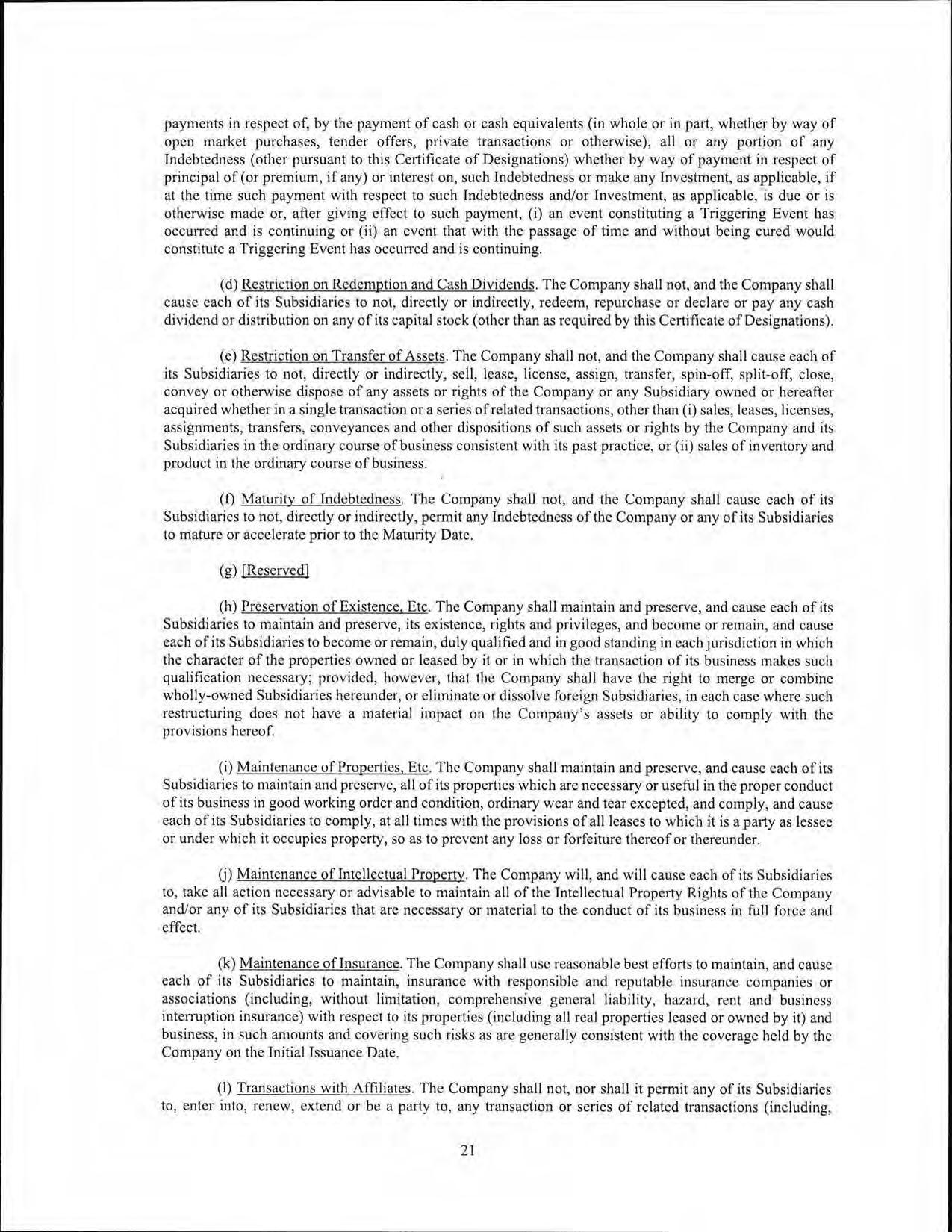 payments in respect of, by the payment of cash or cash equivalents (in whole or in part, whethe r by way of open market purchases, tender offers, private transactions or otherwise), all or any portion of any Indebtedness (other pursuant to this Certificate of Designations) whether by way of payment in respect of principal of (or premium, if any) or interest on, such Indebtedness or make any Investment, as app l icable, if at the time such payment with respect to such Indebtedness and/or Investment, as applicable , is due or is otherwise made or, after giving effect to such payment, (i) an event constitut i ng a Triggering Event has occurred and is continuing or (ii) an event that with the passage of time and without being cured wou . ld constitute a Triggering Event has occurred and is continuing . (d) Restriction on Redemption and Cash Dividends . The Company shall not, and the Company shall cause each of its Subsidiaries to not, directly or indirectly, redeem, repurchase or declare or pay any cash dividend or distribution on any of its capital stock (other than as required by this Certificate of Designations) . (e) Restriction on Transfer of Assets . The Company shall not, and the Company shall cause each of its Subsidiaries to not, directly or indirectly, sell, lease, license, assign, transfer, spin - 9 ff, split - off, close, convey or otherwise dispose of any assets or rights of the Company or any Subsidiary owned or hereafter acquired whether in a single transaction or a series of related transactions, other than (i) sales , leases, licenses, assignments, transfers, conveyances and other dispositions of such assets or rights by the Company and its Subsidiaries in the ordina 1 y course of business consistent with its past practice, or (ii) sales of inventory and product in the ordinary course of business . (f) Maturity of Indebtedness . The Company shall not, and the Company shall cause each of its Subsidiaries to not , directly or indirectly, permit any Indebtedness of the Company or any of its Subsidiaries to mature or accelerate prior to the Maturity Date . (g) [Reserved] (h) Preservation of Existence, Etc . The Company shall maintain and preserve, and cause each of its Subsidiaries to maintain and preserve, its existence , rights and privileges, and become or remain, and cause each of its Subsidiaries to become or remain, duly qualified and in good standing in each jurisdiction in which the character of the properties owned or leased by it or in which the transaction of its business makes such qualification necessary ; provided, however, that the Company shall have the right to merge or combine wholly - owned Subsidiaries hereunder, or eliminate or dissolve foreign Subsidiaries, in each case where such restructuring does not have a material impact on the Company's assets or ability to comply with the provisions hereof . (i) Maintenance of Properties, Etc . The Company shall maintain and preserve, and cause each of its Subsidiaries to maintain and preserve, al I of its properties which are necessary or useful in the proper conduct of its business in good working order and condition, ordinary wear and tear excepted, and comply, and cause each of its Subsidiaries to comply, at all times with the provisions of all leases to which it is a party as lessee or under which it occupies property, so as to prevent any loss or forfeiture thereof or thereunder . (j) Maintenance of Intellectual Property . The Company will, and will cause each of its Subsidiaries to , take all action necessary or advisable to maintain all of the Intellectual Property Rights of the Company and/or any of its Subsidiaries that are necessary or material to U 1 e conduct of its business in full force and effect . (k) Maintenance of Insurance . The Company shall use reasonable best efforts to maintain, and cause each of its Subsidiaries to maintain, inSLtrancc with responsible and reputable insurance companies or associations (including, without limitation, comprehensive general liability, hazard, rent and business intem 1 ption insurance) with respect to its properties (including all real properties leased or owned by it) and business , in such amounts and covering such risks as are generally consistent with the coverage held by the Company on the Initial Issuance Date . (I) Transactions with Affiliates. The Company shall not, nor shall it permit any of its Subsidiaries to , enter into, renew, extend or be a party to , any transaction or series of related transactions (including, 21
