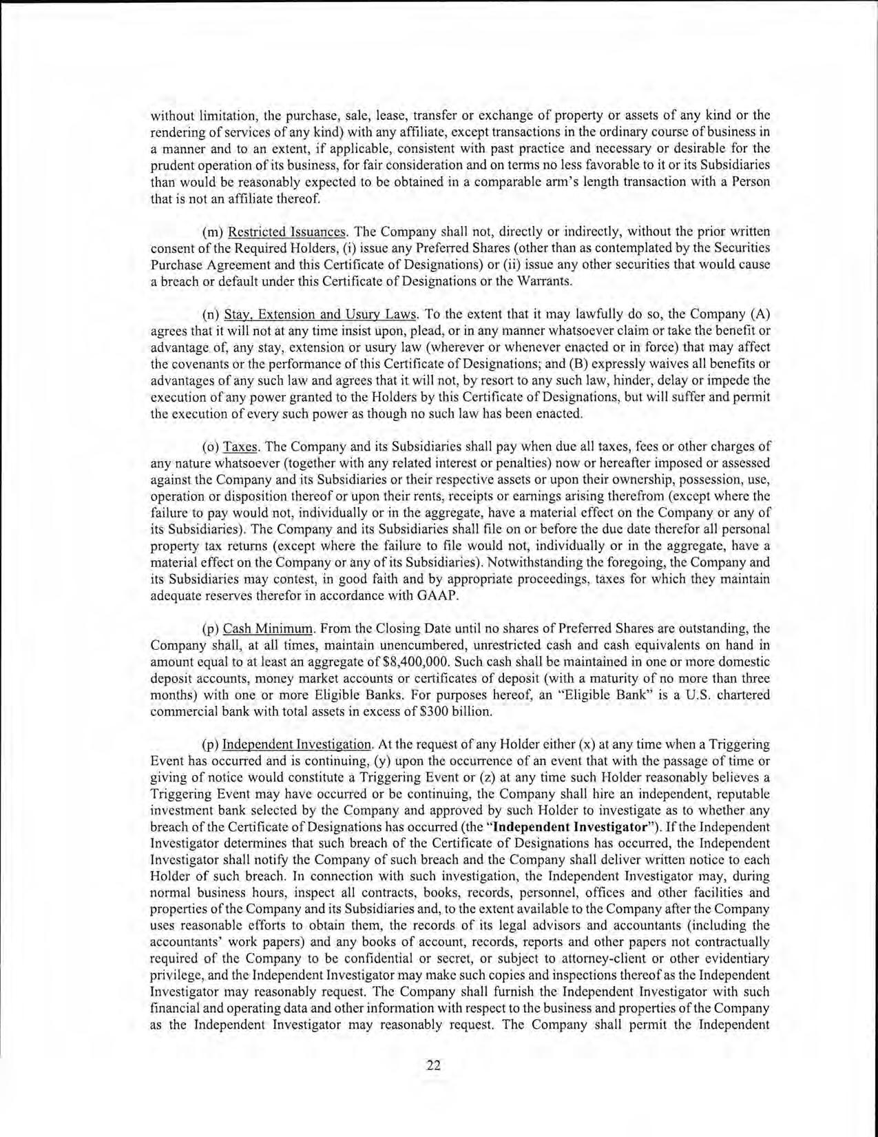 without limitation, the purchase, sale, lease, transfer or exchange of property or assets of any kind or the rendering of services of any kind) with any affiliate, except transactions in the ordinary course of business in a manner and to an exten t , if applicable, consistent with past practice and necessary or desirable for the prudent operation of its business, for fair consideration and on tenns no less favorable to it or its Subsidiaries than would be reasonably expected to be obtained in a comparable ann's length transaction with a Person that is not an affiliate thereof . (m) Restricted I ssuances . The Company shall not, directly or indirectly, without the prior written consent of the Requ i red }folders, (i) issue any Preferred Shares (other than as contemplated by the Securities Purchase Agreement and this Certificate of Designations) or (ii) issue any other securities that would cause a breach or default under this Certificate of Designations o r the Warrants . (n) Stay, Extension and Uswy Laws . To the extent that it may lawfully do so, the Company (A) agrees that it will not at any time insist upon, p l ead , or in any hlanner whatsoever claim or take the benefit or advantage of, any stay, extension or usury law (wherever or whenever enacted or in force) that may affect the covenants or the performance of this Certificate of Designations ; and (B) expressly waives all benefits or advantages of any such law and agrees that it will not, by resort to - any such law, hinder, delay or impede the execution of any power granted to the Holders by this Certificate of Designations, but will suffer and pennit the execution of every such power as though no such law has been enacted . (o) Taxes . The Company and its Subsidiaries shall pay when due all taxes, fees or other charges of any nature whatsoever (together with any related interest or penalties) now or hereafter imposed or assessed against the Company and its Subsidiaries or their respective ass e ts or upon their ownership, possession, use, operation or disposition thereof or upon their rents, receipts or earnings arising therefrom (except where the failure to pay would not, individually or in the aggregate, have a material effect on the Company or any of its Subsidiaries) . The Company and its Subsidiaries shall file on or before the due date therefor all personal property tax returns (except where the failure to file would not, individually or in the aggregate, have a material effect on the Company or any of its Subsidiaries) . Notwithstanding the foregoing, the Company and its Subsidiaries may contest, in good faith and by appropriate proceedings, ta . xcs for which they maintain adequate reserves therefor in accordance with OAAP . (p) Cash Minimum . From the C l osing Date until no shares of Prcfo 1 Ted Shares are outstanding, the Company shall, at all times, maintain unencumbered, unrestricted cash and cash equivalents on hand i'n amount equal to at least an aggregate of $ 8 , 400 , 000 . Such cash shall be maintained in one or more domestic deposit accounts, money market accounts or certificates of deposit (with a maturity of no more than three months) with one or more Eligible Banks . For purposes hereof, an ''Eligible Bank" is a U . S . chartered commercial bank with total assets in excess of $ 300 billion . (p) Independent Investigation , At the request of any Holder either (x) at any time when a Triggering Event has occurred and is continuing, (y) upon the occurrence of an event that with the passage of time or giving of notice would constitute a Triggering Event or (z) at any time such Holder reasonably believes a Triggering Event may have occurred or be Continuing, the Company shall hire an independent , reputable investment bank selected by the Company and approved by such Holder to investigate as to whether any breach of the Certificatc of Designations has occurred (the " lnd epe n de nt I nves ti gato r ") . If the Independent I nvestigator determines that such breach of the Certificate of Designations has occurred, the Independent Investigator shall notify the Company of such breach and the Company shall deliver written notice to each Holder of such breach . In connection with such investigation, the Independent l nvestigatot may , during nom,al business hours, inspect all contracts, books, records, personnel, offices and other facilities and prope 11 ies of the Company and its Subsidiaries and, to the extent available to the Company after the Company uses reasonable efforts to obtain them , the records of its legal advisors and accountants (including the accountants' work papers ) and any books of account, records, reports and other papers not contractually required of the Company to be confidential or secret, or subject to attorney - client or other evidentiary privilege, and the Independent Investigator may make such copies and inspections thereof as the Independent lnvestigator may reasonably request . The Company shall furnish the Independent Investigator with such financial and operating data and other information with respect to the business and properties of the Company as the Independent Investigator may reasonably request. The Company shall permit the Independent 22