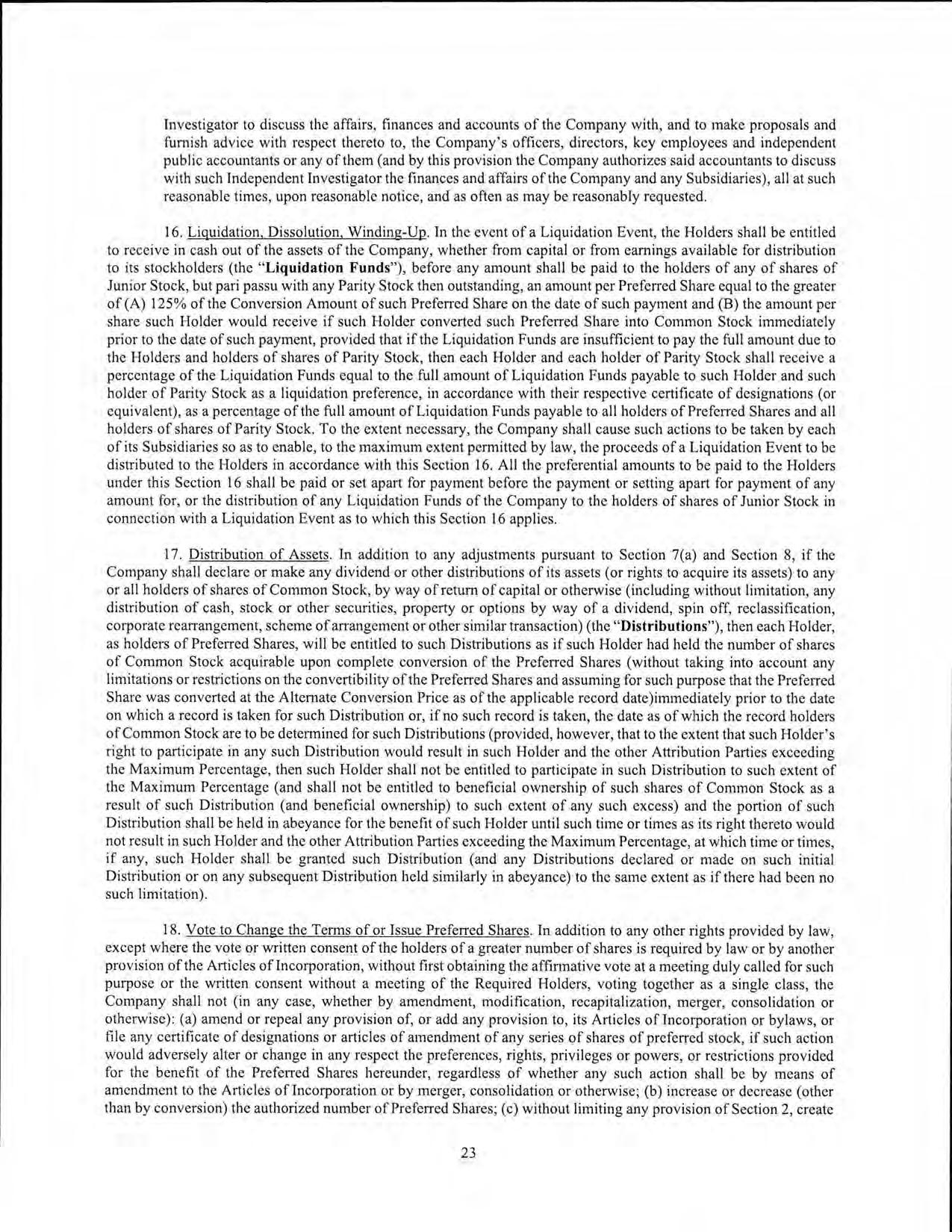 I nvestigator to discuss the affairs, finances and accounts of the Company with, and to make proposals and furnish advice with respect thereto to, the Company's officers, directors, key employees and independent public accountants o r any of them (and by this provision the Company authorizes said accountants to discuss with such lndependent Investigator the finances and affairs of the Company and any Subsidiaries), all at such reasonable times, upon reasonable notice, and as often as may be reasonably requested . 16. Liquidation, Dissolution, Winding - Up . ln the event ofa Liquidation Event, the Holders shall be entitled to receive in cash out of the assets of the Company, whether from capital or from earnings available for distribution to its stockholders (the ' ' L iquidati o n F und s " ) , before any amount shall be paid to the ho l ders of any of shares of Junior Stock, but pari passu with any Parity Stock then outstanding, an amount per Prefen - ed Share equal to the greater of (A) 125 % of the Conversion Amount of such Preferred Sha r e on the <late of such payment and (B) the amount per share such Holder wou l d receive if such Holder converted such Preferred Share in t o Common Stock immediately prior to the date of such payment, provided that if the Liquidation Funds are insufficient to pay the full amount due to the Holders and ho l ders of shares of Parity Stock . then each Holder a n d each holder of Parity Stock shall receive a percentage of the Liquidation Fllnds equal to the full amount of Liquidation Funds payable to such Holder and such holder of Parity Stock as a liquidation preference, in accordance with their respective certificate of designations (or equivalent), as a perce 11 tage of the full amount of Liquidation Funds payable to all holders of Prefen : ed Shares and all holders of shares of l>arity Stock . To the extent necessary, the Company shall cause such actions to be taken by each of its Subsidiaries so as to enable, to the maximum extent permitted by law, the proceeds of a Liquidation Event to be distributed to the Holders in accordance with this Section 16 . All the preferential amounts to be paid to the Holders under this Section 16 shall be paid or set apart for payment before the payment or setting apart for payment of any amount for, or the distribution of any Liquidation Funds of the Company to the holders of shares of Junior Stock in connection with a Liquidation Event as to which this Section 16 applies . 17. Distribution of Assets . In addition to any adjustments pursuant to Section 7 (a) and Section 8 , if the Company shall declare or make any dividend or other distributions of its assets (or rights to acquire its assets) to any or all holders of shares of Common Stock, by way of return of capital or otherwise (including without limitation , any distTibution of cash, stock or other securities, property or options by way of a dividend, spin off , reclassification, corporate rearrangement, scheme of arrangement or other similar transaction) (the " Di s tributi o n s ' ') , then each Holder, as holders of Preferred Shares, will be entitled to such Distributions as if such Holder had held the number of shares of Common Stock acquirable upon complete conversion of the Preferred Shares (without taking into account any limitations or restrictions on the convertibility of the Preferred Shares and assuming for such purpose that the Preferred Share was converted at the A 11 emate Conversion Price as of the applicable record date)immediately prior to the date on which a record is taken for such Distribution or, ifno s uch record is taken, the <late as of which the record holders of Common Stock are to be dete 1 mined for such Distributions (provided, however, that to the extent that such Holder's right to participate in any such Distribution wou l d result in such Holder and the other Attribution Parties exceeding the Maximum Percentage, then such Holder shall not be entitled to participate in such Distribution to such extent of the Maximum Percentage (and shall not be entitled to beneficial ownership of such shares of Common Stock as a result of such Distribution (and beneficial ownership) to such extent of any such excess) and the portion of such Distribution shall be held in abeyance for the benefit of such Holder until such time or times as its right thereto would not result in such Holder and the other Attribution Parties exceeding the Maximum Percentage, at which time or times, if any, such Holder shall be granted such Distribution (and any Distributions declared or made on such initial Distribution or on any subsequent Distribution held similarly in abeyance) to the same extent as if there had been no such limitation) . 18. Vote to Change the Terms of ot Issue Preferred Shares . In addition to any other rights provided by law , except where the vote or written consent of the holders of a greater number of shares is required by law or by another provision of the Articles of Incorporation, without first obtaining the affinnative vote at a meeting duly called for such purpose or the written consent without a meeting of the Required Holders , voting together as a single class, the Company shall not (in any case, whether by amendment, modification, recapitalization, merger, consolidation or otherwise) : (a) amend or repea l any provision of, or add any provision to, its Articles oflncorporation or bylaws, or tile any certificate of designations or articles of amendment of any series of shares of preferred stock, if such action would adversely alter or change in any respect the preferences, rights, privileges or powers, or restrictions provided for the benefit of the Preferred Shares hereunder, regardless of whethe r any such action shall be by means of amendment tO the Articles oflncorporation or by merger, consolidation or otherwise ; (b) increase or decrease (other than by conversion) the authorized number of Preferred Shares; (c) without limiting any 