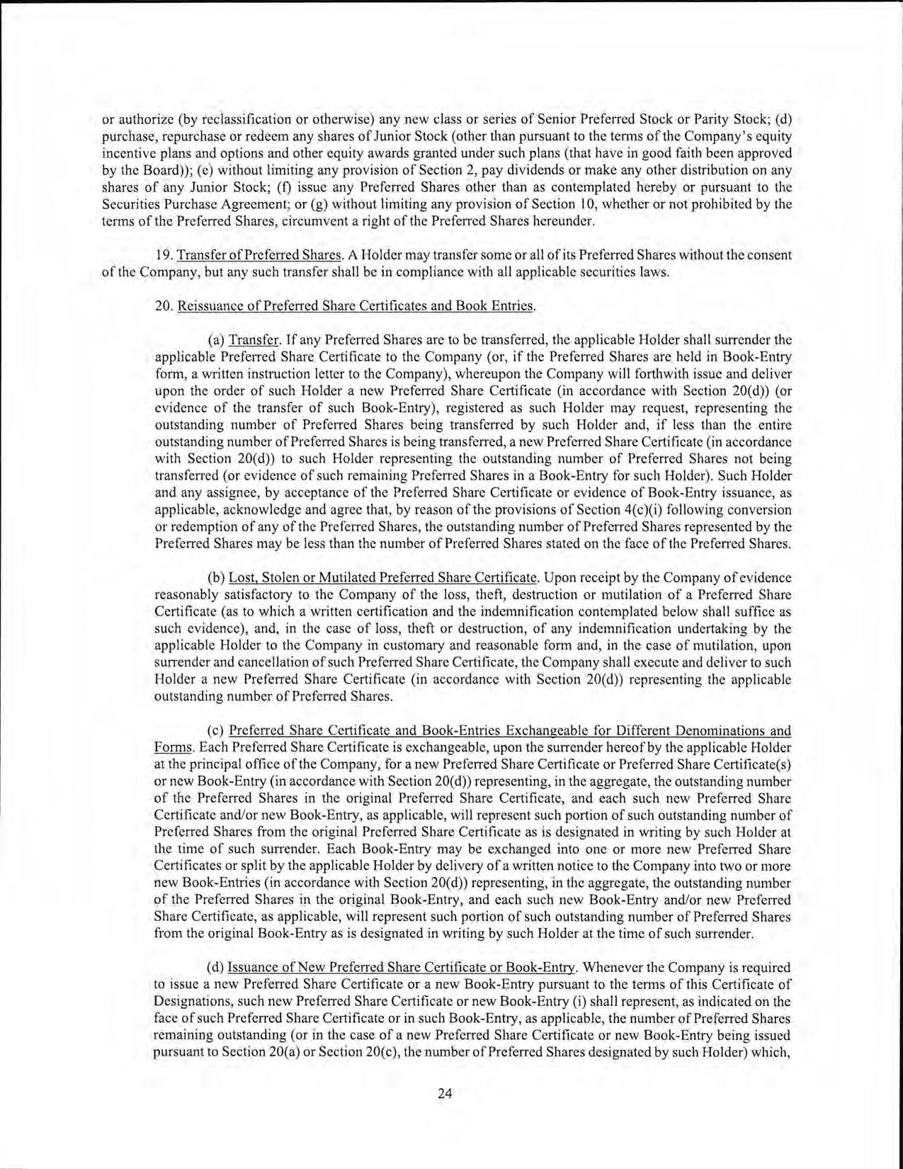 or authorize (by reclassification or otherwise) any new class or series of Senior Preferred Stock or Parity Stock ; (d) purchase, repurchase or redeem any shares of Junior Stock (other than pursuant to the ten 11 S of the Company's equity incentive plans and options and other equity awards granted under such plans (that have in good faith been approved by the Board)) ; (e) without limiting any provision of Section 2 , pay dividends or make any other distribution on any shares of any Junior Stock ; (f) issue any Preferred Shares other than as contemplated hereby or pursuant to the Securities Purchase Agreement ; or (g) without limiting any provision of Section I 0 , whether or not prohibited by the te 1111 s of the Preferred Shares, circumvent a right of the Preferred Shares hereunder . 19. Transfer of PrefetTed Shares . A I {older may transfer some or all of its Preferred Shares without the consent of the Company, but any such transfer shall be i.t1 compliance with all applicable securities laws. 20. Reissuanee of Preferred Share Certificate.sand Book Entries. (a) Transfer . If any Preferred Shares are to be transferred, the applicable Holder shall surrender the applicable Preferred Share Certificate to the Company (or, if the Preferred Shares are held in Book - Entry form, a written instruction letter to the Company), whereupon the Company will forthwith issue and deliver upon the order of such Holder a new Preferred Share Certificate (in accordance with Section 20 (d)) (or evidence of the transfer of such Book - Entry), registered as such Holder may request, representing the outstanding number of Preferred Shares being transferred by such Holder and, if less than th e entire outstanding number of Preferred Shares is being transferred, a new Preferred Share Certificate (in accordance with Section 20 (d)) to such Holder representing the outstanding number of Preferred Shares not being transfened (or evidence of such remaining Preferred Shares in a Book - Entry for such Holder) . Such Holder and any assignee, by acceptance of the Preferred Share Certificate or evidence of Book - Entry issuance, as applicable, acknowledge and agree that, by reason of the provisions of Section 4 (c)(i) following conversion or redemption of any of the Preferred Shares, the outstanding number of Preferred Shares represented by the Preferred Shares may be less than the number of Preferred Shares stated on the face of the Preferred Shares . (b) Lost, Stolen or Mutilated Preferred Share Certificate . Upon receipt by the Company of evidence reasonably satisfactory to the Company of the loss, theft, destrnction or mutilation of a Preferred Share Certificate (as to which a written ce 11 ification and the indemnification contemplated below shall suffice as such evidence}, and, in the case of loss, theft or destruction, of any indemnification undertaking by the applicable Holder to the Company in customary and reasonable fonn and, in the case of mutilation, upon surrender and cancellation of such Preferred Share Certificate, the Company shall execute and deliver to such Holder a new Pret'tmed Share Certificate (in accordance with Section 20 (d)) representing the applicable outstanding number of Preferred Shares . (e) Preferred Share Certificate and Book - Entries Exchangeable for Different Denominations and Forms . Each Preferred Share Certificate is exchangeable, upon the surrender hereof by the applicable Holder at the principal office of the Company, for a new Preferred Share Certificate or Preferred Share Certificate(s) or new Book - Entry (in accordance with Section 20 (d)) representing, in the aggregate, the outstanding number of the Preferred Shares in the original Preferred Share Certificate, and each such new Preferred Share Certificate and/or new Book - Entry, as applicable, will represent such portion of such outstanding number of Preferred Shares from the original Preferred Sbare Certificate as is designated in writing by such Holder at the time of such surrender . Eacb Book - Entry may be exchanged into one or more new Preferred Share Certificates or split by the applicable Holder by delivery ofa written notice to the Company into two or more new Book - Entries (in accordance with Section 20 (d)) representing, in the aggregate, the outstanding number c ; ,f the Preferred Shares in the original Book - Entry, and each such new Book - Entry and/or new Preferred Share Certificate, as applicable, will represent such portion of such outstanding number of Preferred Shares from the original Book - Entry as is designated in writing by such Holder at the time of such sunender . (d) Issuance of New Preferred Share Certificate or Book - Entry . Whenever the Company is required to issue a new Preferred Share Certificate or a new Book - Entry pursuant to the terms of this Certificate of Designations, such new Preferred Share Certificate or new Book - Entry (i) shall represent, as indicated on the face of such Preferred Share Ce 11 ificate or in such Book - Entry, as applicable, the number of Preferred Shares remaining outstanding (or in the case of a new Preferred Share Certificate or new Book - Entry being issued pursuant to Section 20 (a) or Section 20 (c), the number of Preferred Shares designated by such Holder) which, 24