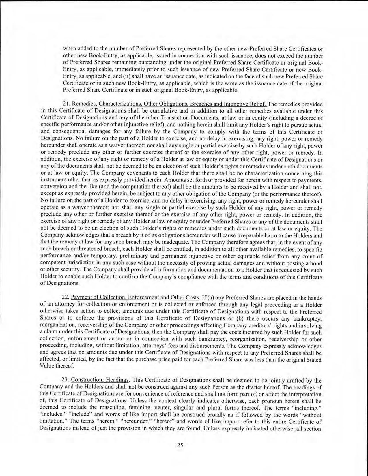 when added to the number of Preferred Shares represented by the other new Preferred Share Certificates or other new Book - Entry , as applicable, issued in connection with such issuance, does not exceed the number of Prcfcn - ed Shares remaining outstanding under the original Preferred Share Certificate or original Book Ent 1 y, as applicab l e, immediately prior to such issuance of new Preferred Share Certificate or new Book Ent 1 y, as applicable, and (ii)shall have an issuance date , as indicated on the face of such new Preferred Share Ce 11 ificatc or in such new Book - Enny , as applicable, which is the same as the issuance date of the original Preferred Share Certificate or in such original Book - Entry, as app li cable . 21. Remedies . Characterizations . Other Obligations . Breaches and Injunctive Relief . The remedies provided in this Certificate of Designations shall be cumulative and in addition to all other remedies available under this Certificate of Designations and any of the other Transaction Documents , at law or in equity (including a decree of specific pcrfonnance and/or other injunctive relict), and nothing herein shall limit any Holder ' s right to pursue actual and consequential damages for any failure by the Company to comply with the te 1111 S of this Certificate of Designations . No failure on the part of a Holder to exercise, and no delay in exercising, any right, power or remedy hereunder shall ope r a t e as a waiver thereof ; nor shall any single or partial exercise by such Holder of any right, power or remedy preclude any other or further exercise thereof o r the exercise of any other right, power or remedy . ln addition, the exercise of any right or remedy of a Holder at law or equity or under this Certificate of Designations or any of the documents shall not be deemed to be an election of such H older's rights or remedies under such documents or at law or equity . The Company covenants to each Holder that there shall be no characterization concerning this instrument other than as expressly provided herein . Amounts set forth or provided for herein with respect to payments, conversion and the like (and the computation thereof) shall be the amounts to be received by a Holder a nd shall not , except as expressly provided herein, be subject to any other obligation of the Company (or tbc performance thereof) . No failure on the part of a Holder to exercise, and no delay in exercising, any right, power or remedy hereunder shall operate as a waiver thereof : nor shall any single or partia l exercise by such Holder of any right, power or remedy prec lu de any other or further exercise thereof or the exercise of any other Tight, power or remedy . Tn addition, the exercise of any right or remedy of any Holder at law or equity or under Preferred Shares or any of the documents shall not be deemed to be an election of such Holder's rights or remedies under such documents or at law or equity . The Company acknow l edges that a breach by it of its obligations hereunder will cause irreparable harm to the Holders and that the remedy at law for any such breach may be inadequate . The Company therefore agrees that, in the event of any such breach or threatened breach, each Holder shall be entitled, in addition to all other available remedies . to specific perfom 1 ance and/or temporary, preliminary and pennanent injunctive or other equitable relief from any court of competent jurisdiction in any such case without the necessity of proving actual damages and witbout posting a bond or other security . The Company shall provide all infom,a t ion and documentation to a Holder that is requested by such Holder to enable such Holder to confLrm the Company's compliance with the tcm 1 s and conditions of this Certificate of Designations . 22. Payment of Collection, Enforcement and Other Costs . If(a) any Pr eferred Shares are placed in the hand s of an attorney for collection or enforcement or is collected or enforced through any l egal proceeding or a Holder otherwise takes action to collect amounts due under thi s Certificate of Designations with respect to the Prefened Shares or lo enforce the provisions of this Certificate of Designations or (b) there occurs any bankruptcy, reorganization, receivership ofthc Company or other proceedings affecting Compa n y creditors· rigbts and involving a claim under this Certificate of Designations , then the Company shall pay the costs incurred by such Holder for such collection, enforcement or action or in c - onoection with such bankruptcy, reorganization . receivership or other proceeding, inc l uding, without limitation . attorneys' fees and disbursements . The Company expressly acknowledges and agrees that no amounts due under this Certificate of Designations with respect to any Preferred Shares shall be affected, or limited, by the fact that the purchase price paid for each Preferred Share was less than the original Stated Value thereof 23. Construction : Headings . This Certificate of Designations shall be deemed to be jointly drafted by the Company and the Holders and shall not be construed against any such Person as the drafter hereof . The headings of this Certificate of Designations are for convenience of reference and shall not fom 1 part of, or affect the interpretation of, this Certificate of Designations . Unless the context clea rl y indicates otherwise, each pronoun herein shall be deemed to include the masculine, feminine, neuter, singular and plural fo 1111 s thereof . The terms "including," "includes,'' "include" and words of like import shall be construed broadly as if followed by the words "without limitation . " The terms "herein . " "hereunder," "hereof' and words of like import refer to this entire Certificate of Designations instead of just the provision in which they are found . Unless expressly indicated otherwise, all section 25