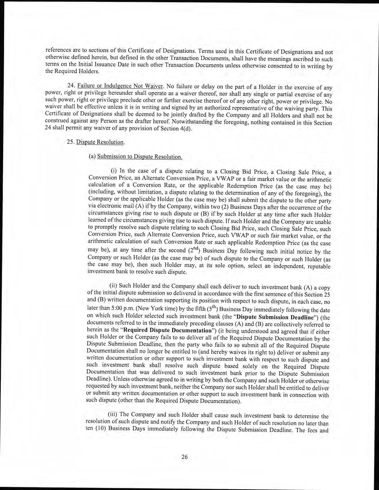 references arc to sections of thjs Certificate of Designations . Terms used in this Certificate of Designations and not otherwise defined herein, but defined in the other Transac ti on Documents, shall have the meanings ascribed to such terms on the Initial Issuance Date in such other Transaction Documents unless otherwise consented lo in wri t i n g by the Required Holders . 24. Fajlurc or I ndulgence Not Waiver . No failure or de l ay on the part of a Holder in the exe r cise of any power, right or privilege hereunder shall operate as a waiver thereof, nor shall any single or partial exercise of any such power , right or privilege preclude other or further exercise thereof or of any other right, power or p r ivilege . No waiver shall be effective unless it is in writing and signed by an autho r ized representative of the waiving party . This Certificate of Designations shall be deemed lo be jointly drafted by the Company and all Holders and sl 1 all not be const ru ed against any Person as the drafter hereof . Notwithstanding th e foregoi n g, nothing contained in th i s Section 24 shall permit any waiver of any provision of Sect i on 4 (d) . 25. Dispute Resolution. (a) Submiss i on to Dispute Resolution. (i) In the case of a dispute relating to a Closing Bid Price, a Closing Sale Price, a Conversion Price , an Altematc Conversion Price, a VWAP or a fair market value or the arithmetic calculation of a Conversion Rate, or the applicable Redemption Price (as the case may be) (including, without limitation . a dispute relating to the determination of any of the foregoing), the Company or the applicable Holder (as the case may be ) shall submit the dispute to the other party via electronic mail (A) ifby the Company, within two ( 2 ) Business Days after the occurrence of the circumstances giving rise to such dispute or ( 8 ) i f by such Holder at a n y time after such Holder learned of the circumstances giving rise to such dispute . If such Holder and the Company are unable to promptly resolve such dispute relating to such Closing Bid Price, such Closing Sale Price , such Conversion Price , such Alternate Conversion Price , such V \ 1 / AP or such fair market va l ue, or the arithmetic calculation of such Conversion Rate or such applicable Redemption Price (as the case may be), at any time after the second ( 2 nd ) Business Day following such initial notice by the Company or such Holder (as t he case may be) of such dispu t e to the Company or such Holder (as the case may be), then such I!older may . at its sole option, select an independent, reputable investment bank to reso lv e such dispute . (ii) Such Holder and the Company shall each deliver to such investment bank (A) a copy of the initial dispute submission so delivered in accordance wi t h the first sentence of this Section 25 and (B) written documentation supporting its position with respect to such dispute, in each case . no later than 5 : 00 p . m . (New York time) by the fifth ( 5 1 h ) Business Day immediately following the date on which such Holder selected such investment bank (the .. Di sp ut e Submission D ea dlin e " ) (the documents referred to in the immediately preceding clauses (A) and ( 8 ) arc collectively referred to herein as the " Required Di s put e Docum e ntation ") (it being understood and agreed that if eit h er such Holder or the Company fails to so deliver a ll of the Required Dispute Documentation by the Dispute Submission Deadline, then the party who fails to so submit all of the Required Dispute Documentation shall no longer be entitled 10 (and hereby waives its right to) deliver or submit any written documentation or other support to such investment bank with respect 10 such dispute and such investment bank shall resolve such djspute based solely on t he Required Dispute Documentation that was delivered to such investment bank prior to the Dispute Submission Deadline) . Unless otherwise agreed to in w r iting by both the Company and such Holder or otherwise requested bysuch investment bank, neither the Company nor such Holder shall be entitled to deliver or submit any written documentation or other support 10 such investment bank in connection wi th such dispute (other than the Required Dispute Documentation) . (iii) The Company and such Holder shall cause such investment bank to determine the resolution of such dispute and notify the Company and such Holder of such resolution no later than ten ( I 0 ) Business Days immediately following the Dispute Submission Deadline . The fees and 26