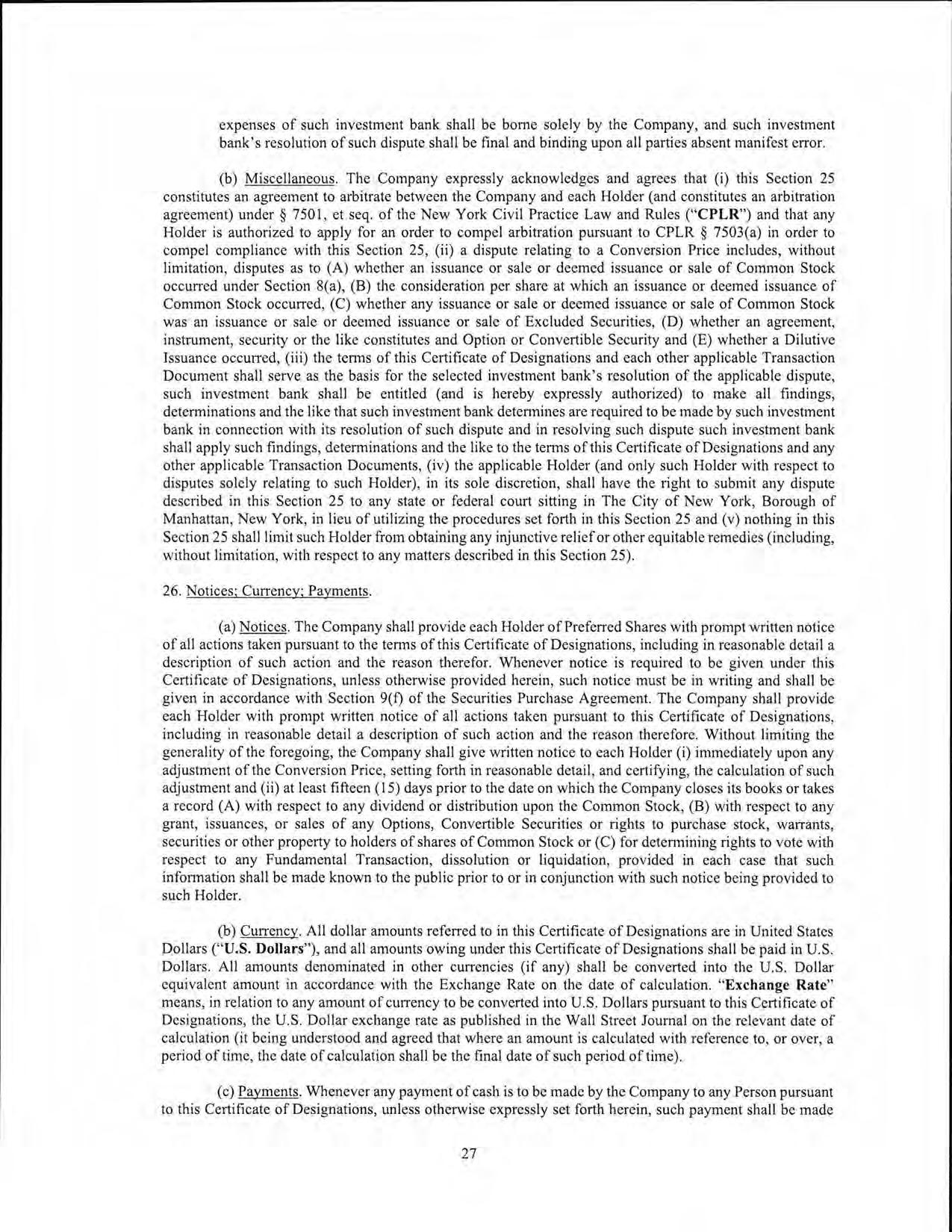 expenses of such investment bank shall be borne solely by the Company, and such investment bank's resolution of such dispute shall be final and binding upon all parties absent manifest error. (b) Miscellaneous . The Company expressly acknowledges and agrees that (i) this Section 25 constitutes an agreement to arbitrate between the Company and each Holder (and constitutes an arbitration agreement) under 7501 , et seq . of the New York Civil Practice Law and Rules ("CPLR") and that any Holder is authorized to apply for an order to compel arbitration pursuant to CPLR 7503 (a) in order to compel compliance with this Section 25 , (ii) a dispute relating to a Conversion Price includes, without limitation, disputes as to (A) whether an issuance or sale or deemed issuance or sale of Common Stock occurred under Section 8 (a), (B) the consideration per share at which an issuance or deemed issuance of Common Stock occurred, (C) whether any issuance or sale or deemed issuance or sale of Common Stock was an issuance or sale or deemed issuance or sale of Excluded Securities, (D) whether an agreement . instrument , security or the like constitutes and Option or Convertible Security and (E) whether a Dilutive Issuance occurred, (iii) the tenns of this Certificate of Designations and each other applicable Transaction Document shall serve as the basis for the selected investment bank's resolution of the applicable dispute, such investment bank shall be entitled (and is hereby expressly authorized) to make all findings, determinations and the like that such investment bank detennines are required to be made by such investment bank in connection with its resolution of such dispute and in resolving such djspute such investment bank shall apply such findings, determinations and the like to the terms of this Certificate of Designations and any other applicable Transaction Documents, (iv) the applicable Holder (and only such Holder with respect to disputes solely relating to such Holder), in its sole discretion, shall have the right to submit any dispute described in this Section 25 to any state or federal court sitting in The City of New York, Borough of Manhattan, New York, in lieu of utilizing the procedures set forth in this Section 25 and (v) nothing in this Section 25 shall limit such Holder from obtaining any injunctive relief or other equitable remedies (including, without limitation, with respect to any matters described in this Section 25 ) . 26. Notices; Currency; Payments. (a) Notices . The Company shall provide each Holder of Preferred Shares with prompt written notice of all actions taken pursuant to the tenns of this Certificate of Designations, including in reasonable detail a description of such action and the reason therefor . Whenever notice is required to be given under this Certificate of Designations, unless otherwise provided herein, such notice must be in writing and shall be given in accordance with Section 9 (() of the Securities Purchase Agreement . The Company shall provide each Holder with prompt written notice of all actions taken pursuant to this Certificate of Designations, including in reasonable detail a description of such action and the reason therefore . Without limiting tbe generality of the foregoing, the Company shall give written notice to each Holder (i) immediately upon any adjustment of the Conversion Price, setting forth in reasonable detail, and certifying, the calculation of such adjustment and (ii) at least fifteen ( 15 ) days prior to the date on which the Company closes its books or takes a record (A) with respect to any dividend or distribution upon the Common Stock, (B) with respect to any grant, issuances, or sales of any Opt i ons, Convertible Securities or rights to purchase stock, warrants, securities or other property to holders of shares of Common Stock or (C) for determining rights to vote with respect to any Fundamental Transaction, dissolution or Liquidation, provided in each case that such infonnation shall be made known to the public prior to or in conjunction with such notice being provided to such Holder . (b) Currency . All dollar amounts referred to in this Certificate of Designations are in United States Dollars ("U . S . Do ll ars "), and all amounts owing under this Certificate of Designations shall be paid in U . S . Dollars . All amounts denominated in other currencies (if any) shall be converted into the U . S . Dollar equivalent amount in accordance with the Exchange Rate on the date of calculation . "Exchange Rate " means , in relation to any amount of ctmency to be converted into U . S . Dollars pursuant to this Certificate of Designations , the U . S . Dollar excbange rate as published in the Wall Street Journal on the relevant date of calculation (it being understood and agreed that where an amount is calculated with reference to, or over, a period of time, the date of calculation shall be the final date of such period of time) . (c) Payments . Whenever any payment of cash is to be made by the Company to any Person pursuant to this Certificate of Designations, unless othe 1 wisc expressly set forth herein , such payment shall be made 27