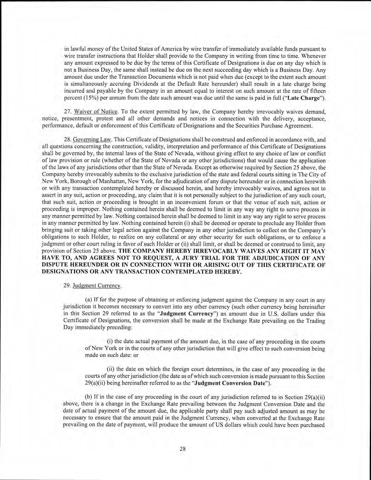 in lawful money of the United States of America by wire transfer ofimmediately ava i lable funds pursuant to wire transfer instructions that Holder shall provide to the Company in writing from time to time . Whenever any amount expressed to be due by the terms of this Certificate of Designations is due on any day which is not a Busine . ss Day , the same shall instead be due on the next succeeding day which is a Business Day . Any amount due under the Transaction Documents which is not paid when due (except to the extent such amount is simultaneously accruing Dividends at the Default Rate hereunder) shall result in a late charge being incun - cd and payable by the Company in an amount equal to interest on such amount at the rate of fifteen percent ( 15 % ) per annum from the date such amount was due until the same is paid in fuH (" Lat e Charge") . 27. Waiver of Notice . To the extent permitted by law, the Company hereby irrevocably waives demand, notice , presentment , protest and all other demands and notices in connection with the delivery , acceptance , performance , default or enforcement of this Certificate of Designations and tho Secw - itics Purchase Agreement . 28. Governing Law . This Certificate of Designations shall be construed and enforced in accordance with, and all questions concerning the constmction, validity, interpreta t ion and performance of this Certificate of Designations shall be governed by , the internal laws of the State of Nevada, without giving effect to any choice of law or conflict of law provision or rule (whether of the State of Nevada or any other jurisdictions) that would cause the application of the laws of any jurisdictions other than the State of Nevada . Except as otherwise required by Section 25 above , the Company hereby irrevocably submits to the exclusive jurisdiction of the state and federal courts sitt·ing in The City of New York . Borough of Manhattan, New York, for the adjudication of any dispute hereunder or in connection herewith or with any transaction contemplated hereby or discussed herein , and hereby irrevocably waives, and agrees not to assen in any suit , action or proceeding, any claim that it is not personally subject to the jurisdiction of any such court, that such suit, action or proceeding is brought in an inconvenient forum or that the venue of such suit, action or proceeding is improper . Nothing contained herein shall be deemed to limit in any way any right to serve process in any manner petmitted by law . Nothing contained herein shall be deemed to limit in anyway any right to serve process in any manner pennitted by law . Nothing contained herein (i) shall be deemed or operate to preclude any Holder from bringing suit or taking other legal action against the Company in any other jurisdiction to collect on the Company's obligations to such Holder , to realize on any collateral or any other security for s uch obligations, or to enforce a judgment or other court ruling in favor of such Holder or (ii) shall limit, or shall be deemed or construed to limit, any provision of Section 25 above . THE COMPANY HEREBY IRREVOCABLY WAIVES ANY RJGHT IT MAY HAVE TO, AND AGREES NOT TO REQ UES T , A JURY TRIAL FOR THE ADJUDICATION OF ANY DISPUTE HEREUNDER OR IN CONNECTION WITH OR ARISING OUT OF THIS CERTIFICATE OF DESIGNATIONS OR ANY TRANSACTION CONTEMPLATED HEREBY . 29. Judgment CtHTency. (a) If for the purpose of obtaining or enforcmg judgment against the Company in any court in any jurisdiction it becomes necessary to convert into any other currency (such other cu 1 Tency being hereinafter in this Section 29 referred to as the "Judgment Currency") an amount due in U . S . dollars under this Certificate of Designations, the conversion shall be made at tbe Exchange Rate prevailing on the Trading Day immediately preceding : (i) the date actual payment of the amount due, in the case of any proceeding in the courts of New York or in the courts of any other juiisdiction tha t will give effect to such conversion being made on such date : or (ii) the date on which the foreign court detennines, in the case of any proceeding in the courts of any other jurisdiction (the date as of which such conversion is made pursuant to this Section 29 {a)(ii) being hereinafter r eferred to as the " Jud g ment Conversion Date") . (b) If in the case of any proceeding in the court of any jurisdiction referred to in Section 29 (a)(ii) above, there is a change in the Exchange Rate prevailing between the Judgment Conversion Date and the date of actual payment of the amoui 1 t due, the applicable party shall pay such adjusted amoun t as may be necessary to ensure that the amoun t paid in the Judgment Currency . when converted at the Exchange Rate prevailing on the date of payment , will produce the amount of US dollars which could have been purchased 28