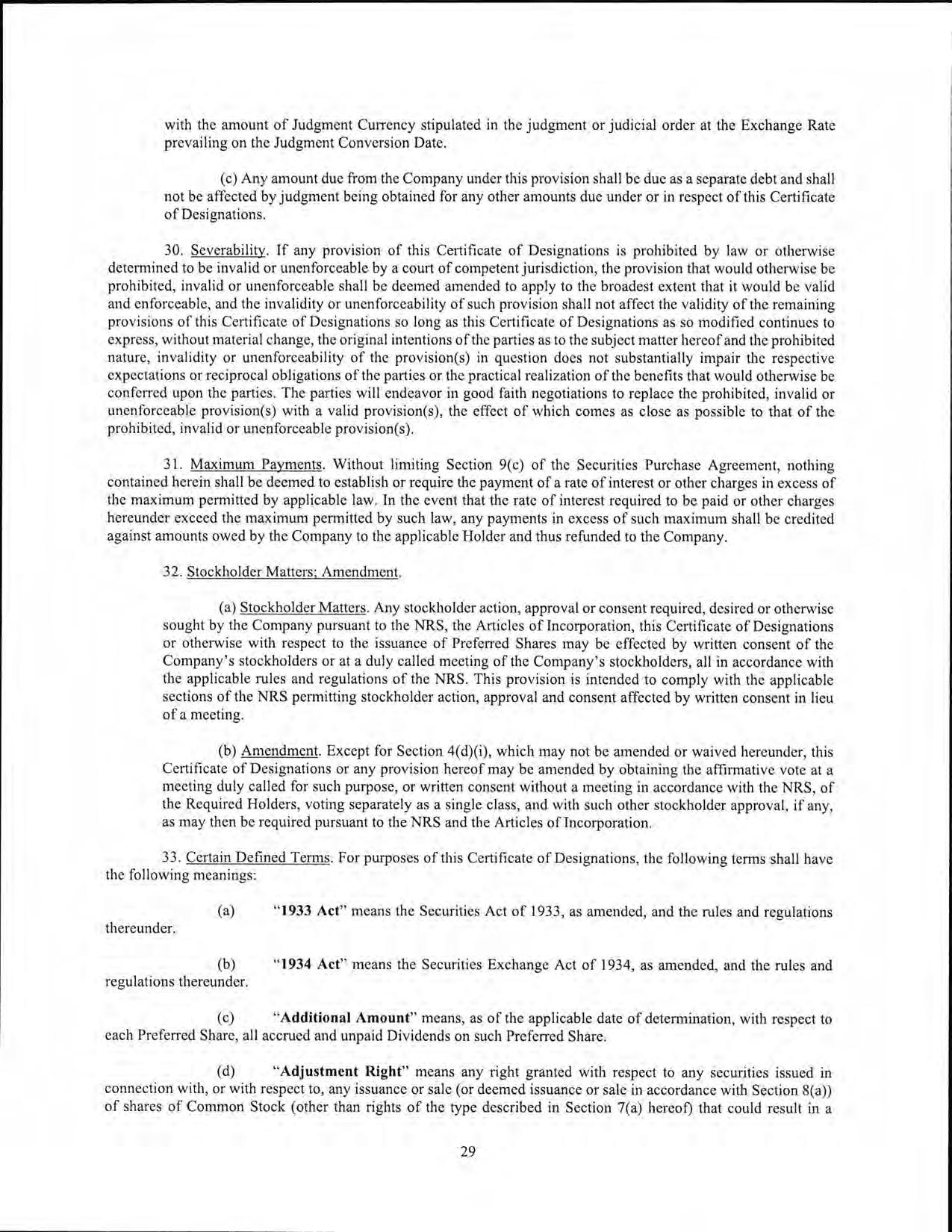 with the amount of Judgment Currency stipulated in the judgment or judicial order at the Exchange Rate prevailing on the Judgment Conversion Date. (c) Any amount due from the Company under this provision shal l be due as a separate debt and shall n ot be affected by judgment being obtained for a n y other amoun t s due under or in respect of tJ 1 is Certjficate of Designations . 30 . Severability . I f any provision of this Certificate of Designations is prohibited by l aw or otherwise determined to be invalid or unenforceable by a court of competent jurisdiction, the provision that would otherwise be prohibited, invalid or unenforceable shall be deemed amended to apply to the broadest extent that it would be valid and enforceable . and the invalidity or unenforceability or such provision shall not affect the validity of the remaining provisions of this Certificate of Designations so long as this Certificate of Designations as so modified continues to express, without material change, the original intentions of the parties as to the subject matt et hereof and the prohibited nature, invalidity or unenforccability of the provision(s) in question does not substantially impair t . he respective expectations or reciprocal obligations of the parties or the practical realization of the benefits that would otherwise be conferred upon the parties . The parties will endeavor in good faith negotiations to replace the prohibited, invalid or unenforceable provision(s) with a valid provision(s), the effect of which comes as close as possible to that of the prohibited, invalid orunenforceable provision(s) . 3 l . Maximum Payments . Without limiting Section 9 (c) of the Securities Purchase Agreement, nothing contained herein shall be deemed to establish or require the payment of a rate of interest or o t her charges in excess of the maximum pem 1 itted by applicable law , ln the event that the rate of interest requ i red to be paid or other charges hereunder exceed the maximwn permitted by such law, any payments in excess of such maximum shall be credited against amoun t s owed by the Company Lo the applicable Holder and thus refunded to the Company . 32. Stock11older Matters; / \ mendment, (a) Stockholder Matters . Any stock h older action, approval or consent required, desired or o t herwise sought by the Company pursuant to the NRS, the Articles of Incorporation, this Cenificate of Designations or otherwise wit h respect to the issuance of Preferred S h ares may be effected by written consent of the Company's stockholders or at a duly called meeting of the Company's stockholders, all in accordance with the applicable rules and regulations of the NRS . This provision is intended to comply with the applicable sections of the NRS pem 1 itting stockholder action, approval and consent affected by written consent in lieu of a meeting . (b) Amendment . Except f or Section 4 (d)(i), which may not be amended or waived hereunder, this Certificate of Designations or any provision hereof may be amended by obtaining the affirmative vote at a meeting duly called for such purpose, o r wr i tten consent without a meeting in accordance with the NRS, of the Required Holders, voting separately as a single class, and with such ot h er stockholder approval . if any, as may then be required pursuant to the NRS and the Arbcles oflncorpo r a t ion . 33. Certain Defined Tenns . For purposes of this Cenificate of Designations, tbc following t erms shall h ave the following meanings : (a) " 1 933 Act'' means the Securities Act of 1933, as amended, and t h e rules and regulations thereunder. 29 (b) regulations thereunder. " 1 934 Act'' means t.he Securities Exchange Act of 1934, as amended, and the rules and (c) "A ddi t ion a l Am o u nt " means, as of the applicab l e date of detenninaiion, with respect to each Preferred Share, all accrued and unpaid Dividends on such Preferred Share . (d) " Adj u s tment R i g ht " means any right g r anted with respect to any securities issued in connection with, or with respect to, any issuance or sale (or deemed issuance or sa l e in accordance with Section S(a)) of shares of Common Stock (other than rights of the type descr i bed in Section 7 (a) h ereof) that could result in a