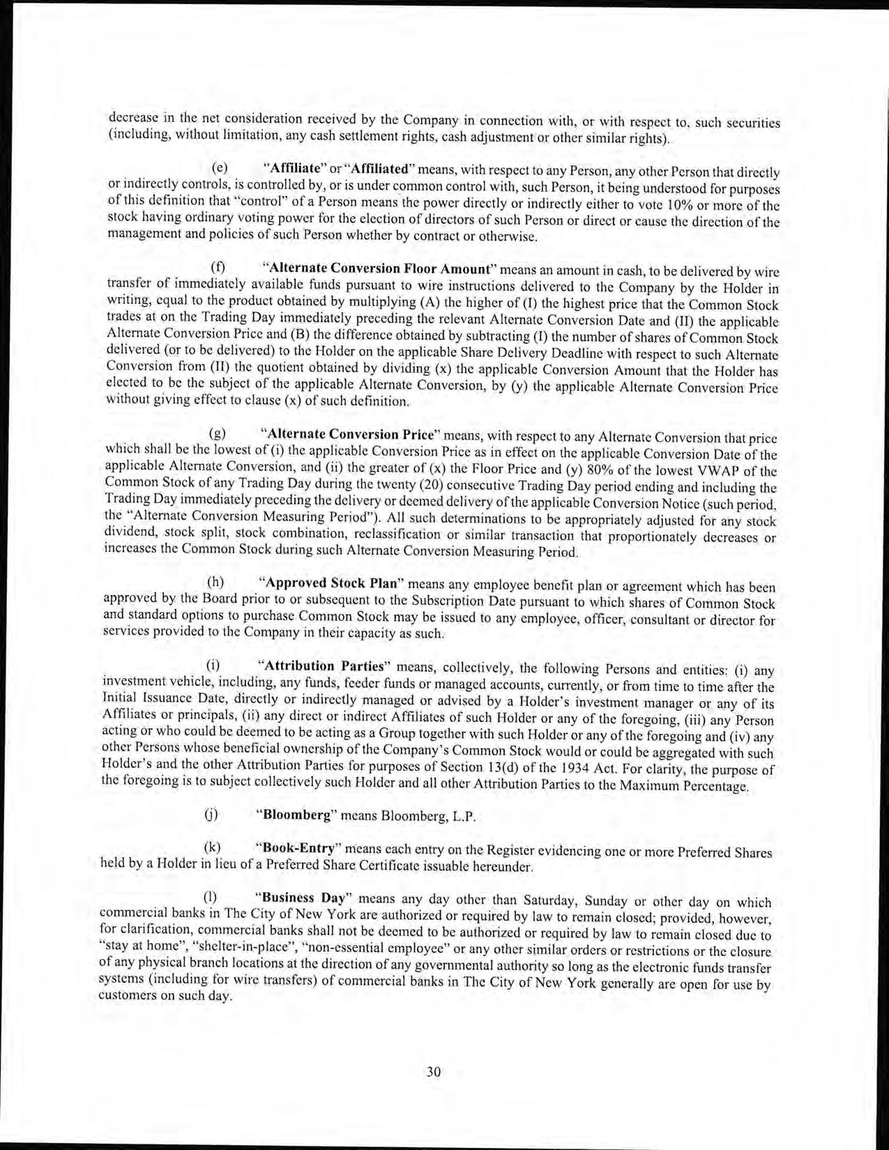 decrease in the net consideration received by Lhe Company in connection with, or with respect to. such securities (incl udin g, without limit atio n , any cash settlement rights. cash adjustme nt or other s imilar ri g hts ). (e) ''A ffiliat e '' or ' ' A ffili a t e d " means, with respect to any Person , any other Person that directly o r indirectly conlrols, is controlled by , or is under common control with, such Person, it being understood for purposes of this definition that "control'' of a Person m eans the power directly or indirectly ei th er to vote I 0 % or mor e of the stock having ordinary vot ing power for the e l ection of directors of such P erson or direct or cause the direc t ion of the management and policies of such Person whether by contract or otherwise . (f) " Alt e rn a t e Conversion Floor Amount'' means an amount in cash, to be delivered by wire transfe r of immediately availab l e funds pursuant to wire instructions delivered to the Company by the Holder in writing, equal to the product obtained by multiplying (A) the higher of([) the highest price that the Common Stock trades at on the Trading Day immediately preceding the relevant Alternate Conversion Date and ( II ) the applicable Alternate Conversion Price and ( 8 ) th e difference obtained by subtracting ( I ) the number of shares of Common Stock delivered (or to be delivered) to the Holder on the applicable Sha re Delivery Deadline wi th re spect to suc h A lt erna te Conversion from ( 11 ) the quotient obtained by dividing (x) the applicable Conversion Amount that tJ 1 e Holder has elected to be the subject of the applicable Alternate Conversion, by (y) the applicable Alternate Conversion Price without giving effect to clause (x) of such definition . (g) " A l t e rn a t e Conversion Pric e" means, with respect to any Alternate Conversion that price which shall be the lowest of (i) the applicable Conversion Price as in effect on the applicable Conversion Date of the applicable Alternate Conversion, and (ii) the greater of (x) the Floor Price and (y) 80 % of the lowest VWAP of the Common S t ock of any Trading Day during the twenty ( 20 ) consec uti ve Trading Day period ending and including th e Trading Day immediately preceding the delivery or deemed delivery of the app li cab le Conversion Notice (such period , the ''Alternate Co n version Measuring Period") . J \ 11 such detcrn 1 ina 1 ions to be appropriately adjusted for any stock di viden d , stock split, stock combination, reclas s ification or similar transaction that proportionately decreases or increases the Common Stock during such Alternate Conversion Measuring P eriod . (h) " Approv e d Stock Plan " means any employee benefit plan or agreement which has been approved by the Board prior to or subsequent to the Subscription D ate pursuant to which shares of Common Stock and standard options to purchase Common Stock may be issued to any employee . officer, consultant or director for services provided to the Company in their capacity as such . (i) ' ·A ttribution Parti es ' ' means, collectively , the following Persons and entities : ( i ) any investment vehicle, including, any funds, feeder funds or man aged accounts, currently, or from time to time after the lnitial I ssuance Date, directly or indirectly managed or advised by a Holder's investment manager o r any of its Affiliates or principals, (ii) any direct or indir ect Affiliates of suc h Holder or a n y of the foregoing, (iii) any P erson acting Or who could be deemed to be acting as a Group together with such Holder or any of the foregoing and (iv) any other Person s whose beneficial ownership of the Company's Common Stock would or could be aggregated with such Holder 's and the other Attribution Parties for purposes of Section 13 (d) of the 1934 Ac t . For clarity, the purpose of the foregoing is to subject co llectively such Hold e r and all other Attribution Part i es to the Maximum P ercentage . (j) " Bl oombe r g ' ' means Bloomberg, L.P. (k) " B ook - E ntr y " mean s each entry on the Register evidencing one or mo r e Preferred Shares held by a lloldcr in li eu ofa Preferred Share Ce r tificate issuable hereunder . {I) " Bu siness Da y" means any day ot h er than Saturday, Sunday or other day on which commercial banks in The City of New York are autho ri zed or required by law to remain closed ; provided, however, for clarification , commercial bank s sha ll not be deeme d to be authorized or requi r ed by law t o remain closed due to "stay at home'', "shelter - in - place", "non - essential employee" or any other similar o rd ers or restrictions or the closu r e of any physical branch locations at the direction of any governmental authority so long as the electronic funds transfer systems (including for wire transfers) of commercial banks in The City of New York generally arc open for use by customers on such day . 30