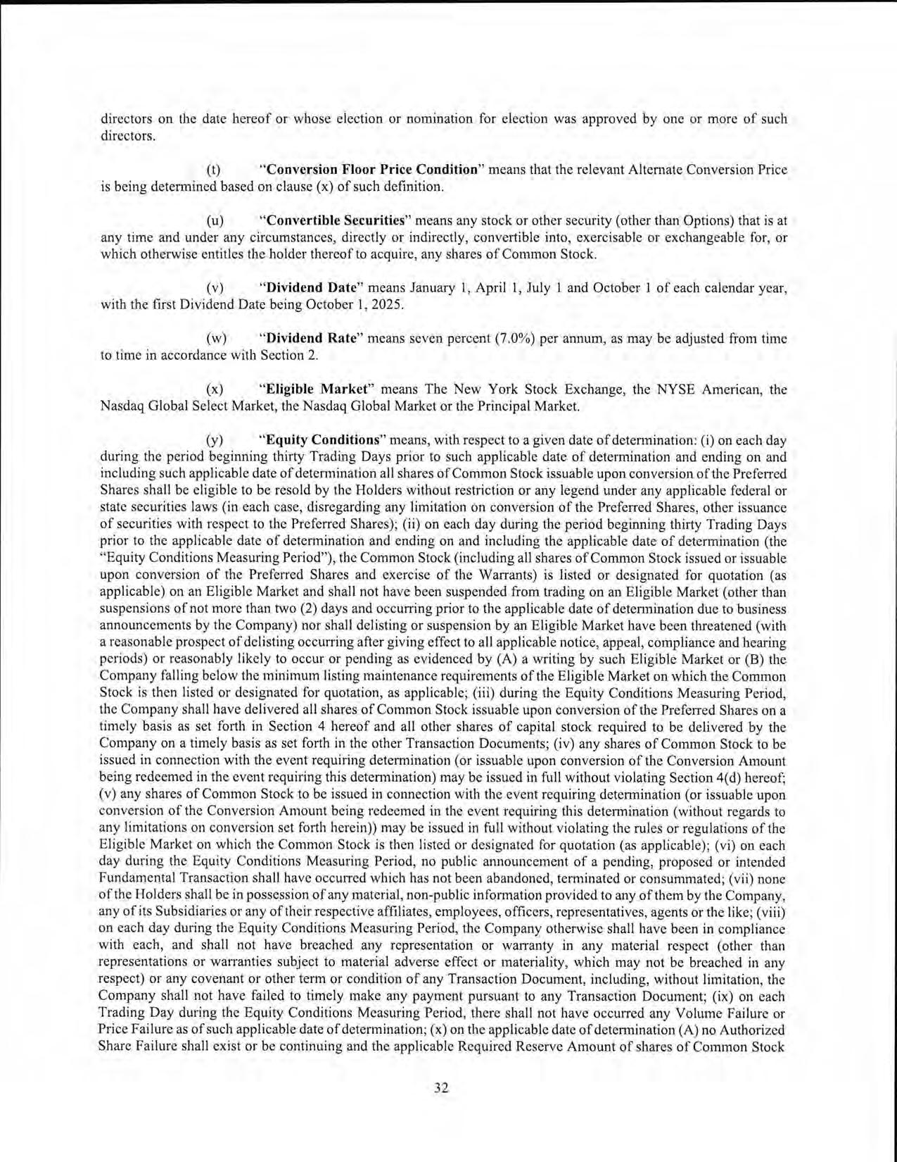 directors on the date hereof or whose election or nomination for e l ection was approved by one or more of such directors . (t) "C on ve r s i o n F l oor Price Co nditi o n ' ' means that the relevant Alternate Conversion Price is being detem 1 ined based on clause (x) of such definition . (u) ''C on ver tibl e Securities" means any stock or other security (other than Options) that is at any time and under any circumstances, directly or indirectly, convertible into, exercisable or exchangeable for, or which otherwise entitles the holder thereof to acquire, any shares of Common Stock . (v) " Di vi d e nd Da t e' ' means January l, April I, July I and October I of each calendar year, with the first Dividend Date being October I , 2025 . (w) ' ' Di vi d e nd Rate" means seven percent ( 7 . 0 % ) per annum, as may be adjusted from time to time in accordance with Section 2 . {x) '' E ligibl e Ma rk e t " means The New York Stock Exchange, the NYSE American, the Nasdaq Global Select Market, the Nasdaq Global Market or the Principal Market. (y) "E qui ty Conditions" means, with respect to a given date of detennination : (i) on each day during the period beginning thirty Trading Days prior to such applicable date of determination and ending on and including such applicable date of detcm 1 ination all shares ofComrnon Stock issuable upon conversion of the Prefe 1 Te<l Shares shall be eligible to be resold by the Holders without restriction or any legend under any applicable federal or state securities laws (in each case, disrega r ding any limitation On conversion of the Preferre<l Shares, o t her issuance of securities with respect to the Preferred Shares) ; (ii) on each day during the period beginning thirty Trading Days prior to the applicable date of detem,ination and ending on and including the applicable date of determination (the "Equity Conditions Measuring Period"), the Common Stock (including all shares of Common Srock issued or issuable upon conversion of the Preferred Shares and exercise of 1 he Warrants) is listed or designated for quotation (as applicable) on an Eligible Market and shall not have been suspended from trading on an Eligible Market (other than suspensions of not more than two ( 2 ) days and occurring prior to the applicable date of determination due to business announcements by the Company) nor shall dclisting or suspension by an Eligible Market have been threatened (with a reasonable prospect of delisting occurring after giving effect to all applicable notice , appeal, compliance and hearing periods) or reasonably likely to occur or pending as evidenced by (A) a writing by such Eligible Market or (B) the Company falling below the minimum listing maintenance requirements of the Eligible Market on which the Common Stock is then listed or designated for quotation, as applicable ; (iii) during the Equity Conditions Measuring Period, the Company shall have delivered all shares of Common Stock issuable upon conversion of the Preferred Shares on a timely basis as set forth in Section 4 hereof and all other shares of capital stock required to be delivered by the Company on a timely basis as set forth in the other Transaction Documents ; (iv) any shares of Common Stock to be issued in connection with the event requiring determination (or issuable upon conversion of the Conversion Amount being redeemed in the event requiring this detennination) may be issued in full without violating Section 4 (d) hereof ; (v) any shares of Common Stock to be issued in connection with the event requiring detennination (or issuable upon conversion of the Conversion Amount being redeemed in the event requiring this determination (without regards to any limitations on conversion set forth herein)) may be issued in full without violating the rules or regulations of the Eligib l e Market on which the Common Stock is then listed or designated for quotation (as applicable) ; (vi) on each day during the Equity Conditions Measuring Period, no public announcement of a pending, proposed or intended Fundamental Transaction shall have occurred which has not been abandoned, te 1111 inated or consummated ; (vii) none of the llolders shall be in possession of any material, non - public information provided to any of them by the Company , any of , its Subsidiaries or any of their respective affiliates, employees, officers, representatives, agents or the like ; (viii) on each day during the Equity Conditions Measuring Period, tl 1 e Company othe r wise shall have been in compliance with each, and shall not have broached any representation or warranty in any material respect (other than representations or warranties subject to material adverse effect or materiality, which may not be breached in any respect) or any covenant or other term or condition of any Transaction Document, including, without limitation , the Company shall not have failed to timely make a 11 y payment pursuant to any Transaction Document ; (ix) on each Trading Day during the Equity Conditions Measuring Period, there shall not have occurred any Volume Failure or Price Failure as of such applicable date of detennination ; (x) on the applicable date of detem 1 ination (A) no Authorize d Share Failure shall exist or be continuing and the applicable Required Reserve Amount of shares of Common Stock 32