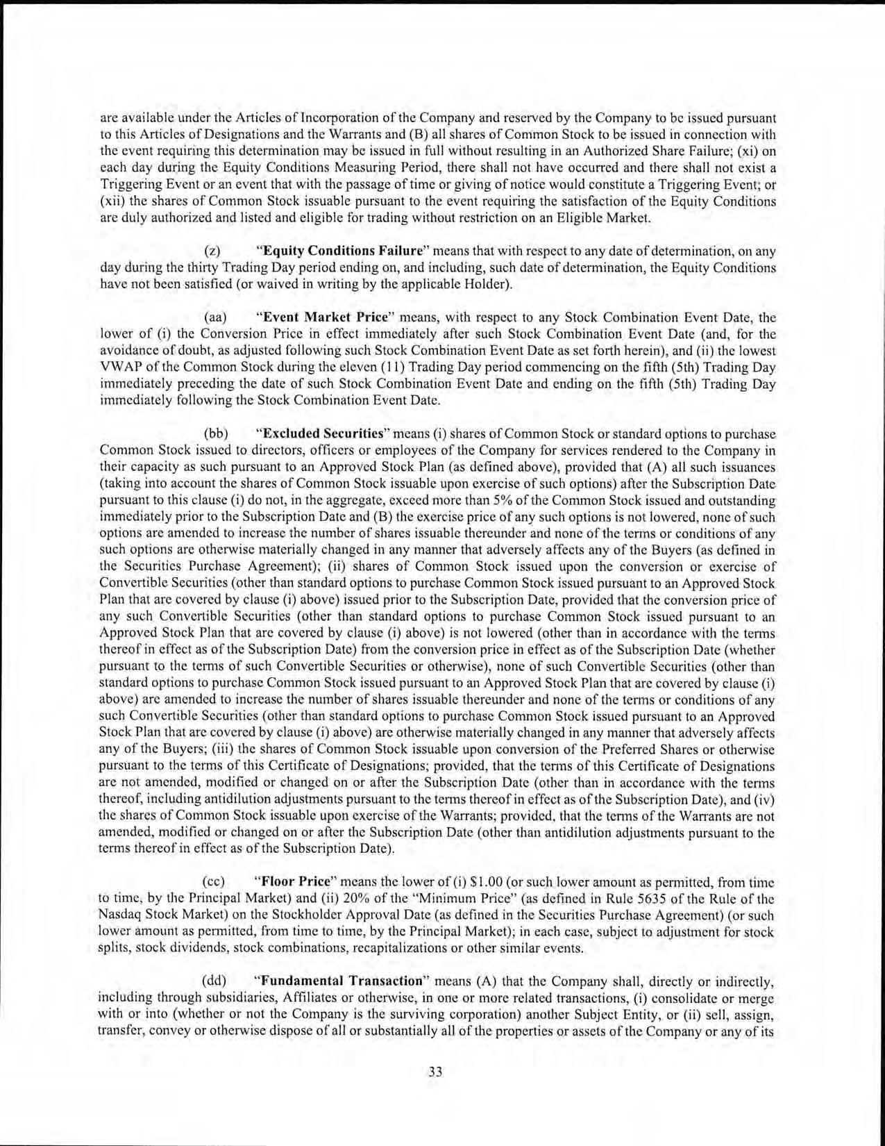 are available under the Articles of Incorporation of the Company and reserved by the Company to be issued pursuant to this Articles of Designations and the Warrants and ( 8 ) all shares of Common Stock to be issued in connection with the event requiring this determination may be issued in full without resulting in an Authorized Share Faj l ure ; (xi) on each day during the Equity Conditions Measuring Period , there shall not have occurred and there shall no t exist a Triggering Event or an event that with the passage of time or giving of notice would c . onstitute a Triggering Event ; or (xii) the shares of Common Stock issuable pursuant to the event requiring the satisfaction of the Equity Conditions are duly authorized and listed and eligible for trading without restriction on an Eligible Market . (z) "Equity Con dition s Failure'' means that with re s pect to any dat e of determination, on any day during the thirty Trading Day period ending on, and including, such date of determination, the Equity Conditions have not been satisfied (or waived in writing by the applicable Holder) . (aa) "Event Market Price" means, with respect to any Stock Combination Event Date , the lower of (i) the Conversion 'rrice in effect immediately after such Stock Combination Event Date (and, for the avoidance of doubt, as adjusted following such Stock Combination Event Date as set forth herein), and (ii) the lowest VW AP of the Common Stock during the eleven (I l) Trading Day period commencing on the fifth ( 5 th) Trading Day immediately preceding the date of such Stock Combination Event Date and ending on the fifth ( 5 t h) Trading Day immediately following the Stock Combination Event Date . (bb) "Ex clud ed Securities " means (i) shares of Common Stock or standard options to pmchase Common Stock issued to directors, officers or employees of the Company for services rendered to the Company in their capacity as such pursuant to an Approved Stock Plan (as defined above ), provided that (A) all such issuances (taking into account the shares of Common Stock issuable upon exercise of such options) after the Subscription Date pursuant to this clause (i) do not , in the aggregate, exceed more than 5 % of the Common Stock issued and outstanding immediately prior to the Subscription Date and (B) the exercise price of any such options is not lowered, none of such options are amended to increa se the number of shares issuable thereunder and none of 1 he terms or conditions of any such options arc otherwise materially changed in any manner that adversely affects any of the Buyers (as defined in the Securities Purchase Agreement) ; (ii) shares of Common Stock issued upon the conversion or exercise of Convertible Securities (other than standard options to purchase Common Stock issued pursuant to an Approved Stock Plan that are covered by clause (i) above) issued prior to the Subscription Date, pro v ided that the convers i on price of any such Convertible Securities (other than standard options to purchase Common Stock issued pursuant to an Approved Stock Plan that arc covered by clause (i) above) is not lowered (other than in accordance with the tenns thereof in effect as of the Subscription Date) from the conversion price in effect as of the Subscription Date (whether pursuant to the terms of such Convertible SectLrities or otherwise), none of such Convertible Securities (other than standard options to purchase Common Stock issued pursuant to an Approved Stock Plan that are covered by clause (i) above) are amended to increase the number of shares issuable thereunder and none of the tenns or conditions of any such Convertible Securities (other than standard options to purchase Common Stock issued pursuant to ao Approved Stock Plan that are covered by clause (i) above) are otherwise materially changed in any manner that adversely affects any of the Buyers ; (iii) the shares of Common Stock issuable upon conversion of the Preferred Shares or otherwise pursuant to the terms of this Certificate of Designations ; prov i ded, that the tcnns of this Certificate of Designations are not amended, modified or changed on or after the Subscription Date (o ther than in accordance with the terms thereof , including antidilution adjustments pursuant to t he tenns thereof in effect as of the Subscription Date) , and (iv) the shares of Common Stock issuable upou exercise of the Warrants ; provided, that the tcnns of the Warrants are not amended, modified or changed on or after the Subscription Date (other than antidilution adjustments pursuant to the terms thereof in effect as of the Subseliption Date) . (cc) " Floor Price" means the lower of (i) $ 1 . 00 (or s \ 1 ch lower amount as pem 1 itted , from tim e to time , by the Principal Market) and (ii) 20 % of the "Minimum Price" (as defined in Rule 5635 of the Rule of the Nasdaq Stock Market) on the Stockholder Approval Date (as d efined in the Securities Purchase Agrec 1 ) 1 ent) (or such lower amount as pennined , from time to time, by the Principal Market) ; in each case, subject to adjustment for stock splits, stock dividends , stock combi . oations, recapitalizations or other similar events . (dd) ' ' F und ame nt al Transaction " means (A) that the Company shall, directly or indirectly , including through subsidiaries, Affiliates or otherwise, in one or more related transactions , (i) consolidate or merge with or into (whether or not the Company is the surviving corporation) another Subject Entity , or (ii) sell, assign, transfer, convey or otherwise dispose of all or substantially all of the properties or assets of the Company or any of its 33