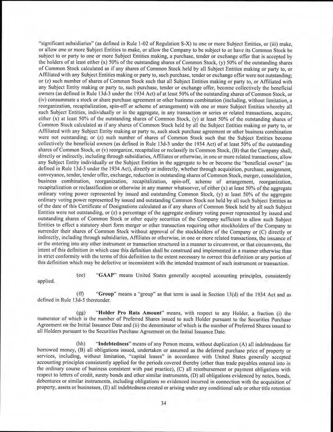 "significant subsidiaries" (as defined in Rule 1 - 02 of Regulation S - X) to one or more Subject Entities, or (iii) make, or allow one or more Subject Entities to make, or allow the Company to be subject to or have its Common Stock be subject to or party to one or more Subject Entities making, a purchase, t ender or exchange offer that is accepted by the holders of a t least either (x) 50 % of the outstanding shares of Common Stock, (y) 50 % of the outstanding shares of Common Stock calculated as if any shares of Common Stock held by all Subject Entities making or party to, or Affiliated with any Subject Entities making or party to, such purchase, tender or exchange offer were not outstanding ; or (z) such number of shares of Common Stock such that all Subject Entities making or party to, or Affiliated with any Subject Entity making or party to, such purchase , tender or exchange offer, become collectively the beneficial owners (as defined in Rule 13 d - 3 under the I 934 Act) of at least 50 % of the outstanding shares of Common Stock, or (iv) consummate a stock or share purchase agreement or other business combination (including, without limitation , a reorganization, recapitalization, spin - off or scheme of arrangement) with one or more Subject Entities whereby all such Subject Entities, individually or in the aggregate, in any transaction or series or related transactions, acquire, either (x) at least 50 % of the outstanding shares of Common Stock, (y) at least 50 % of the outstanding shares of Common Stock ca l c ula t ed as if any shares of Common Stock held by all the Subject Entities making or party to, or Affiliated with any Subject Entity making or party to, such stock purchase agreement or other business combination were not outstanding ; or (z) such number of shares of Common Stock such that the Subject Entities become collectively the beneficial owners (as defined in Rule l 3 d - 3 under the 1934 Act) of at least 50 % of the outstanding shares of Common Stock, or (v) reorganize, recapitalize or reclassify its Common Stock, (B) that the Company shall, directly or indirectly, including through subsidiaries, Affiliates or otherwise, in on e or more related transactions, allow any Subject Entity individually or the Subject Entities in the aggregate to be o r become the "beneficial owner" (as defined in Rule l 3 d - 3 under the t 934 Act), directly or indirectly, whethe r through acquisition, purchase, assignment, conveyance, tender, tender offer, exchange, reduction in outstanding shares of Common Stock, merger, cor 1 solidation, business combination, reorganization, recapitalization, spin - off, scheme of arrangement, reorganization, recapitalization or reclassification or otherwise in any manner whatsoever, of either (x) at l east 50 % of the aggregate ordinary voting power represented by issued and outstanding Common Stock, (y) at least 50 % of the aggregate ordinary voting power represented by issued and outstanding Common Stock not held by aJl such Subject Entities as of the date of this Certificate of Designations calculated as if any shares of Common Stock beld by all such Subject Entities were not outstanding, or (z) a percentage of the aggregate ordinary voting power represented by issued and outstanding shares of Common Stock or other equity securities of the Company sufficient to allow such Subject Entities to effect a statutory short form merger or other transaction requiring other stockholders of the Company to surrender their shares of Common Stock without approval of the stockholders of the Company or (C) directly or indirectly, including through subsidiaries, Affiliates or otherwise, in one or more related transactions, the issuance of or the entering into any other instrument or transaction structured iu a manner to circumvent, or that circumvents, the intent of this definition in which case this definition shall be construed and implemented in a manner otherwise than in strict conformity with the terms of this definition to the extent necessary to correct this definition or any ponion of this definition which may be defective or inconsistent with the intended treatment of such instrument or transaction . (ce) "GAAP" means United States generally accepted accounting principles, consistently applied. (ff) "G rou p" means a ' • group" as that term is used in Section 13 (d) of the 1934 Act and as defined in Rule I 3 d - 5 thereunder . (gg) " H o ld er Pro Rata Amount" means, with respect to any Holder, a fraction (i) the numerator of which is the number of Prcfc 1 Ted Shares issued to such Holder pursuant to the Securities Purchase Agreement on the Initial Issuance Date and (ii) the denominator of whic . h is the number of Preferred Shares issued t o all Holders pursuant to the Securities Purchase Agreement on the Initial Issuance Date . (hh) " Ind e b te d ness " means of any Person means, without duplication (A) all indebtedness for borrowed money, (B) all obligations issued, undertaken or assumed as the deferred purchase price of property or services, including, without limitation, "capital leases" in accordance with United States generally accepted accounting principles consistently applied for the periods covered thereby (orher than trade payables entered into in the ordinary course of business consistent with past practice), (C) all reimbursement or payment obligations with respect to letters of credit, surety bonds and other similar instrnmcnts, (D) all obligations evidenced by notes, bonds, debentures or similar in s truments , including obligations so evidenced incu 1 Ted in connection with the acquisition of property, assets or businesses, (E) all indebtedness created or arising under any conditional sale or other t i tle retention 34