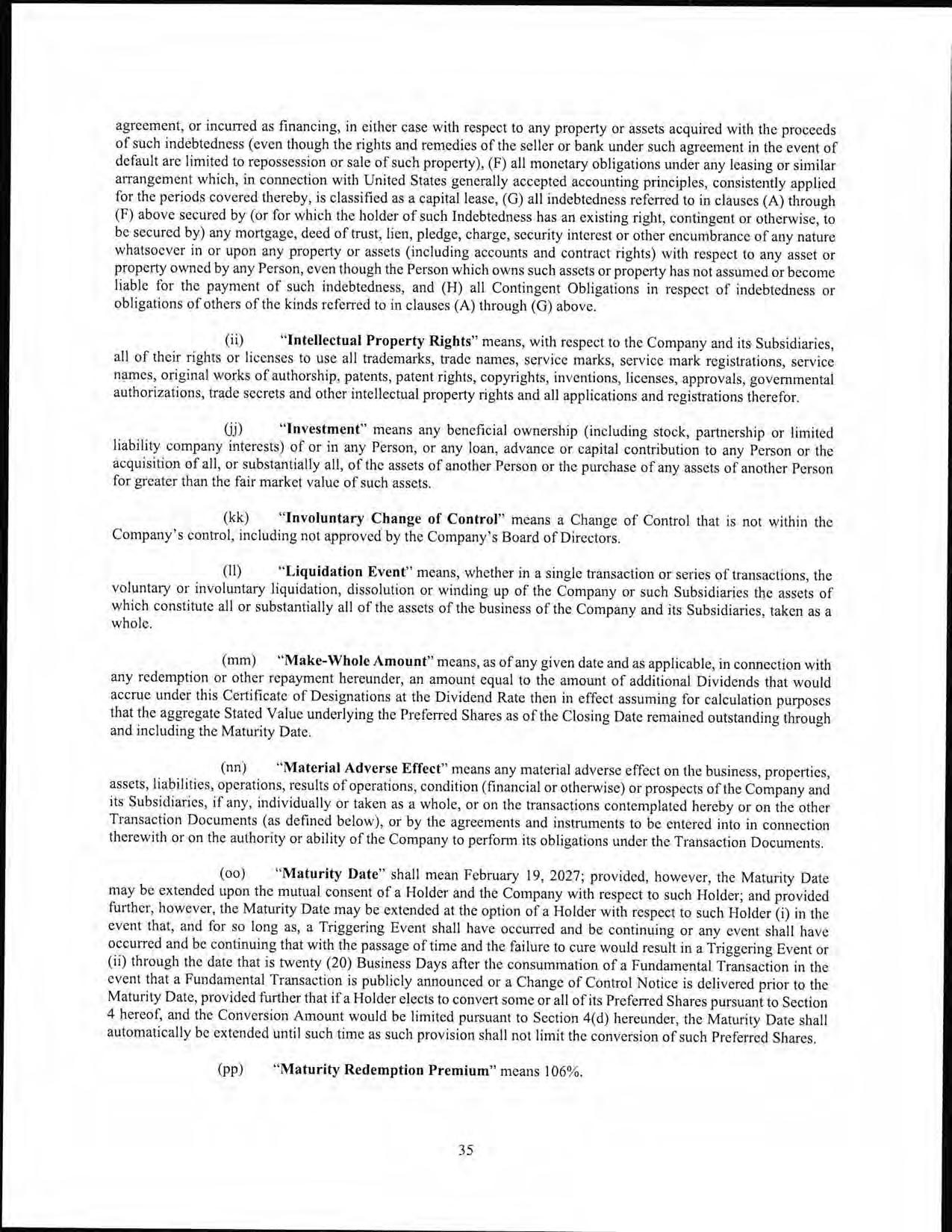 agreement, or incurred as financing, in either case with respect to any property or assets acquired with the proceeds of such indebtedness (even though the rights and remedies of the seller o r bank under such agreement in the event of default arc limited to repossession or sale of such property ), (F) all monetary obligations under any lea s ing or similar a 1 Tangemcnt which, in connection with United States generally accepted accounting p r inciples , consistently applied for the periods covered thereby, is classified as a capital lease , (G) all indebtedness referred to in clauses (A) through (F) above secured by (or for which the holder of such Indebtedness has an existing right , contingent or otherwise, to be secured by) any mortgage, deed of trust , lien, pledge, charge, security interest or other encumbrance of any nature whatsoever in or upon any property or assets (including accounts and contract rights) with respect to any asset or property owned by any Person , even though the Person which owns such assets or property has not assumed or become liable for the payment of such indebtedness, and (H) all Contingent Obligations in respect of indebtedness or obligations ofothers of the kinds referred to in clauses (A) through (G) above . (ii) " Int e ll ect ual Property R ig ht s " means, with respect to the Company and its Subsidiaries, all of their rights or licenses to use all trademarks, trade names , service marks . service mark registrations, service names, original works of authorship , patents, patent rights, copyrights, inventions , licenses , approvals, governmental authorizations, trade secrets and other intellectual property rights and all applications and registrations therefor . (jj) " ln vest m e nt " means any beneficial ownership (includiug stock, partnership or limited liability company interests) of or in any Person , or any loan , advance or capital contribution to any Person or the acquisition of all, or substantially all , of the assets of another Person or the purchase of any assets of another Person for greater than the fair market value of such assets . (kk) " In vo lunt ary C h a n ge of Control'' means a Change of Control that is not within the Company's control, including not approved by the Company's Board of Directors . ( 11 ) " Liq u id a ti o n E ve nt " means, whether in a single transaction or series of transactions, the voluntary or involuntary liquidation , dissolution or winding up of the Company or such Subsidiaries the assets of which constitute all or substantially all of the assets of the business of the Company and its Subsidiaries, taken as a whol e . (mm) "Make - Whole Amount" means , as of any given date and as applicable , i n connection with any redemption or other repayment hereunder , an amount equal to the amount of additional Dividends that would accrue under this Certificate of Designations at the Dividend Rate then in effect assuming for calculation purposes U 1 at the aggregate Stated Value underlying the Preferred Shares as of t he Closing Date remained outstanding through and including the Maturity Date . (nn) "Mate ri a l Adverse Effec t " means any material adverse effect on the business , properties, assets, liabilities , operations, results of operations , condition ( financial or otherwise) or prospects of the Company and its Subsidiaries, if any, individually or taken as a whole , or on the transactions contemplated hereby or on the other Transaction Documents (as defined below) , or by the agreements and instruments to be entered into in connection therewith or on the authority or ability of the Company to perfonn its obligations under the Transaction Documents . (oo) " Ma turi ty Date" shall mean February 19 , 2027 ; provided, however, the Maturity Date may be extended upon the mutual consent of a Holder and the Company with respect to such Holder ; and provided further , however , the Maturity Date may be extended at the option of a Holder with respect to such Holder (i) in the event that , and for so long as, a Triggering Event shall have occurred and be continuing or any event shall have occurred and be contfouing that with the passage of rime and the failure to cure would result in a Triggering Event or (ii) through the date that is twenty ( 20 ) Business Days after the consummation of a Fundamental Transaction in the event that a Fundamental Transaction is publicly announced or a Change of Control Notice is delivered prior to the Maturity Date, provided further that if a Holder elects to convert some or all of its Preferred Shares pursuant to Sec t ion 4 hereof, and the Conversion Amount would be limited pursuant to Section 4 (d) hereunder, the Maturity Date shall automatically be extended until such time as such provision shall not limit the conversion of such Preferred Shares . (pp) ' ' Ma turi ty Redemption P r e mium " means I 06%. 35