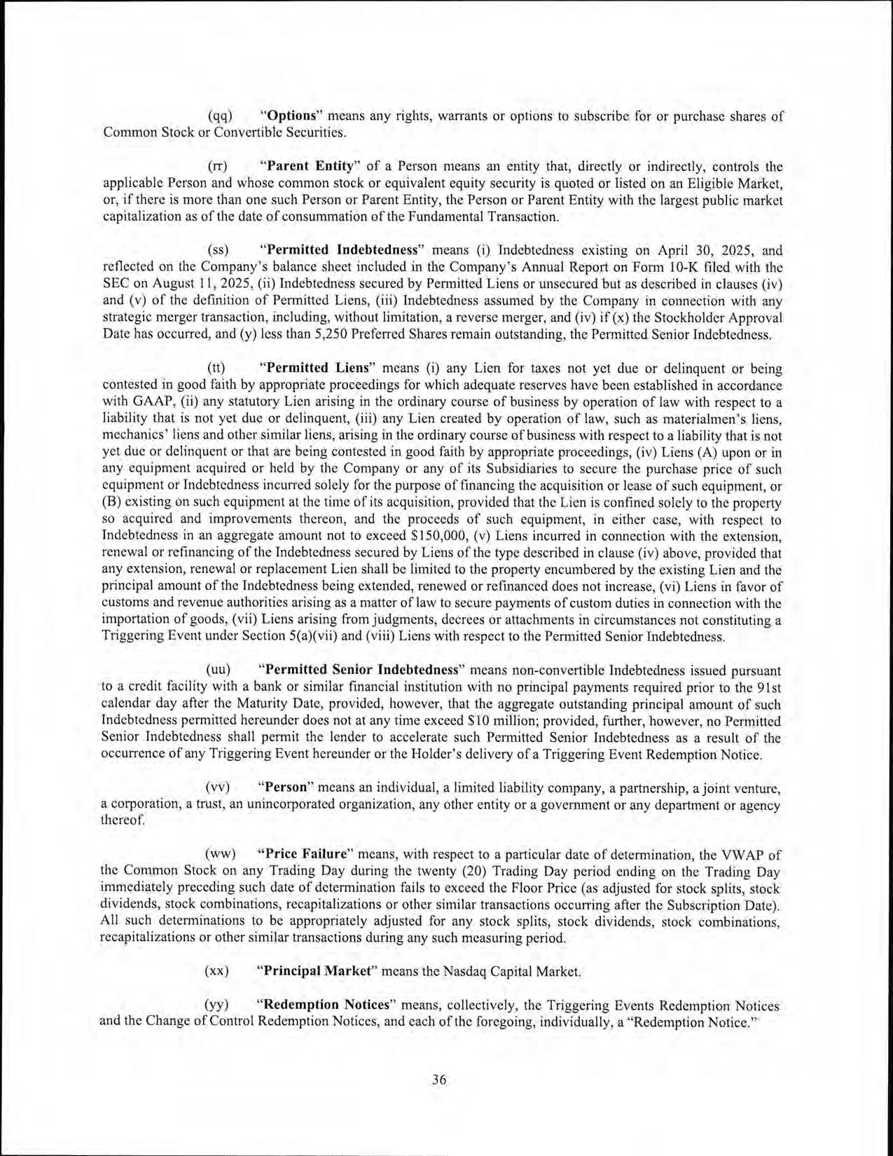 (qq) " Option s" means any rights, warrants or options to subscribe for or purchase shares of Common Stock or Convertible Securities . (rr) " Par e n t Entity" of a Person means an entity that, directly or indirectly, controls the applicable P erson and whose common stock or equivalent equity security is quoted or listed on an Eligible Market, or, if there is more than one such Person or Parent Entity, the Person or Parent Entity with the largest public market capitalization as of the date of consummation of the Fundamental Transaction . (ss) " Permitt e d Ind e bt e dn ess " means (i) Tndcbtedness ex 1 stmg on April 30 , 2025 , and reflected on lhe Company's balance sheet included in t he Company's Annual Repo 1 i on Fotm 10 - K filed with the SEC on August 1 1 , 2025 , (ii) Indebtedness secured by Permitte<l Liens or unsecured but as described in clauses (iv) and (v) of the definition of Permitted Liens, (iii) Indebtedness assumed by the Company in connection with any strategic merger transaction, including, without limitation, a reverse merger, and (iv) if(x) the Stockholder Approval Date haS occurred, and (y) less than 5 , 250 P referred Shares remain outstanding, the Permitted Senior Indebtedness . (tt) " Permitt e d Liens" means (i) any Lien for taxes not yet due or delinquent or being contested in good faith by appropriate proceedings for which adequate reserves have been established in accordance with GAAP, (ii) any statutory Lien arising in the ordinary course of business by operation of law with respect to a liability that is not yet due or delinquent, (iii) any Lien created by operation of law, such as materialmen·s liens, mechanics' liens and other similar l iens , arising in the ordinary course of business wit h respect t o a liability that is not yet due or delinquent or that are being contested in goo<l faith by appropriate proceedings, (iv) Liens (A) upon or in any equipment acquired or held by the Company or any of its Subsidiaries to secure the purchase price of such equipment or Tndcbtedness incurred solely for the purpose of financing the acquisition or lease of such equipment, o r ( 8 ) existing on such equipment al the time of its acquisition, provided that the Lien is confined solely to the property so acquired and improvemen t s thereon, and the proceeds of such equipment, in either case, with r espect to Indebtedness in an aggregate amount not to exceed $ 150 , 000 , (v) Liens incurred in connection with the extension, renewa l or refinancing of the Indebtedness secured by Liens of the type described in clause (iv) above, provided that any extension, renewa . l or replacement Lien sha ll be limited lo the property encumbered by the existing Lien and the principal amount of the Indebtedness being extended, renewed or refmanced does not increase, (vi) L iens in favor of customs and revenue authorities arising as a matter of law to secure payments of custom duties in connection wi t h the importation of goods, (vii) Liens arising from judgments, decrees or attachments in circumstances not constituting a Triggering Even t under Section 5 (a)(vii) and (viii) Lieus with respect to the Pennitted Senior Indebtedness . (uu) ' ' P e rmitt e d Senior Ind e bt e dn ess " means non - convertible Indebtedness issued pursuant to a credit facility with a bank or similar financial institution with no principal payments required prior to the 91 st calendar day after the Maturity Date, provided, however, that the aggregate outstanding principal amount of such Indebtedness pem 1 itted hereunder does not at any rime exceed $ 10 million ; provided, further, however, no Permitted Senior Indebtedness shall pennit the lender to accelerate such Permitted Senior Indebtedness as a result of the occurrence of any Triggering Event hereunder or the H o l der's delivery of a Triggering Event Redemption Notice . (vv) " Pe r s on " means an individual, a limited liability company, a partnership, a joint venture, a corporation, a trust, an unincorporated organization, any other entity or a government or any department o r agency thereof . (ww) " Pri ce Failure" means, with respect to a panieular date of determination, the VWAP of the Common Stock on any Trading Day during the twenty ( 20 ) Trading Day period ending on the T rading Day immediately preceding such date of determination fails to exceed the Floor Price (as adjusted for stock splits, stock dividends, stock combinations, recapitalizations or other similar transactions occun·ing after the Subscription Date) . All such detem 1 inations to be appropriately adjusted for any stock splits, s t ock dividends, stock combinations, recapitalizations or other si m i l ar transactions during any such measuring period . (xx) " Princip a l M a rke t " means the Nasdaq Capita l Market. (yy) " R e d e mption Notices" means, collectively, the Triggering Events Redemption Notices and the Change of Control Redemption Notices, and each of the foregoing, individually , a "Redemption Notice . " 36