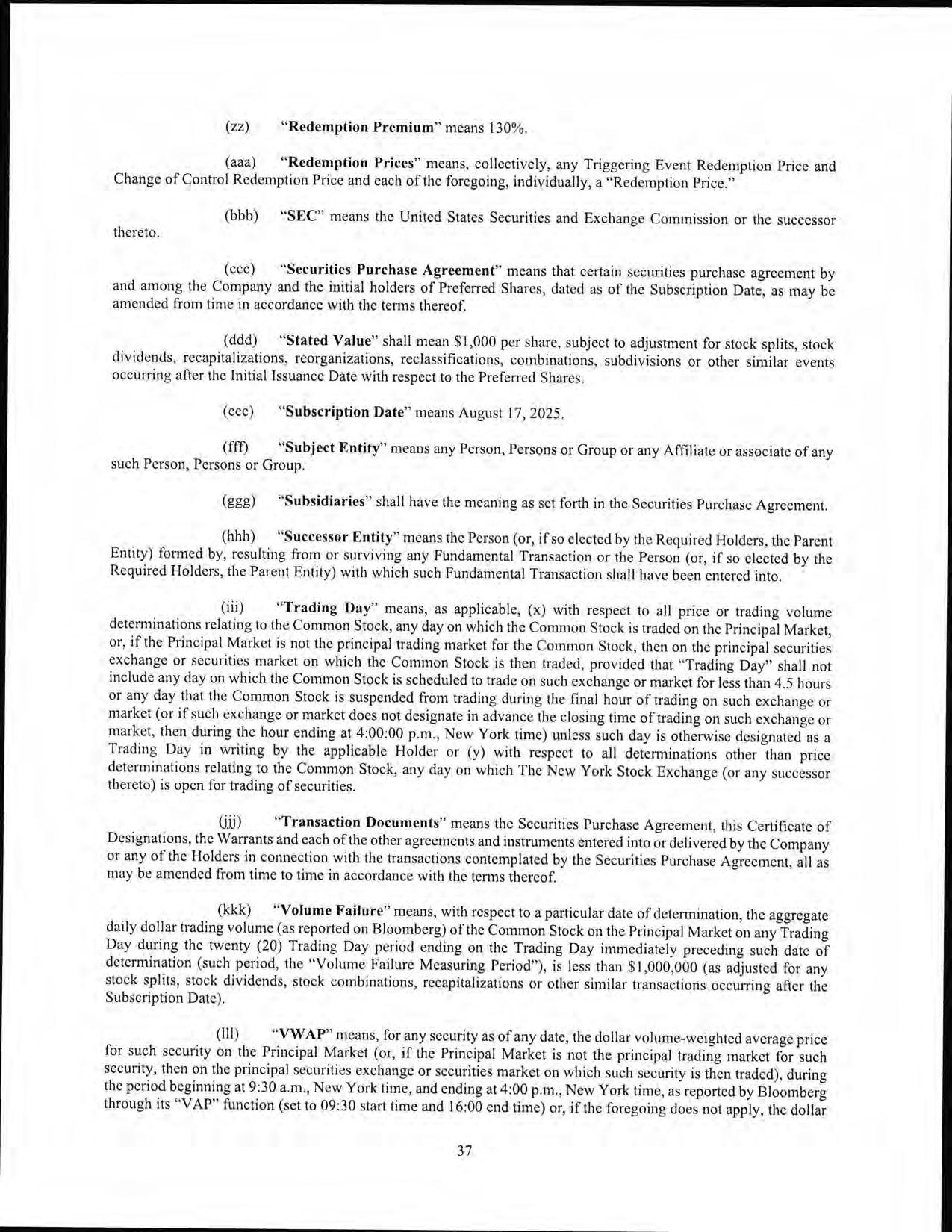 (zz) 37 " Re d e mpt io n Pr e mi um " means 130%. (aaa) " R e d e mpti o n Pri ce s" means, collectively, any Triggering Event Redemption Price and Change of Control Redemption Price and each of the foregoing, individually, a '' Redemption Price . " (bbb) "SEC" means the United States Securities and Exchange Co mmission or the successor thereto. (ccc) '' Secur it i es Purchase Agreement'' means that certain securities purchase agreement by and among the Company and the initial holders of Preferred Shares, dated as of the Subscription Date, as may be amended from time in accordance with the terms thereof . (ddd) " S t a t e d Va lu e " shall mean S 1 , 000 per share, subject 10 adjustment for stock splits, stock dividends, recapitalizations, reorganizations, reclassifications, combinations, subdivisions or other similar events occurring after the Initial Issuance Date with respect to the Preferred Shares . (eec) "S ubsc ri ptio n D a t e " means August 17, 2025 . (fff) " S u bjec t E nti ty " means any Person, Persons or Group or any Affiliate or associate of any such Person , Persons or Group . (ggg) " Su b s i d i ar i es" shall have the meaning as set fonh in the Securities Pur chase Agreement. (hhh) " S u ccessor Entity'' means the Person (or, ifso elec t ed by the Required Holders, the Parent Entity) formed by, resulting from or surviving any Fundamental Transaction or the Person (or, if so elected by the Required Holders, the Parent Entity) with which such Fundamental Transaction shall have been e ntered into . (iii) " T r a din g Day" means , as applicable, (x) with respect lo all price or trading volume detcm 1 ina 1 ions relating to the Common Stock, any dayon which the Common Stock is traded on the Principal Market, or, if the Prin cipal Market is not the principal trading market for the Common Stock, then on the principal securities exchange or securities market on which the Commo n Stock is then trad ed, provided that 'Tradi ng Day" shall not include any day on which the Common Stock is sc heduled to trade on such exchange or market for less than 4 . 5 hours or any day that the Common Stock is suspended from trading during the final hour of trading on s uch exchange or market (or if such exchange or market docs not designate in advance the closing time of trading on such exchange or market, then during the hour ending at 4 : 00 : 00 p . m . , 1 ew York llme) unless such day is otherwise designated as a Trading Day in writing by the applicable Holder or (y) with respe c t to all detenninations other than price detem,inations relating to the Common Stock , any day on which The New York Stock Exchange (or any successor thereto) is open fo r trading of securities . (jjj) " Tra n sac t ion Docum e n ts " means the Securities Purchase Agreement, this Certificate of Designations, the Warrants and each of the other agreements and instrume 11 ts entered into or delivered by the Company or any of the Holders in con nection with the transactions contemplated by the Securities Purchase Agreement , all as may be amended from time to time in accordance with tbc tenns thereof . (kkk) '' V o lum e Failure" means, with respect to a particular date of determination, the aggregate daily dollar trading volume (as reported on Bloomberg) of the Common Stock on the Principal Market on any Trading Day during the twenty ( 20 ) Trading Day period ending on the Trading Day immediately preceding such date of determination (such period , the "Volume Failure Measuring Period"), is less than $ 1 , 000 , 000 (as adjusted for any stock splits, stock dividends, stock combinations, recapitalizations or other similar transactions occurring after the Subseription Date) . (Ill) " VWAP " means, for any security as of any date , the dollar volume - weighted average price for such security on the Principal Market (or, if the Principal Market is not the principal trading market for such security, then on the principal securities exchange or securities market on which such security is then traded) . during the period beginning at 9 : 30 a . m . , New York time, and ending at 4 : 00 p . m . , New York time , as reported by Bloomberg through its '"VA P'' function (set to 09 : 30 start time and 16 : 00 end time) or, if the foregoing does not apply, the dollar