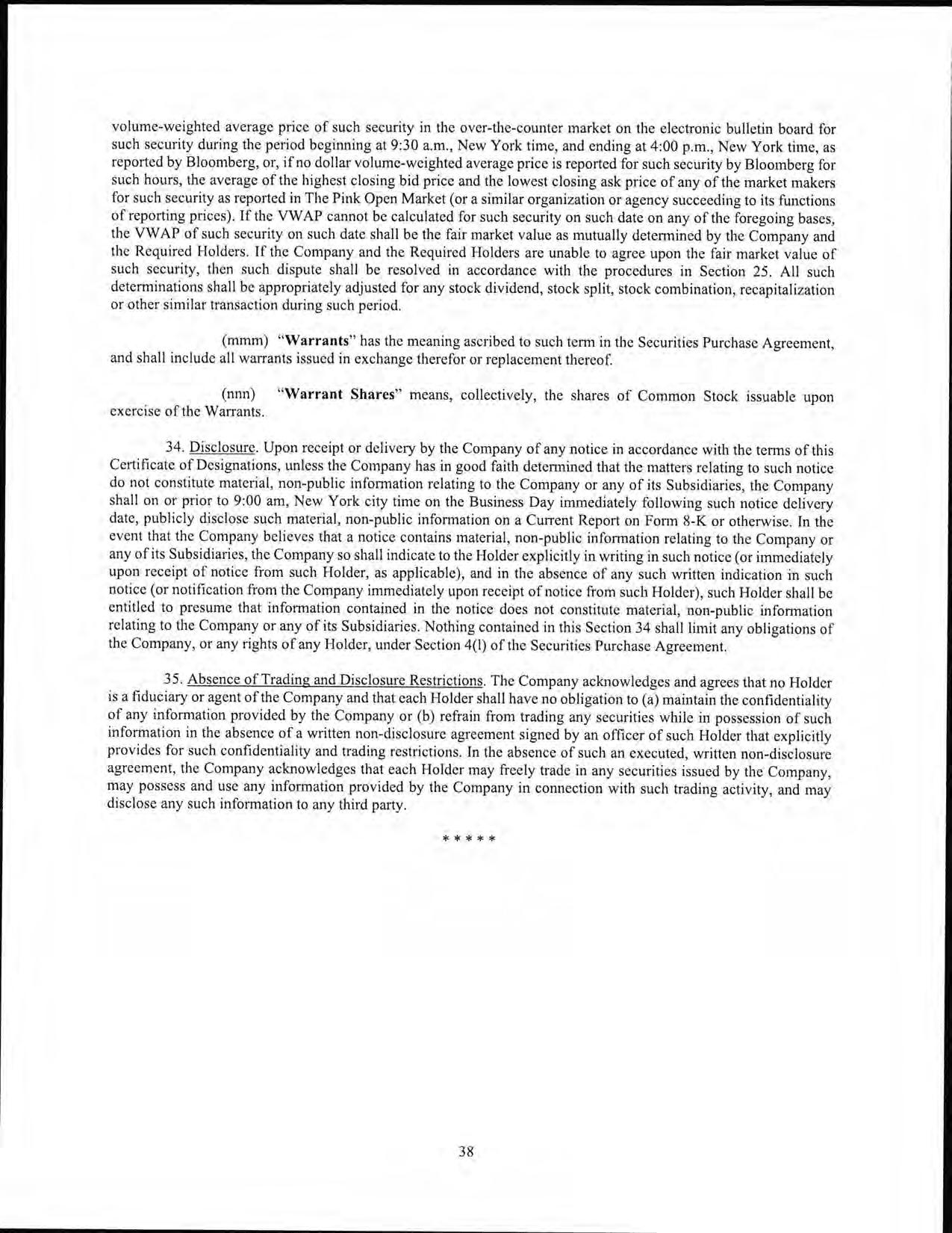 volume - weighted average pric - c of such security in the over - the - counter market on the electronic bulletin board for such security during the period beginning at 9 : 30 a . m . , New York time, and ending at 4 : 00 p . m . , New York time, as reported by Bloomberg, or, ifno dollar volume - weighted average price is reported for such security by Bloomberg for such hours, the average of the highest closing bid price and the lowest closing ask price of any of the market makers for such security as repo 11 ed in The Pink Open Market (or a similar organization or agency succeeding to its functions of reporting prices) . If the VW AP cannot be calculated for such security on such date on any of the foregoing bases, the VWAP of such security on such date shall be the fair market value as mutually detennined by the Company and the Required Holders . Tf the Company and the Required Holders are unable to agree upon the fair market value of such security, then such dispute shall be resolved in accordance with the procedures in Section 25 . AU such determinations shall be appropriately adjusted for any stock dividend, stock split, stock combination, recapitalization or other similar transaction during such period . (mmm) "Wa rr a nt s" has the meaning ascribed tosuch tem1 in the Securities Purchase Agreement, and shall include all warrants issued in exchange therefor or replacement thereof. (nnn) "Warr a nt Shares" means, collectively, the shares of Common Stock issuable upon exercise of the Warrants. 34. Disclosure . Upon receipt or delivery by the Company of any notice in accordance \ yjth the terms of this Certificate of Designations, unless the Company has in good faith detcnnined that the matters relating to such notice do not constitute material, non - public infonnation relating to the Company or any of its Subsidiaries, the Company shall on or prior to 9 : 00 am, New York city time on the Business Day immediately following such notice delivery date, publicly disclose such material , non - public infom 1 ation on a Current Report on Form 8 - K or otherwise . !n the event that the Company believes that a notice contains material , non - public infonnation relating to the Company or any of its Subsidiaries, the Company so shall indicate to the Holder explicitly in writing in such notice (or immediately upon receipt of notice from such Holder, as app l icab l e ) , and in the absence of any such written indication rn such notice (or notification from the Company immediately upon receipt of notice from such Holder) , such Holder shall be entitled to presume that information contained in the notice does not constitute material, non - publi c information relating to the Company or any of its Subsidiaries . Nothing contained in this Section 34 shall limit any obligations of the Company, or any rights of any Holder , under Section 4 ( 1 ) of the Securities Purchase Agreement . 35. Absence of Trading and Disclosw·e Restrictions . The Company acknowledges and agrees that no Holder is a fiduciary or agent of the Company and that each Holder shall have no obligation to (a) maintain the confidentiality of an y - information provided by the Company or (b) refrain from trading any securities while in possession of such information in the absence of a written non - disclosure agreement signed by an officer of such Holder that explicitly provides for such confidentiality and trading restrictions . In the absence of such an executed, written non - disclosure agreement, the Company acknowledges that each Holder may freely trade in any securities issued by the Company, may possess and use any information provided by the Company in connection with such trading activity, and may disclose any such information to any third party . ***** 38